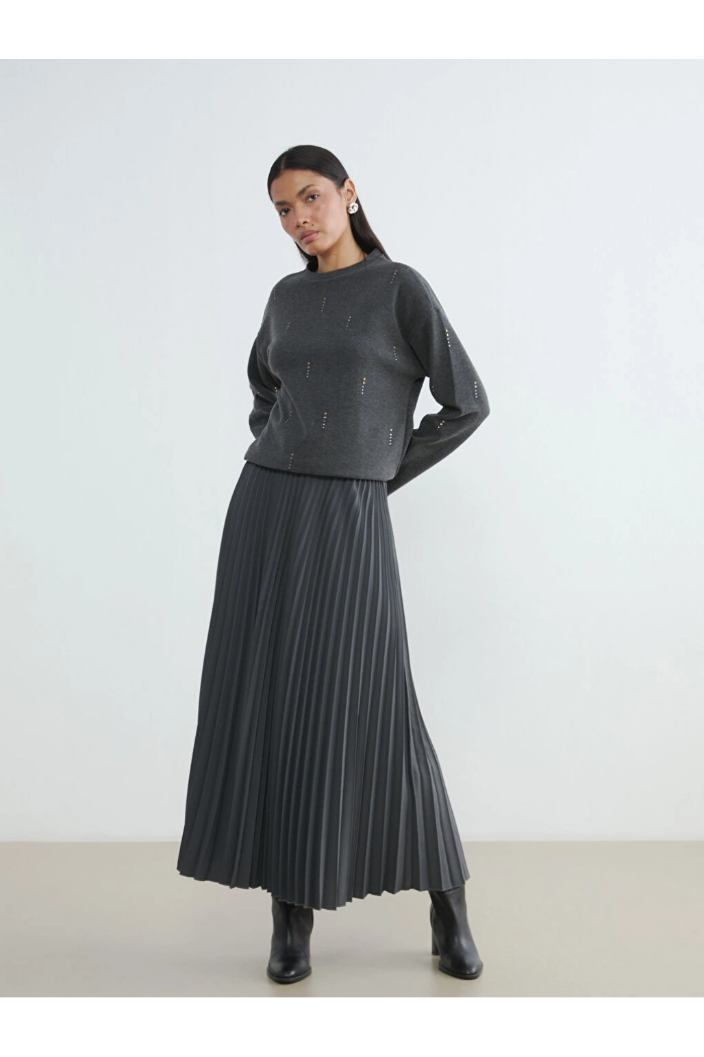 Stil ÖnerisiMini etek, balıkçı yaka bir bluz ve topuklu ayakkabılarla kombinlendiğinde sofistike ve şık bir görünüm elde etmenize yardımcı olur. Soğuk havalarda trençkot veya blazer ceketle tamamlanarak ofis şıklığını yakalayabilirsiniz. Günlük kullanım için ise basic bir tişört ve beyaz spor ayakkabılarla kombinleyerek daha rahat ve casual bir tarz yaratabilirsiniz. Minimal takılar ve bir el çantası ile görünümünüzü tamamlayabilirsiniz.