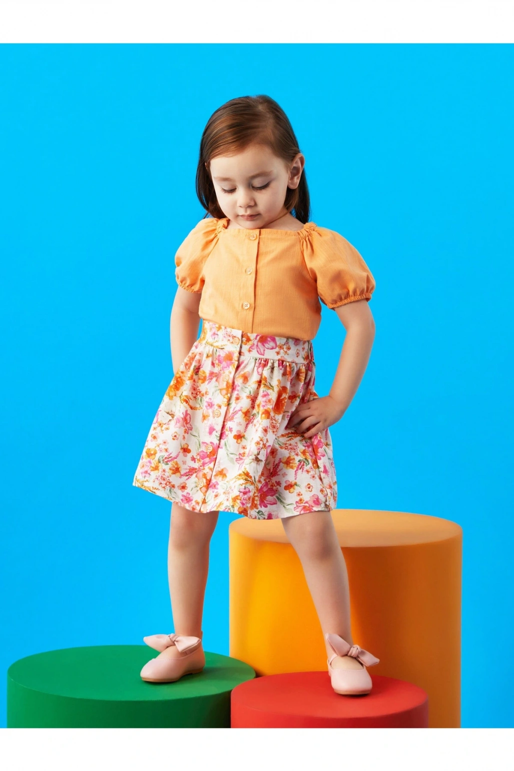 Kare Yaka Kısa Kollu Kız Bebek Gömlek Ve Etek 2'li Takım