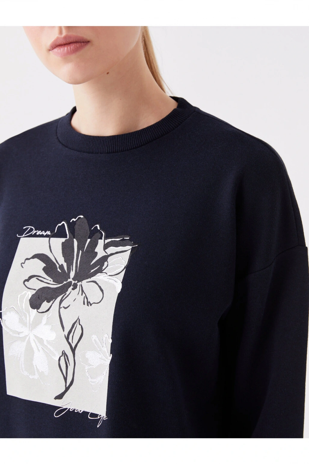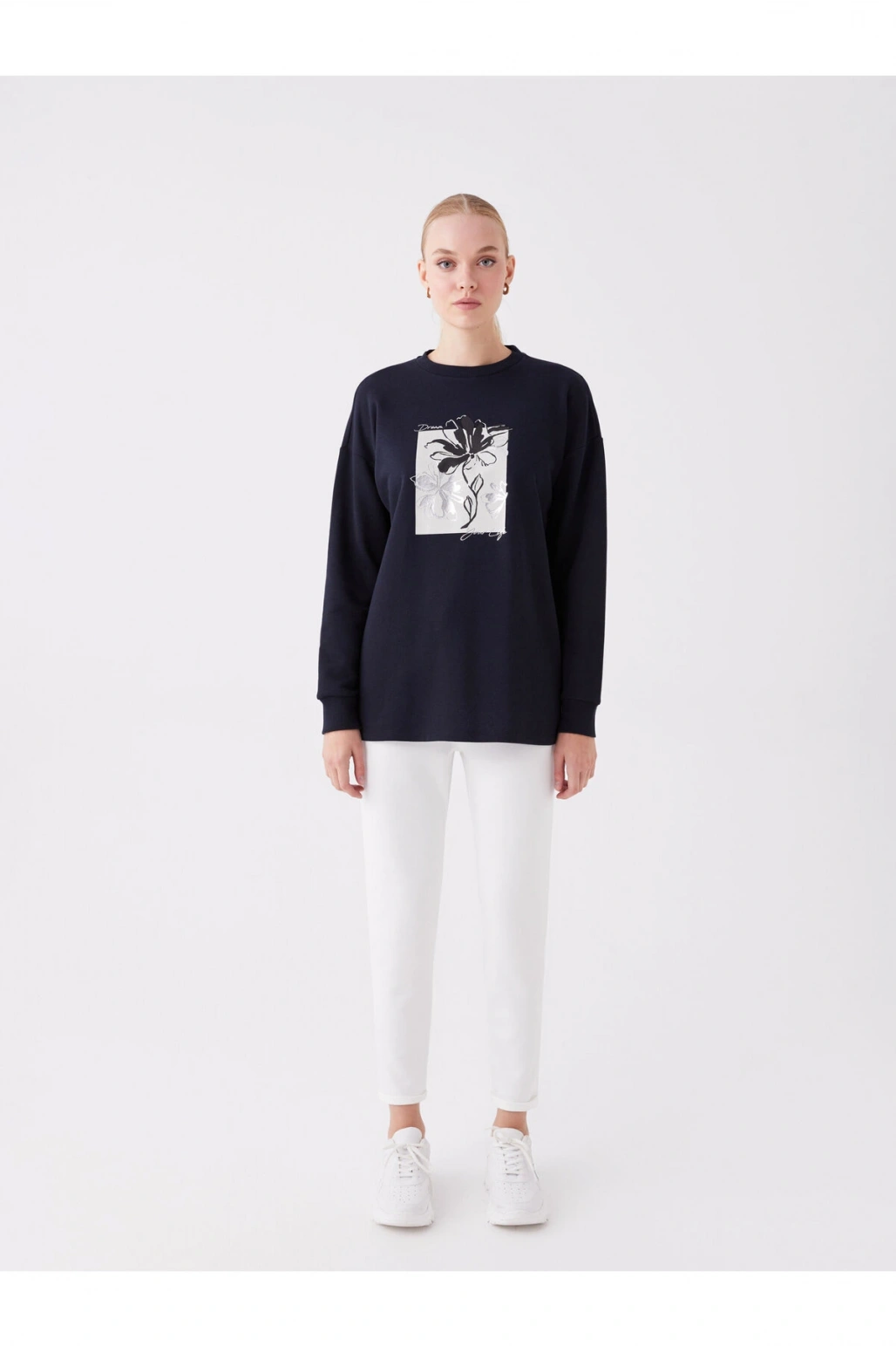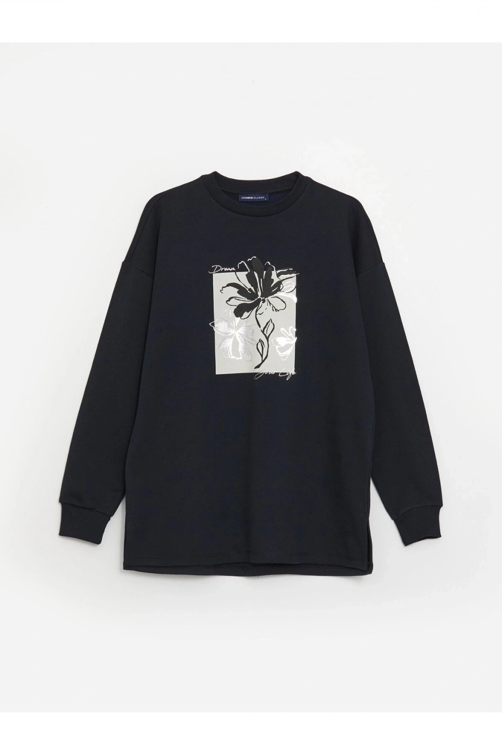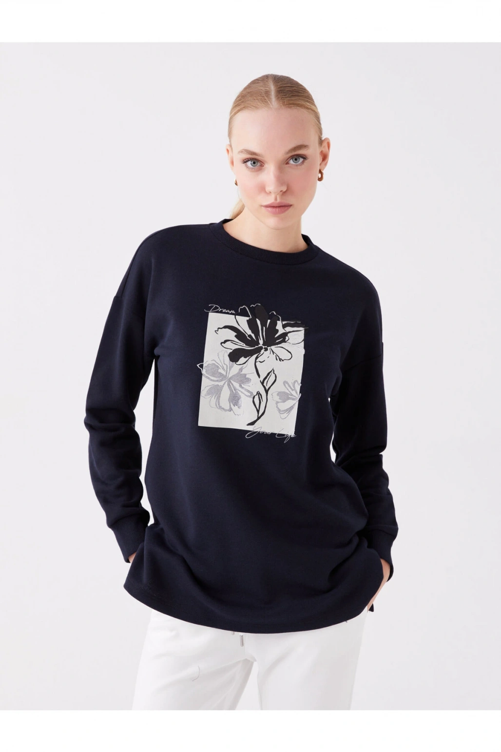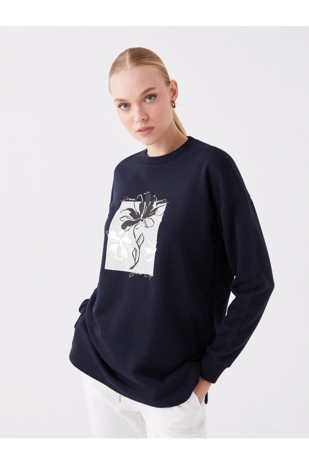 Bisiklet Yaka Baskılı Uzun Kollu Oversize Kadın Sweatshirt Tunik