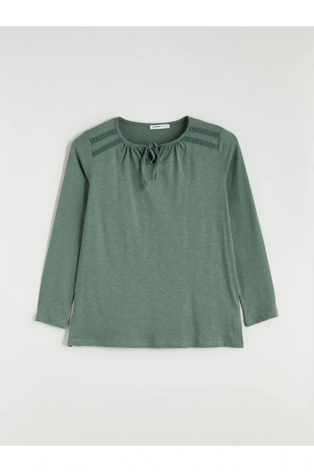 Bağlamalı yaka uzun kollu bluz, %100 pamuklu süprem kumaştan üretilmiştir.; Omuzları dantel detaylı ve yanları yırtmaçlıdır.