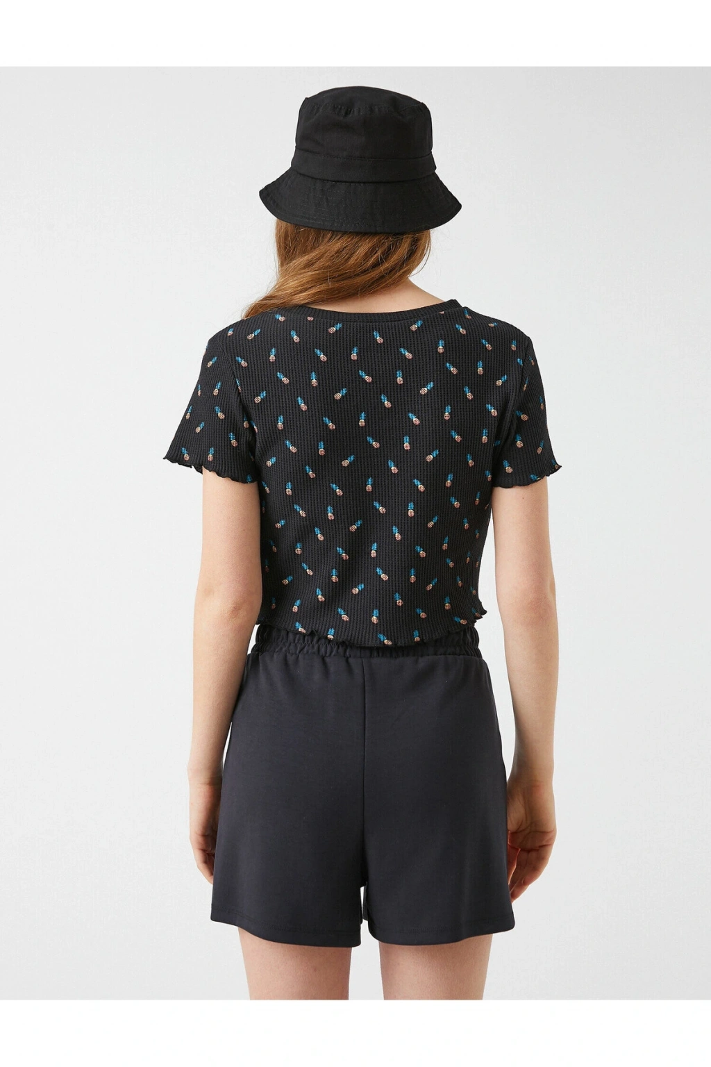 Fırfır detaylı, bisiklet yaka, kısa kollu, baskılı crop tişört.; | Model Boy: 175 | Model Kalça: 90 | Model Üst: 62 | Model Bel: S | Model Göğüs: 81 | Model Jean: 27/32