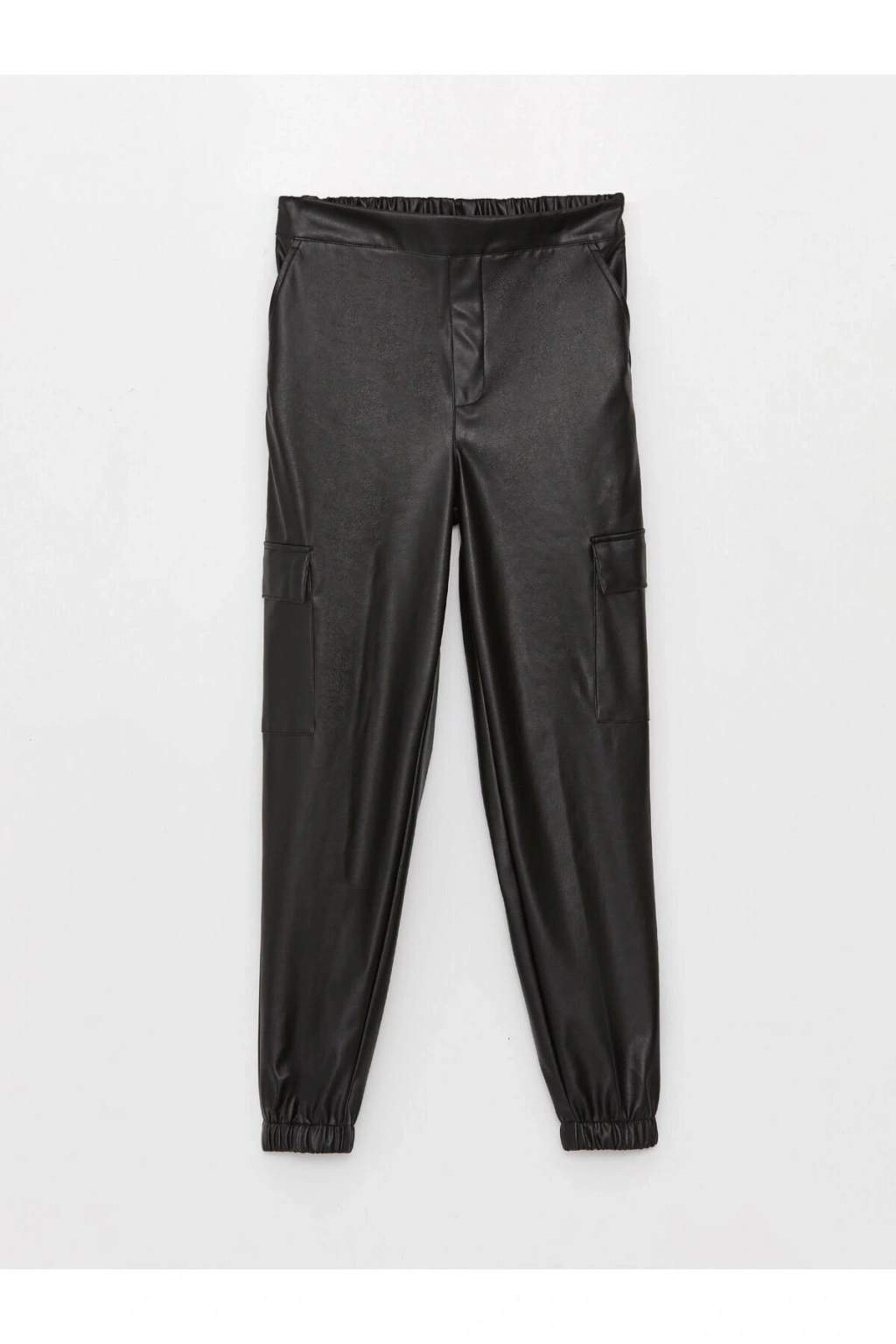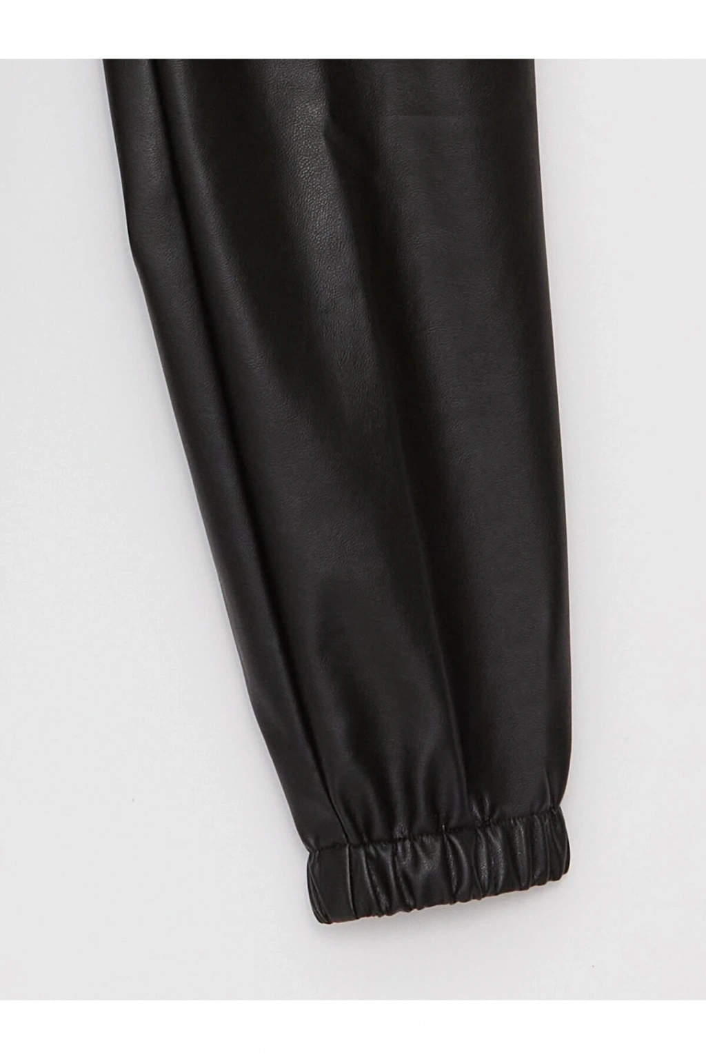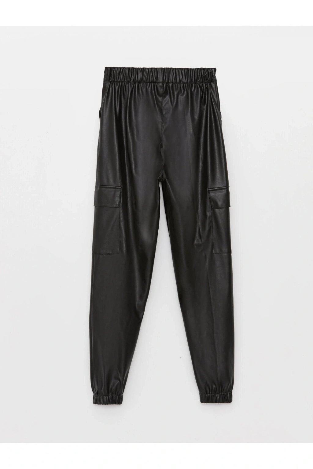 Deri görünümlü kız çocuk pantolon, beli ve paçaları lastikli yapısıyla rahat bir oturuş sunar. Kargo cepli tasarımı, fonksiyonel bir kullanım sağlarken, deri görünümü şık ve modern bir dokunuş katar.