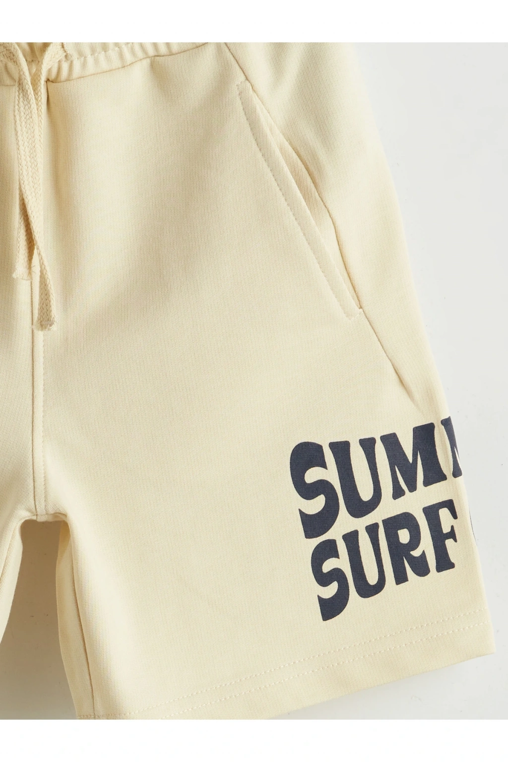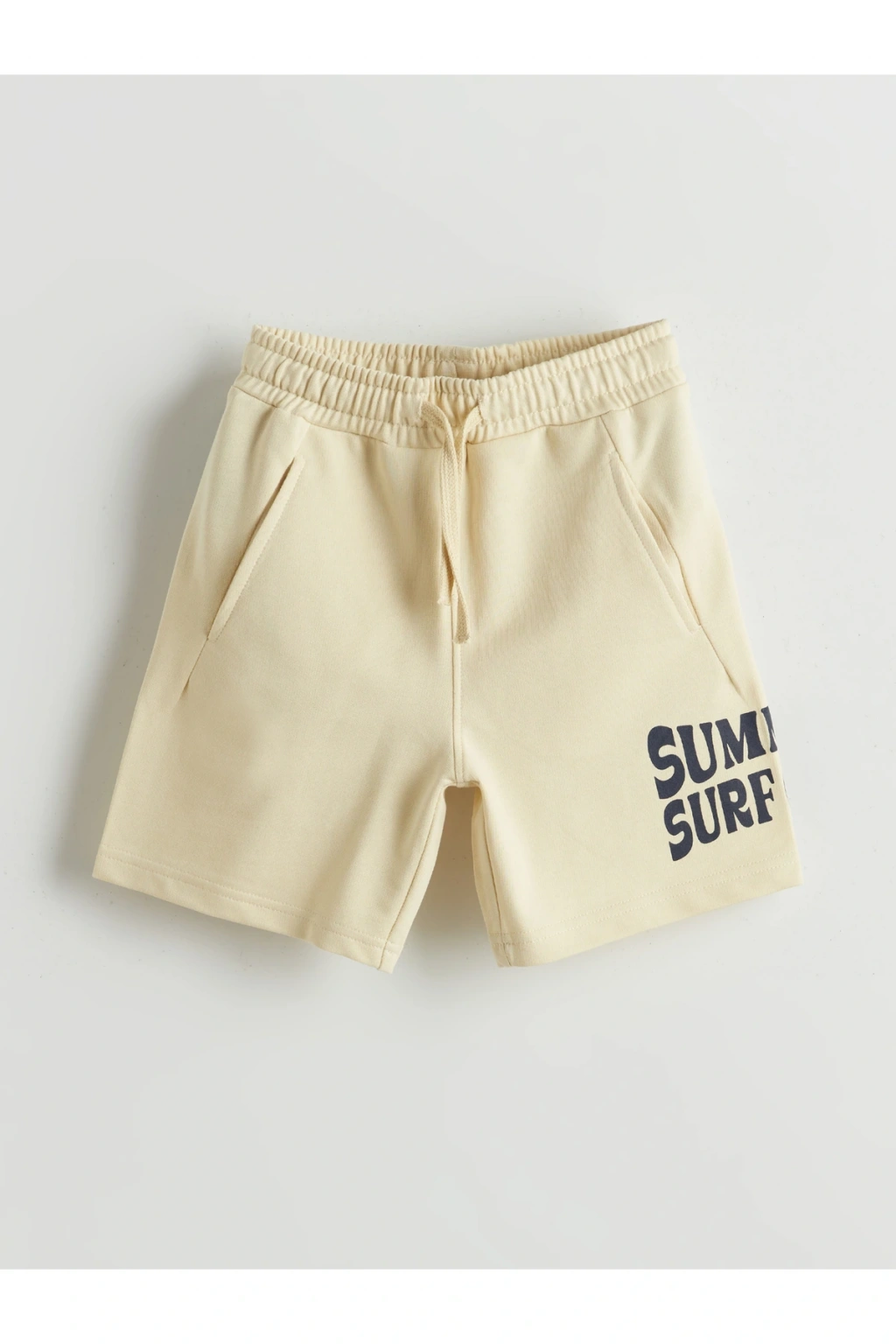 Beli lastikli şort, cepli tasarıma sahiptir.