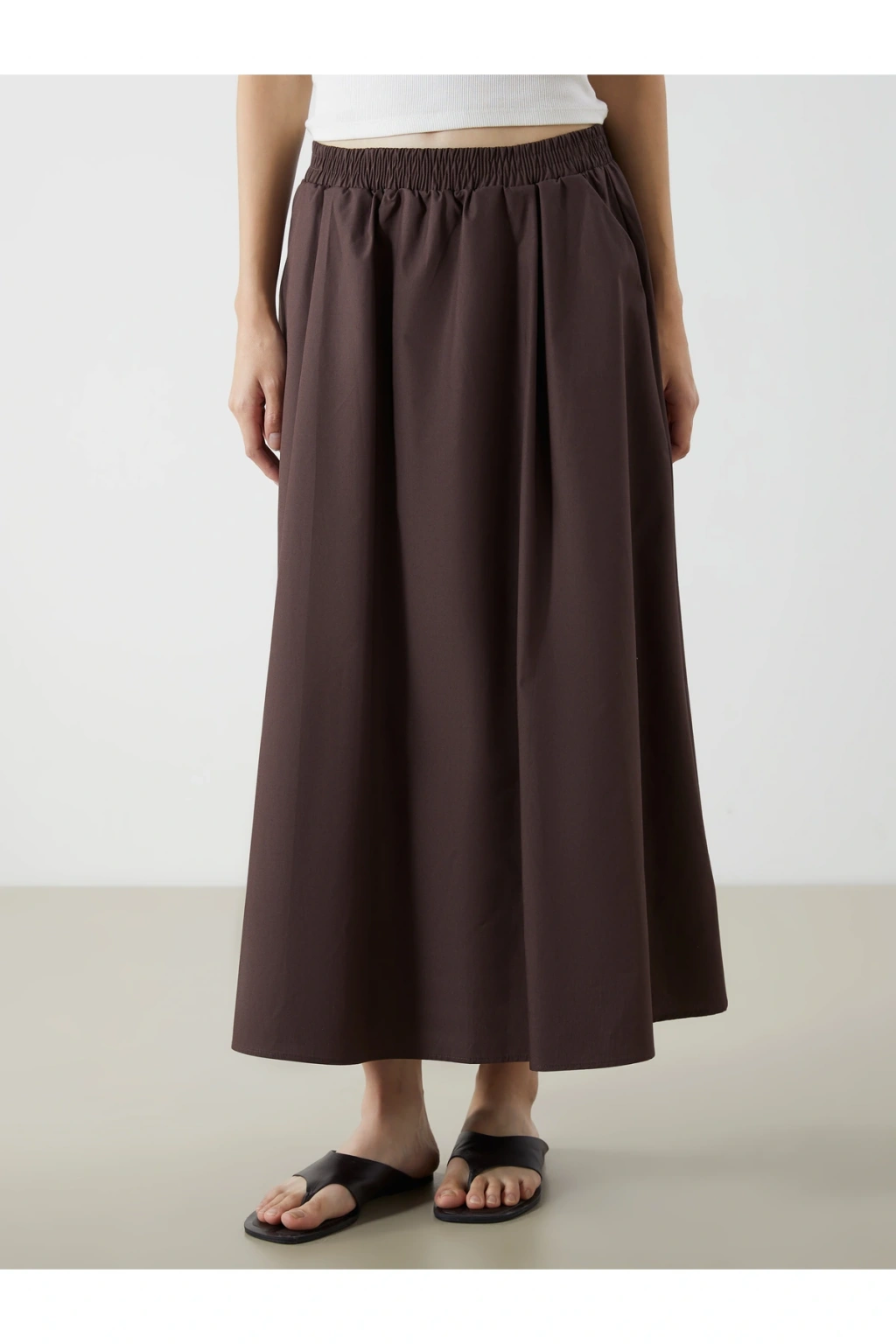 Beli lastikli kadın etek, %100 pamuklu kumaştan üretilmiştir.; İki yandan cepli tasarıma sahiptir.