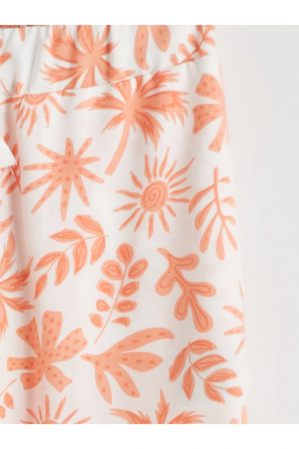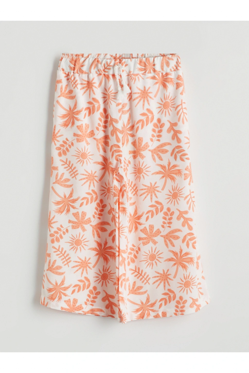 Desenli kız çocuk kapri, hafif ve dökümlü kumaşıyla günlük kullanım için idealdir.; Belindeki lastik detayı sayesinde giyimi kolaylaştırırken, aynı zamanda kullanım konforunu arttırır.; Çocuklarınız için hem şık hem rahat bir seçim.