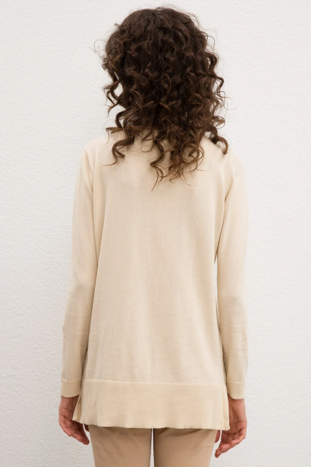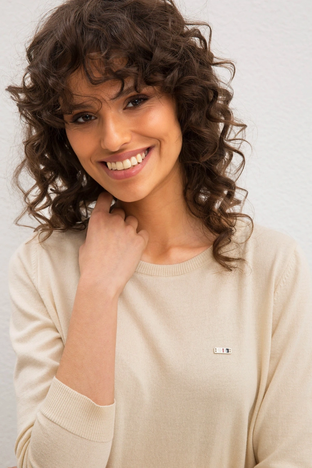 Rahat kesimi ile günlük kullanım için ideal olan beyaz kadın kazak, konforlu ve şık bir seçenektir.; %100 pamuk materyali ile yumuşak dokusuyla teninizde hoş bir his bırakır ve uzun süreli kullanımlarda bile konfor sunar.; Regular fit kesimi sayesinde vücut hatlarını saran ancak sıkmayan bir yapıya sahiptir, hareket özgürlüğünüzü kısıtlamaz.;