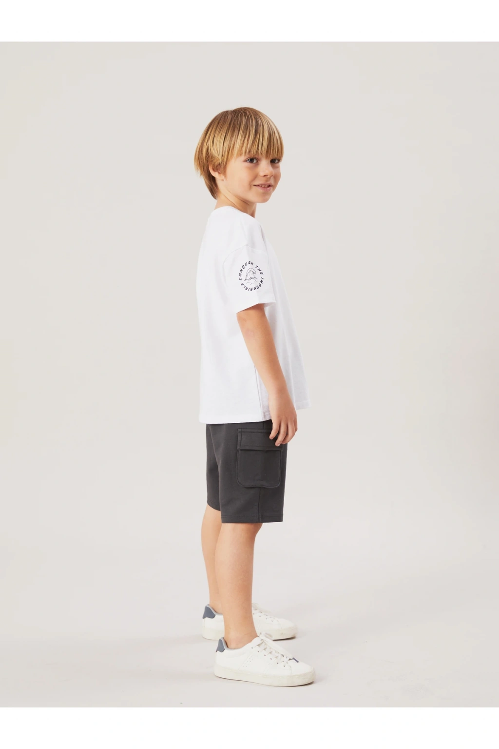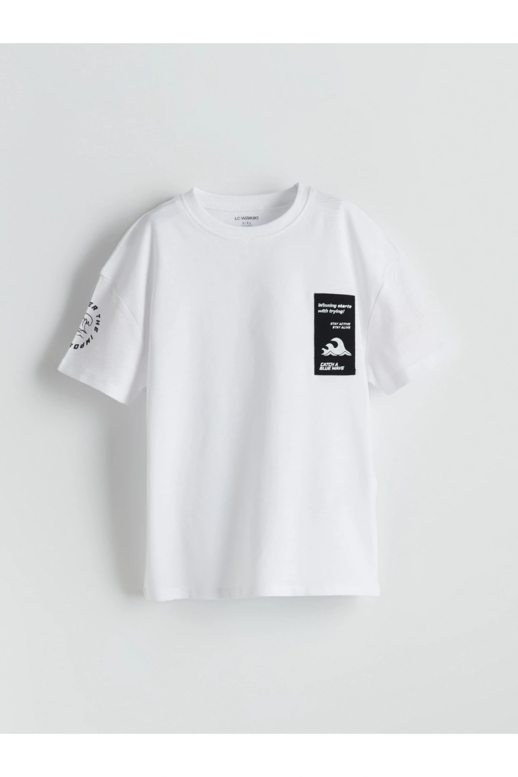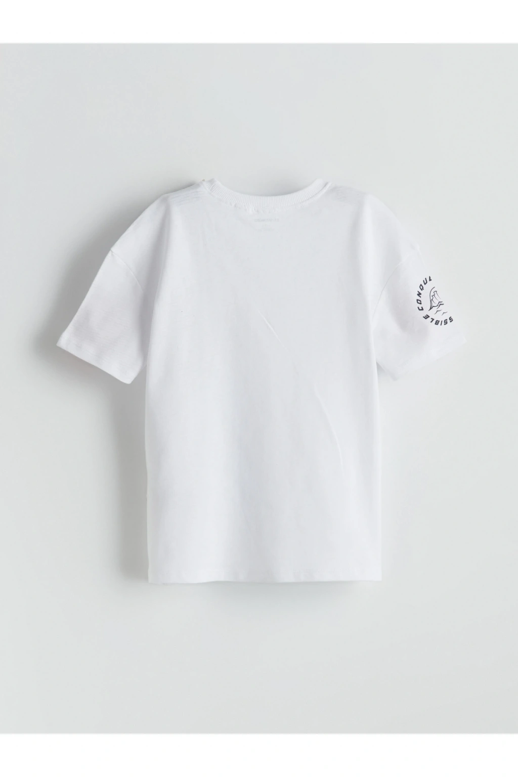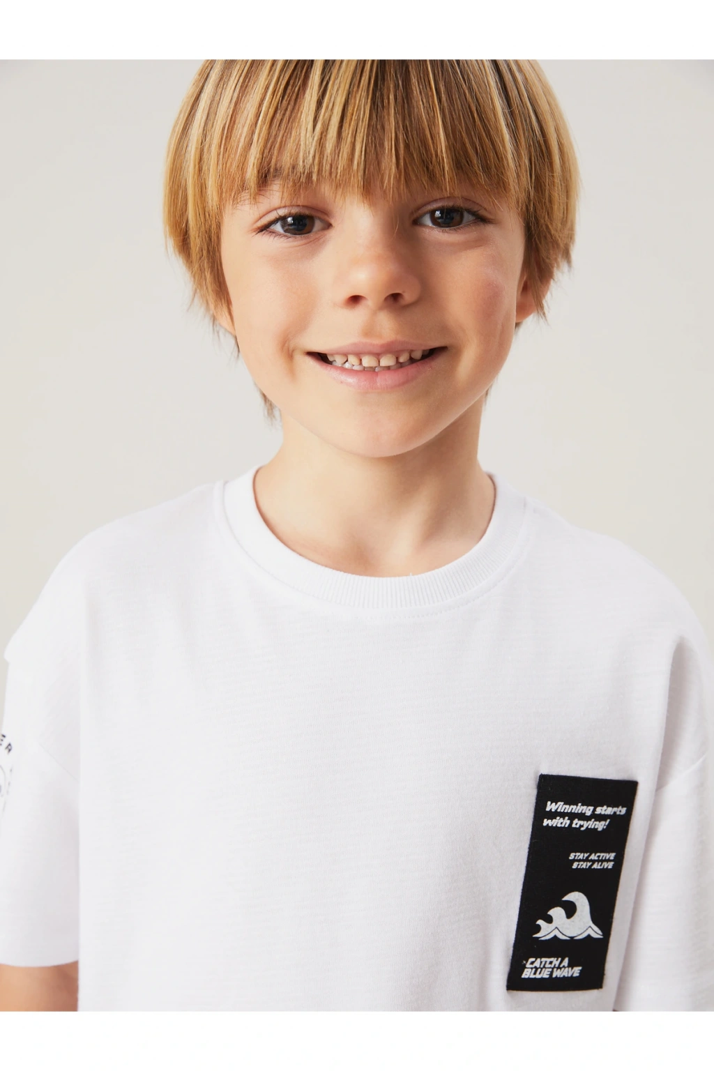Şık baskı detayıyla öne çıkan bisiklet yaka erkek çocuk tişört, pamuk karışımlı kumaşı sayesinde yumuşak ve nefes alabilen bir yapı sunar.