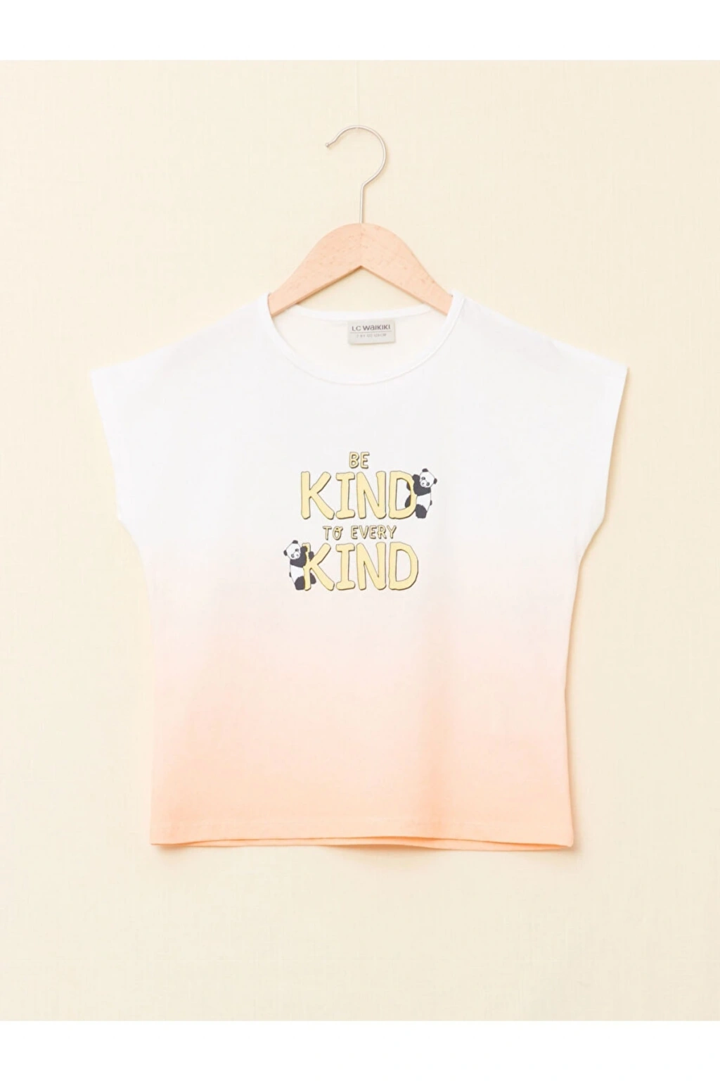 LCW Kids Ekru Bisiklet Yaka Frankfurt Baskılı Kız Çocuk Crop Tişört
