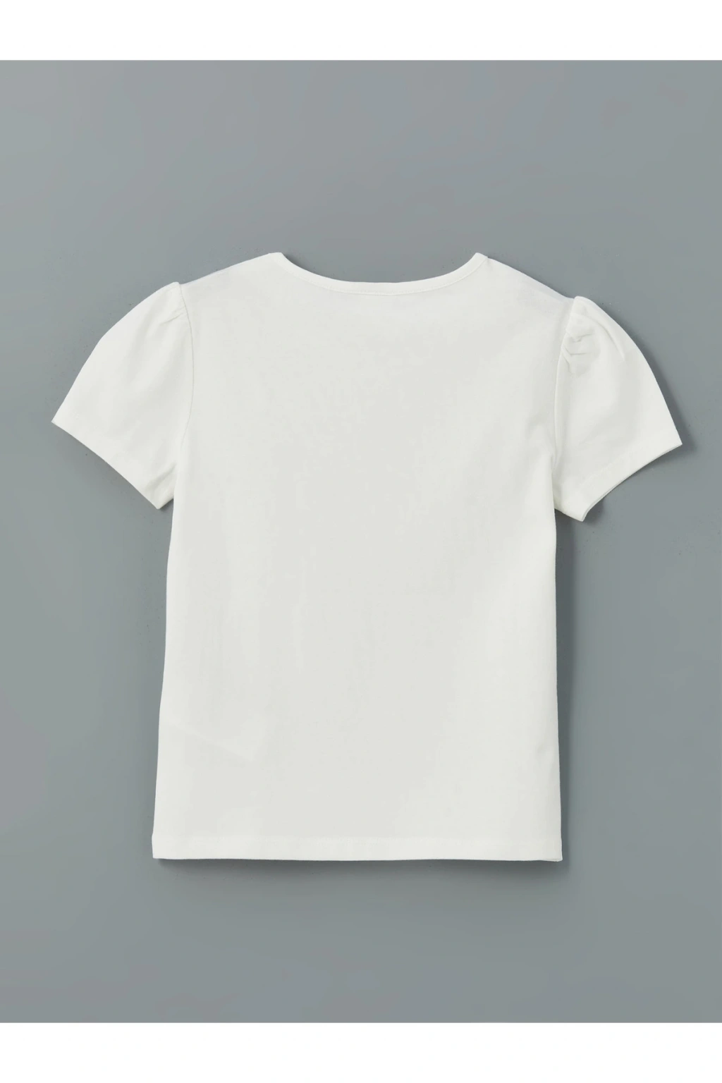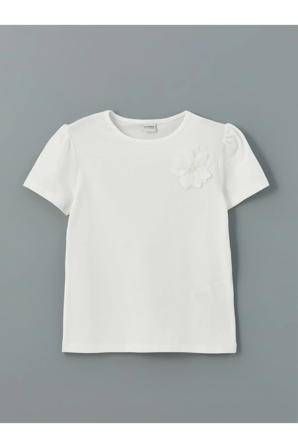 Bisiklet yaka tişört, çiçek aplikesi ile tatlı bir detay sunuyor.; Kısa kollu ve yumuşak kumaş yapısı ile rahat bir giyim deneyimi sağlarken, sade ve zarif tasarımı ile çocukların günlük giyim ve özel günlerine şıklık katıyor.