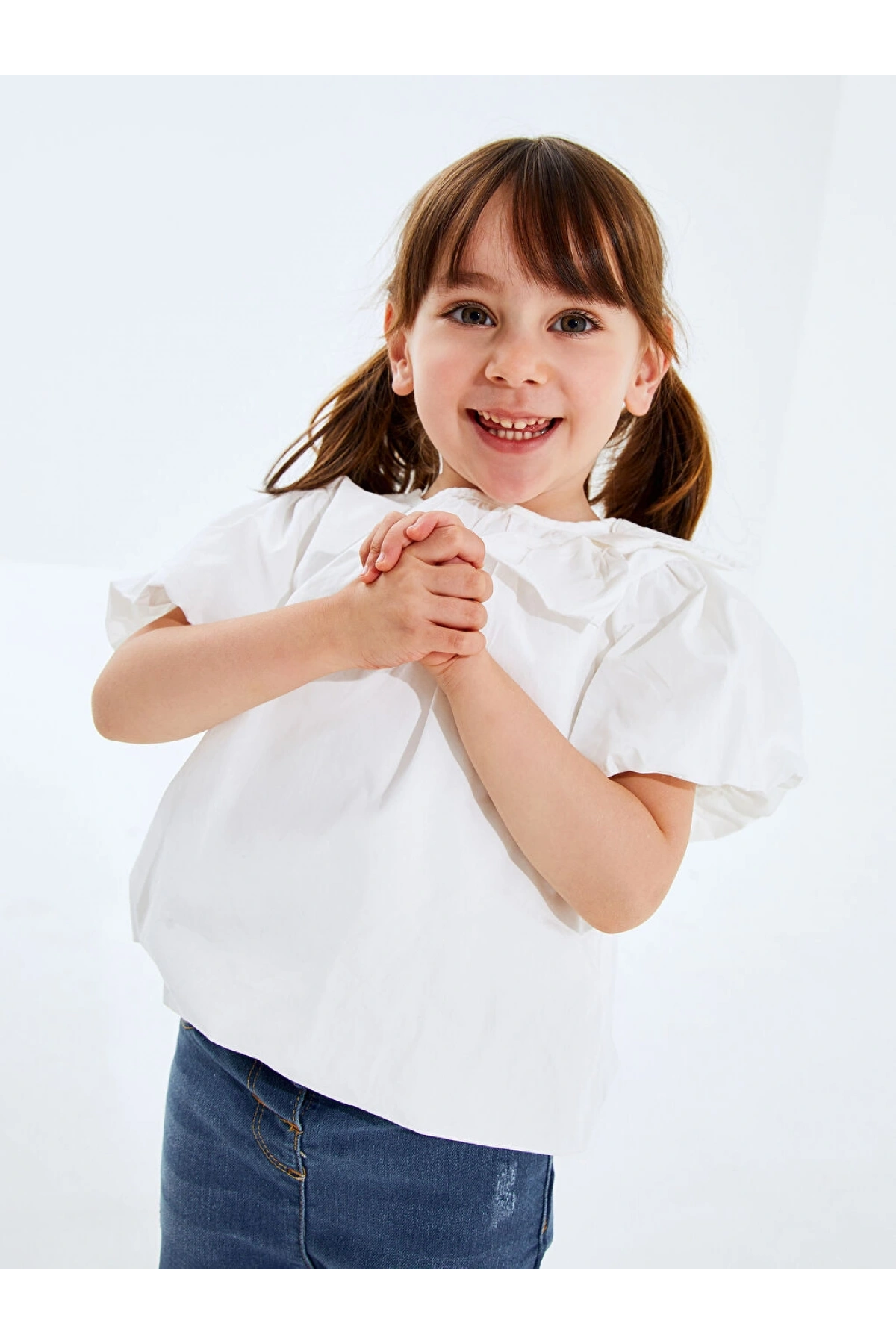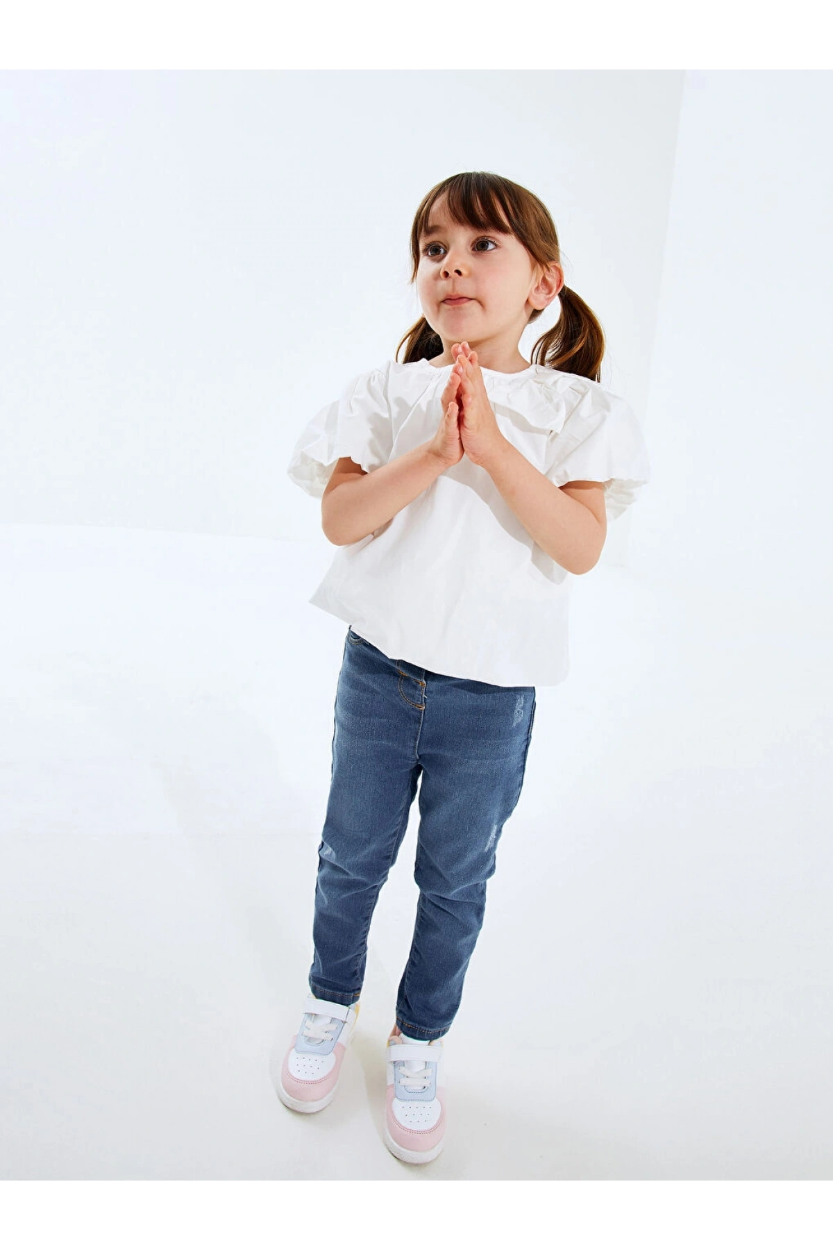 LCW Kids Lacivert Fiyonk Detaylı Fırfırlı Kız Çocuk Jean Bluz