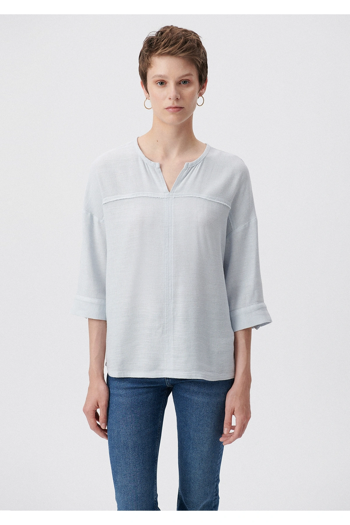 Fashion Friends V Yaka Keten Bej Kadın Bluz