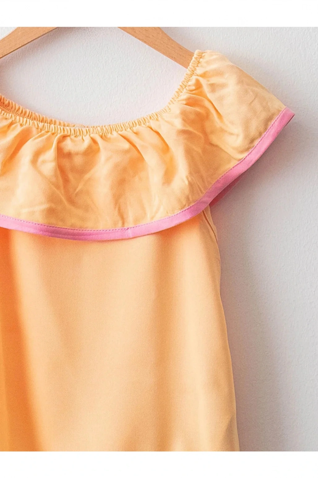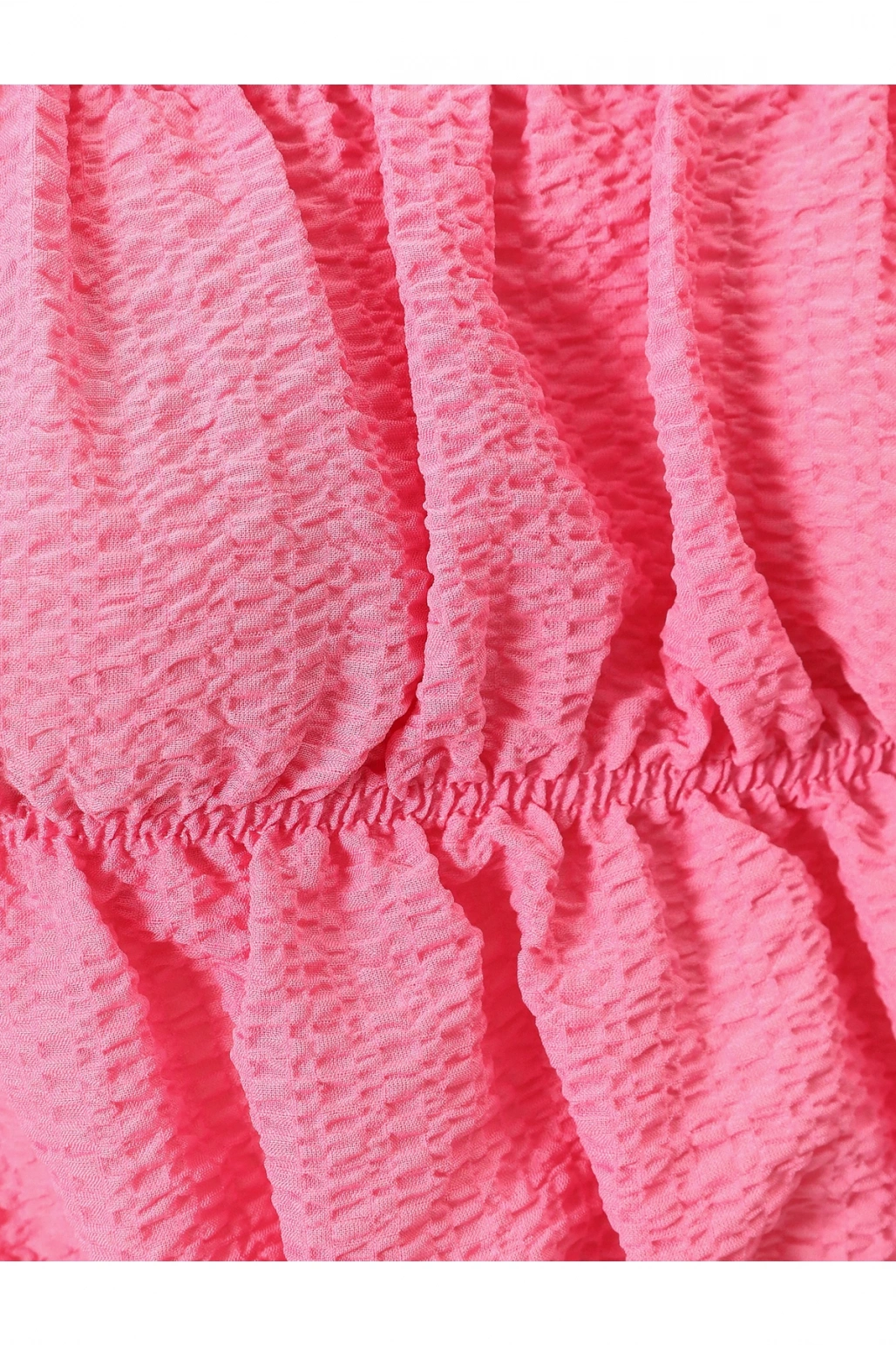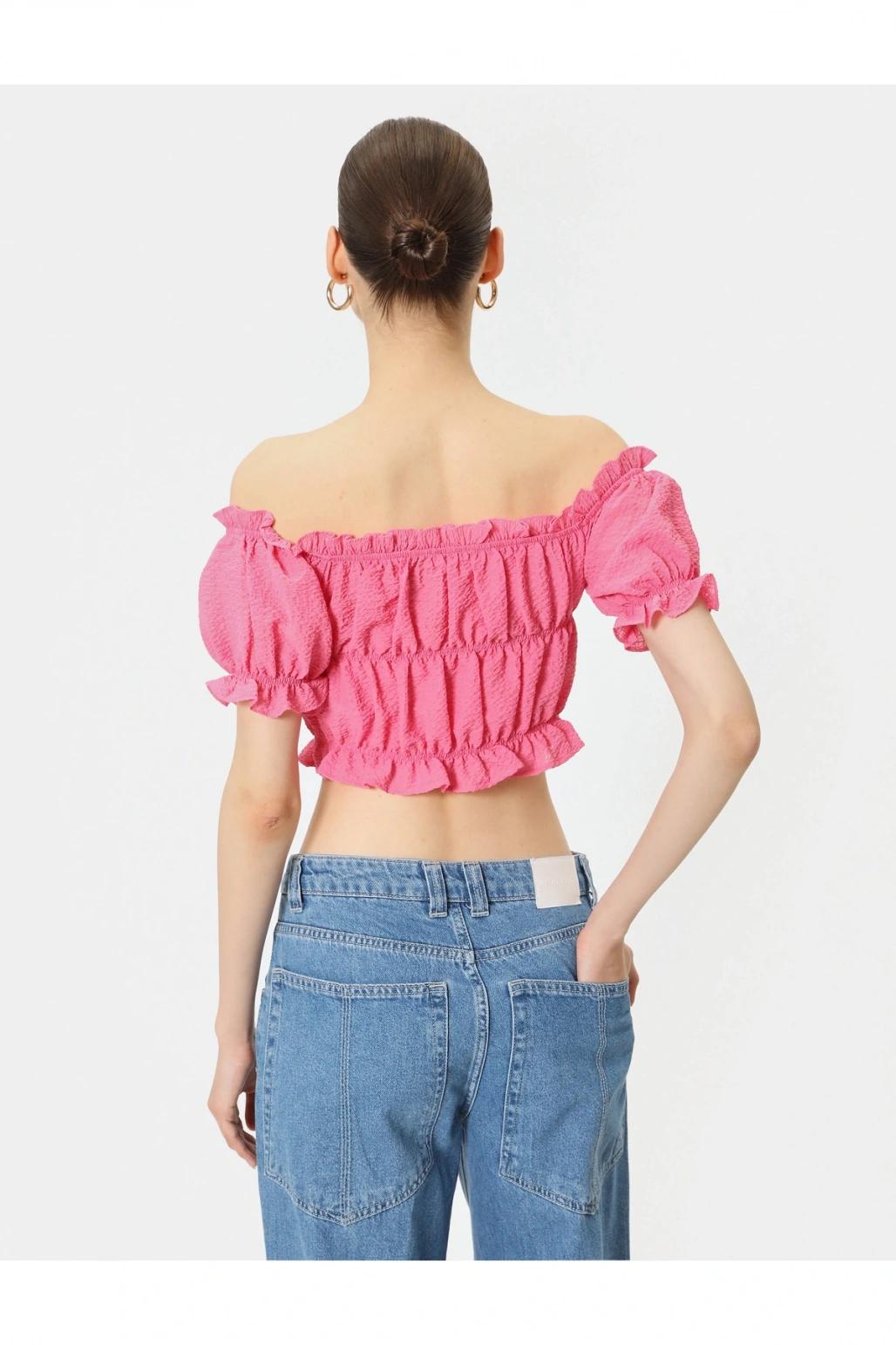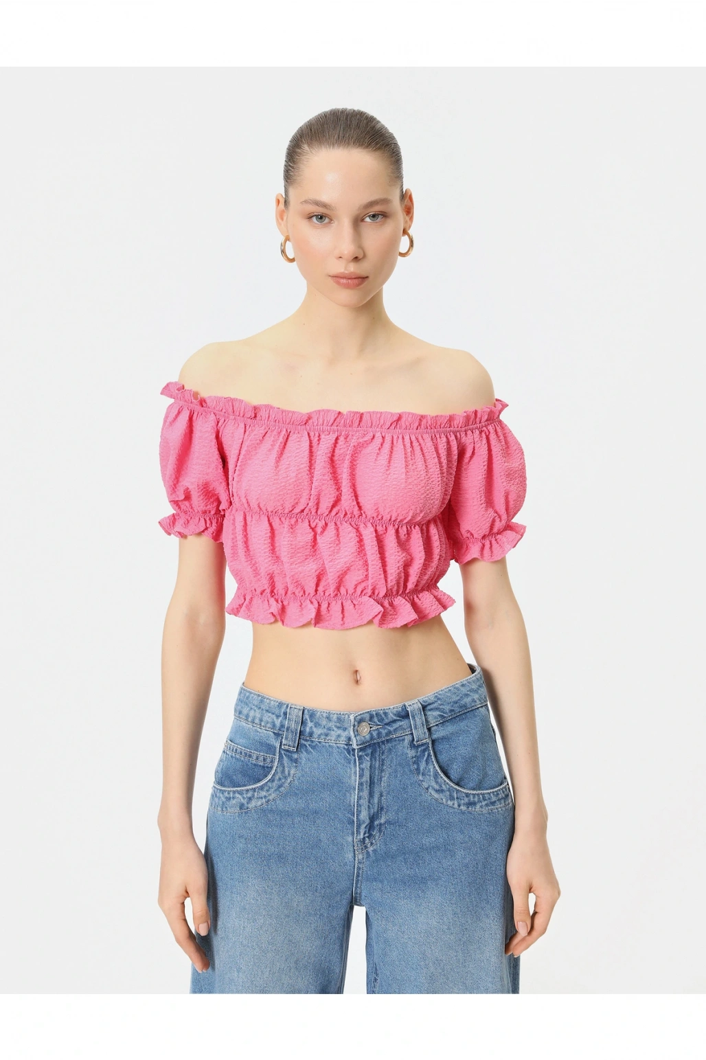 Omzu Açık Fırfırlı Bluz Crop Kısa Kollu Büzgülü Gofre Kumaş