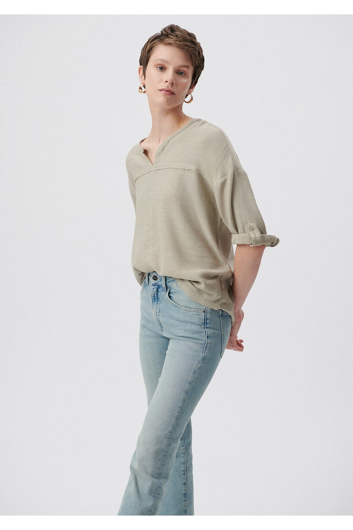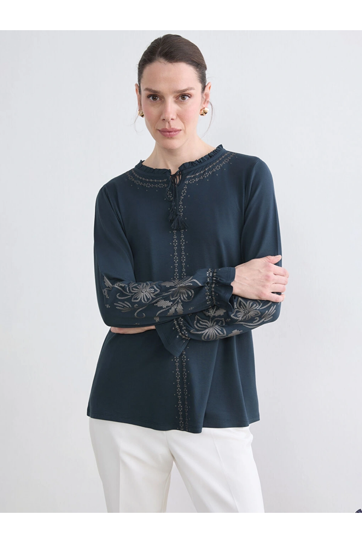LCW Grace Yeşil Bağlamalı Yaka Nakışlı Büzgülü Bluz