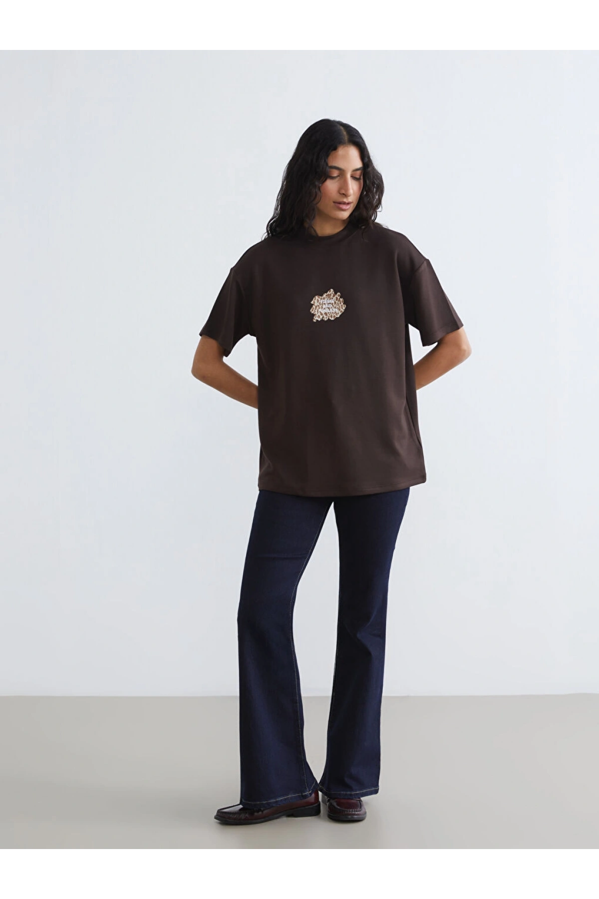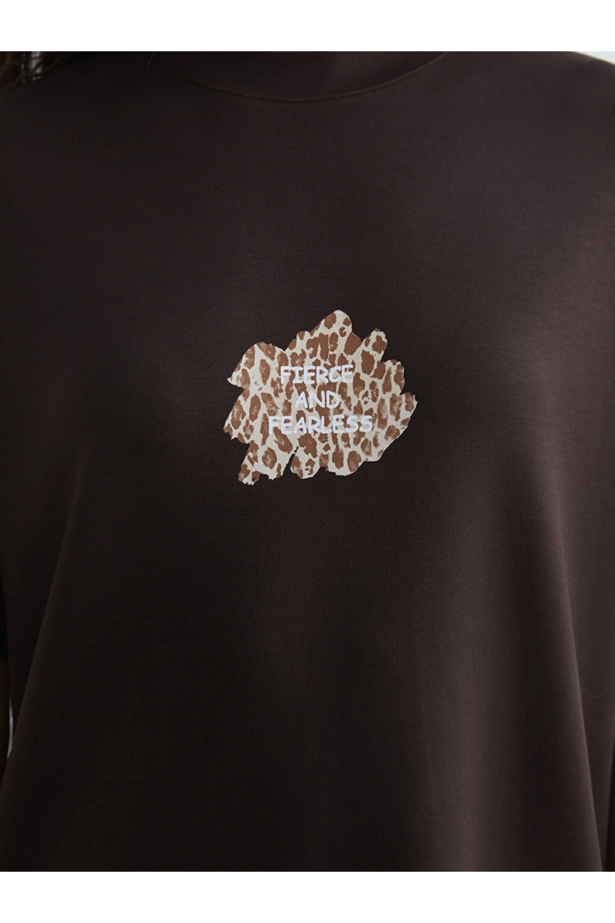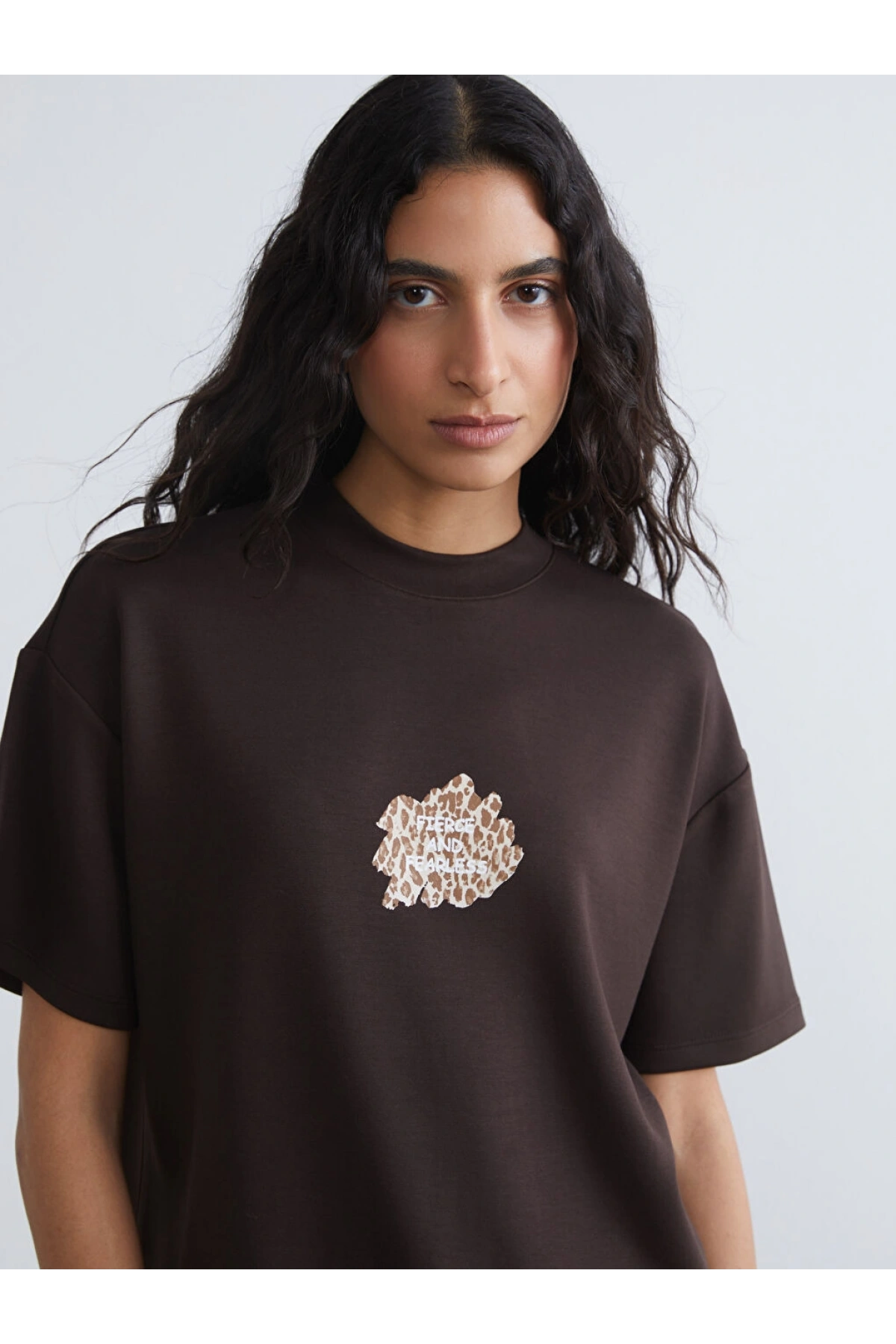 LCW Modest Kahverengi Bisiklet Yaka Baskılı Kadın Tişört