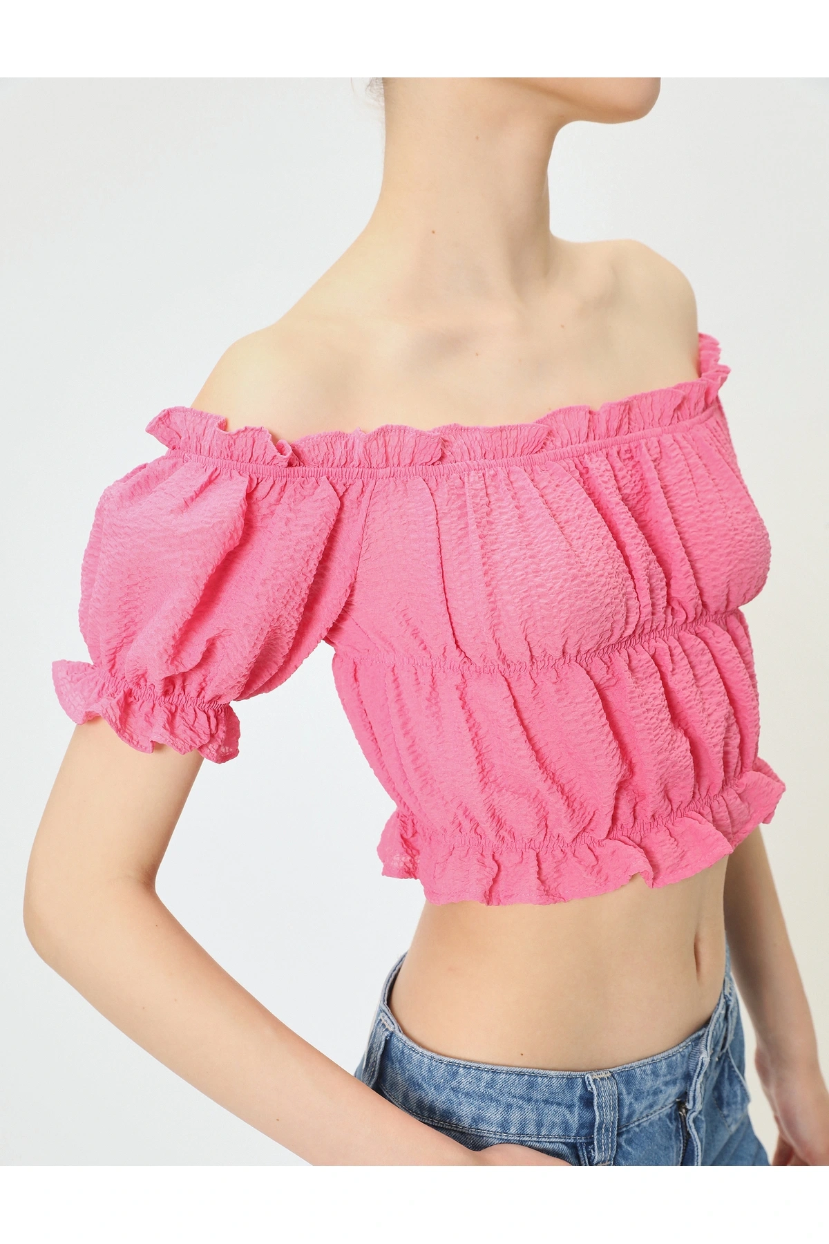 Omzu Açık Fırfırlı Bluz Crop Kısa Kollu Büzgülü Gofre Kumaş