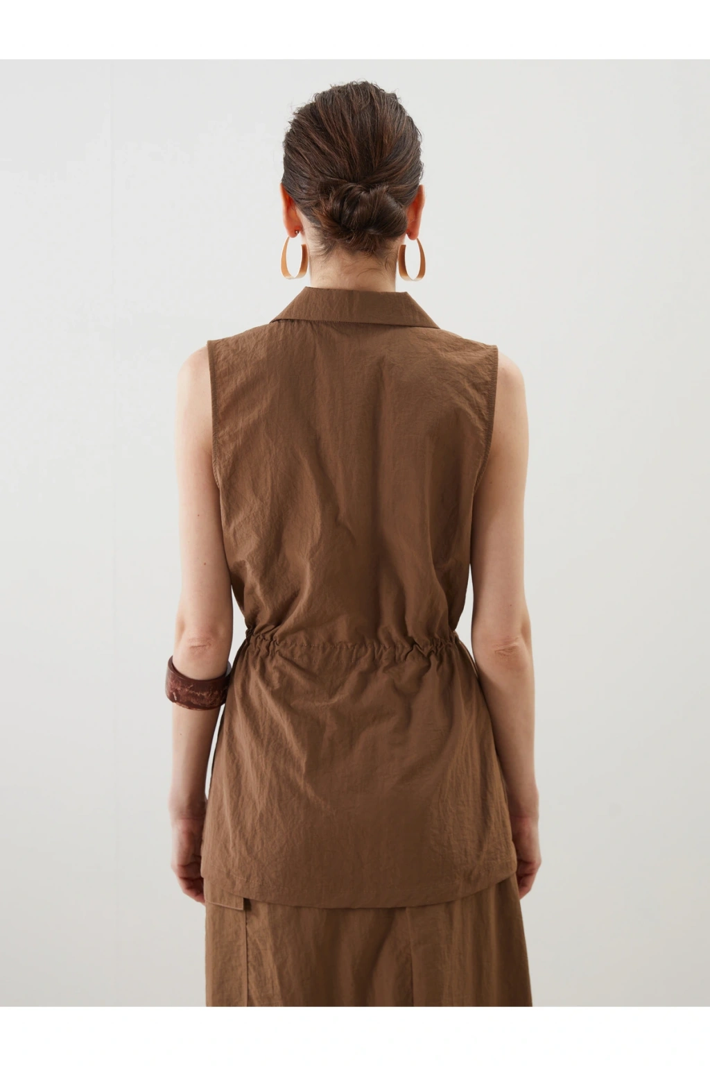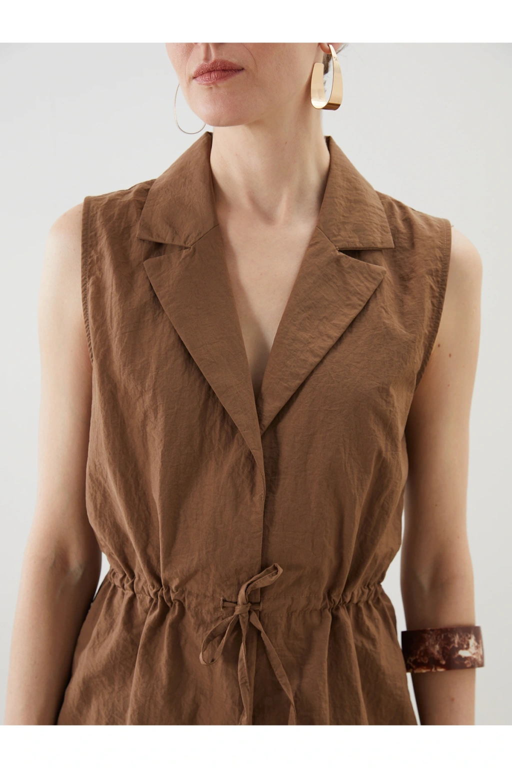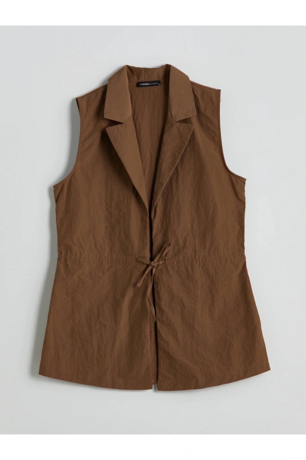 Ceket yaka klasik yelek, keten görünümlü kumaştan üretilmiştir.; Önden bağlamalıdır.