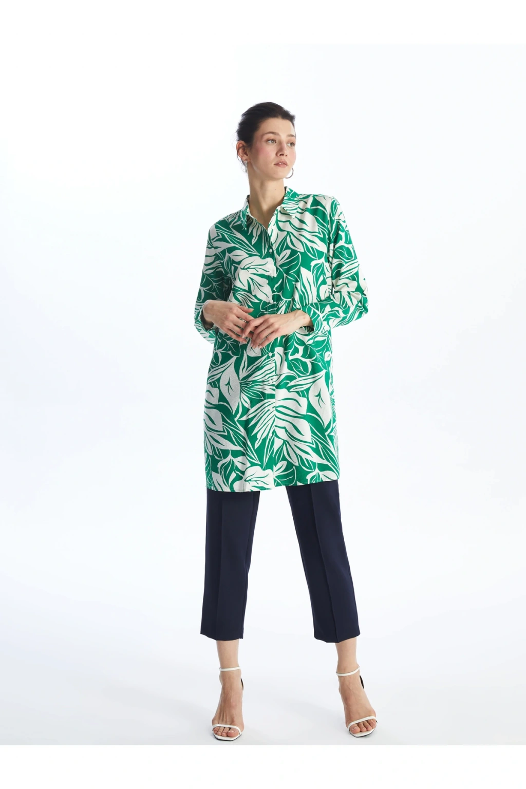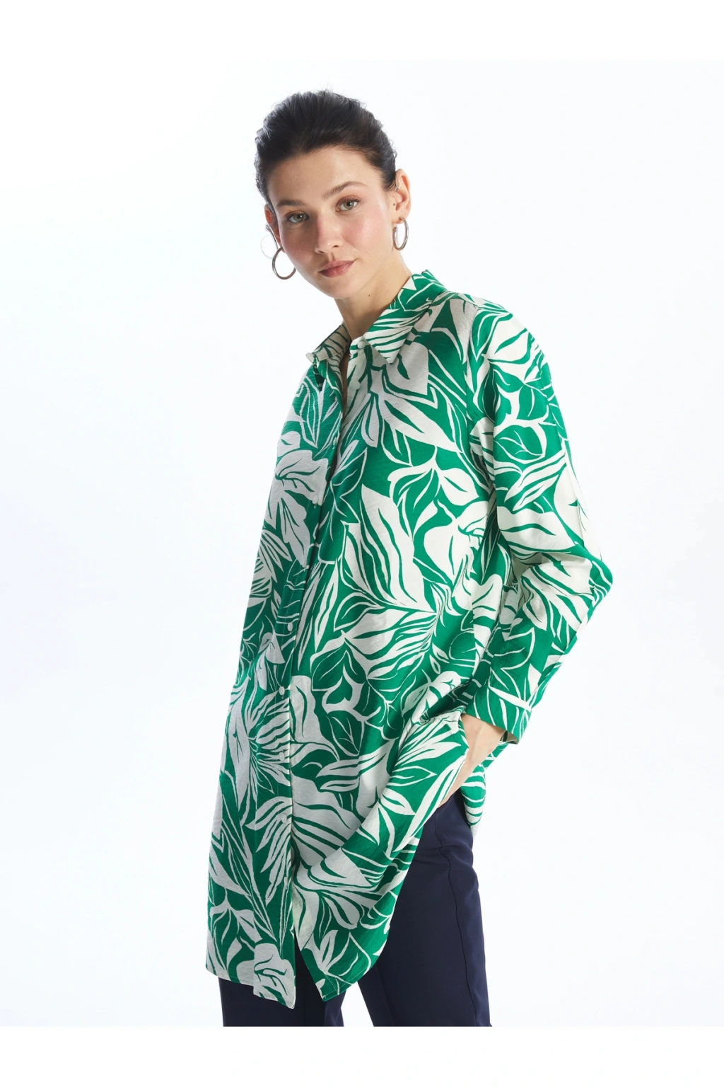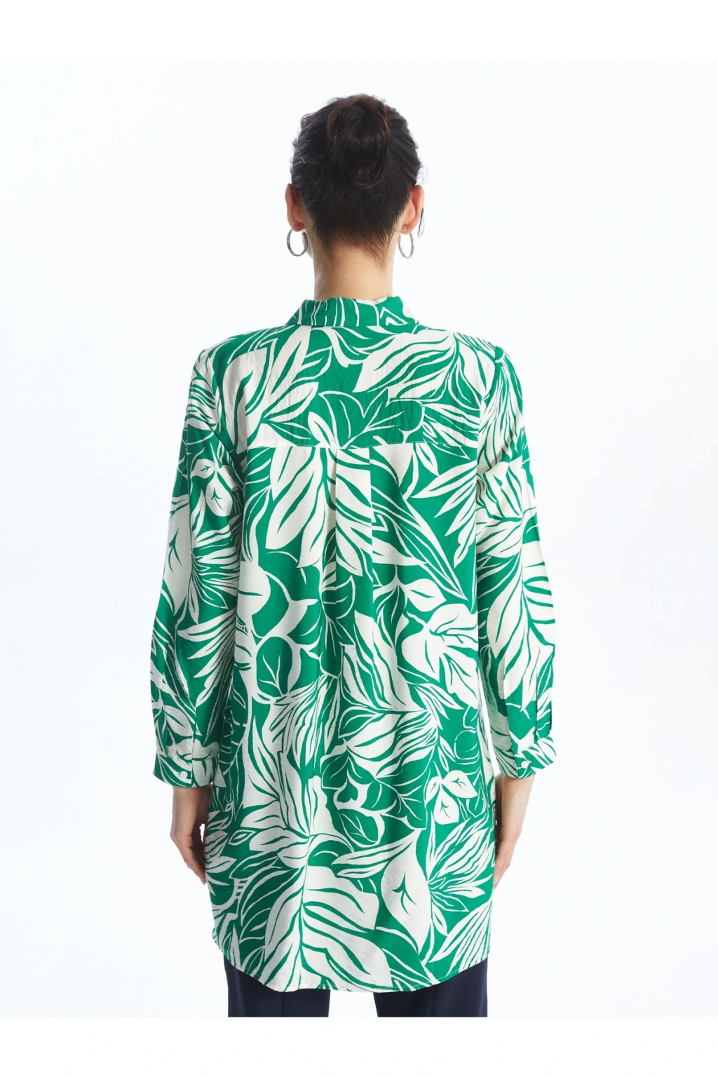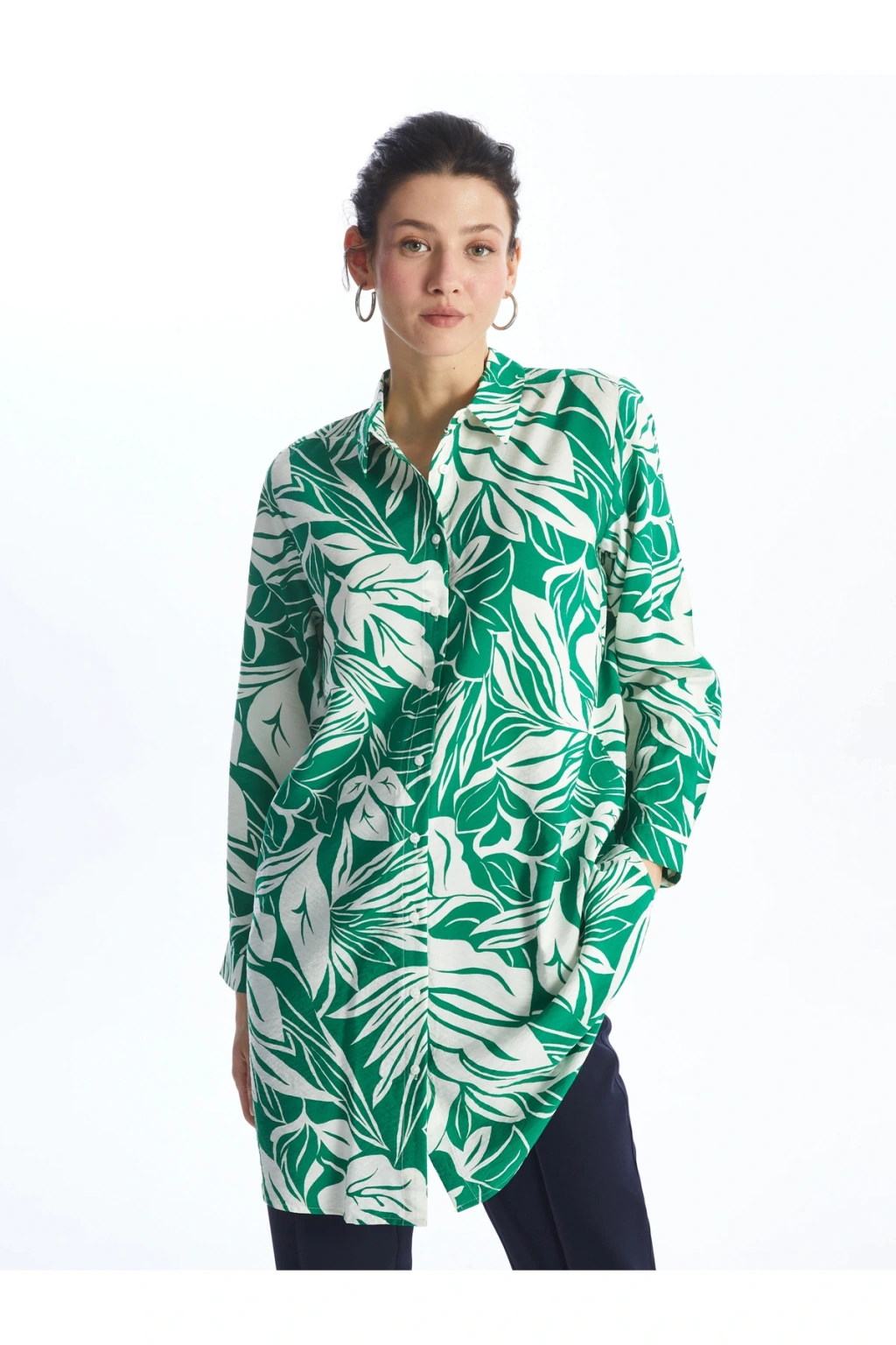 Desenli uzun kollu gömlek tunik, viskoz elyaftan üretilmiştir ve yumuşak bir dokuya sahiptir.; Hafif ve ince yapısı ile rahat bir kullanım sunar.; Önden düğme kapamalı özelliği sayesinde kolay giyilebilir.