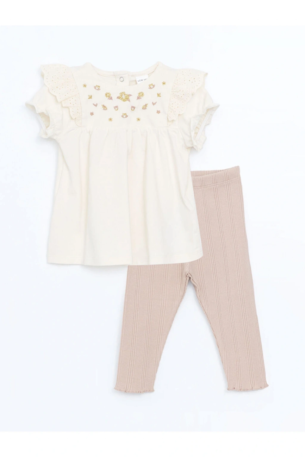 Ürün Açıklaması Pamuklu penye kumaşıyla yumuşak ve rahat bir kullanım sunar.; Zarif nakış detayları, bluze şıklık katarken, esnek tayt rahatlık sağlar ve miniklere hareket özgürlüğü tanır.; Günlük giyim için ideal bir seçenek oluşturur.; Ürün İçeriği ve Özellikleri Ürün İçeriği: Ana Kumaş Bluz: %5 ELASTAN %95 Pamuk Ana Kumaş Tayt: %6 ELASTAN %94 Pamuk Ürün Özellikleri: Satıcı: LC Waikiki Marka: LCW baby Ürün Tipi: Takım Cinsiyet: Kız Bebek Kalıp: Standart & Regular Kumaş: Penye Desen: Nakışlı Yaka: Bisiklet Yaka Kalınlık: İnce Kol Boyu: Kısa Kollu Malzeme: Yüksek Pamuk İçerir Parça Sayısı: 2 Parça