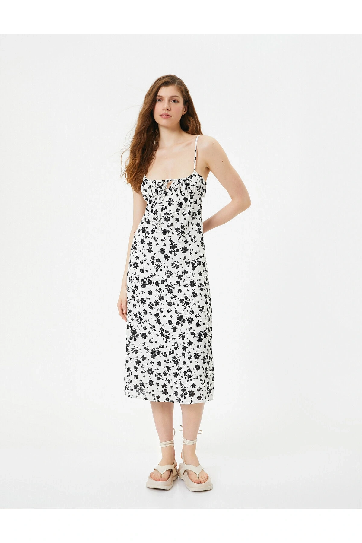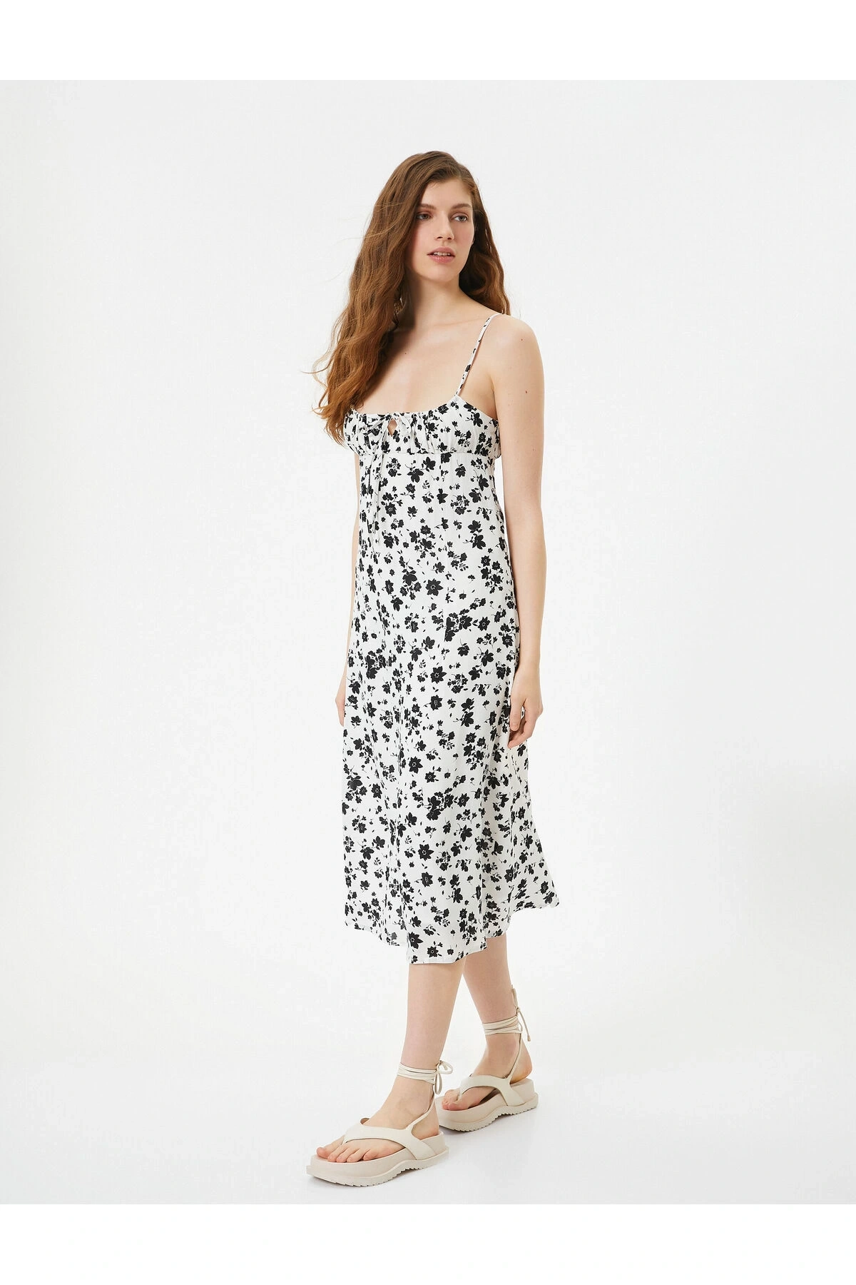 Çiçekli Elbise Midi Boy Askılı Gipe Detaylı Rahat Kalıp Bürümcük