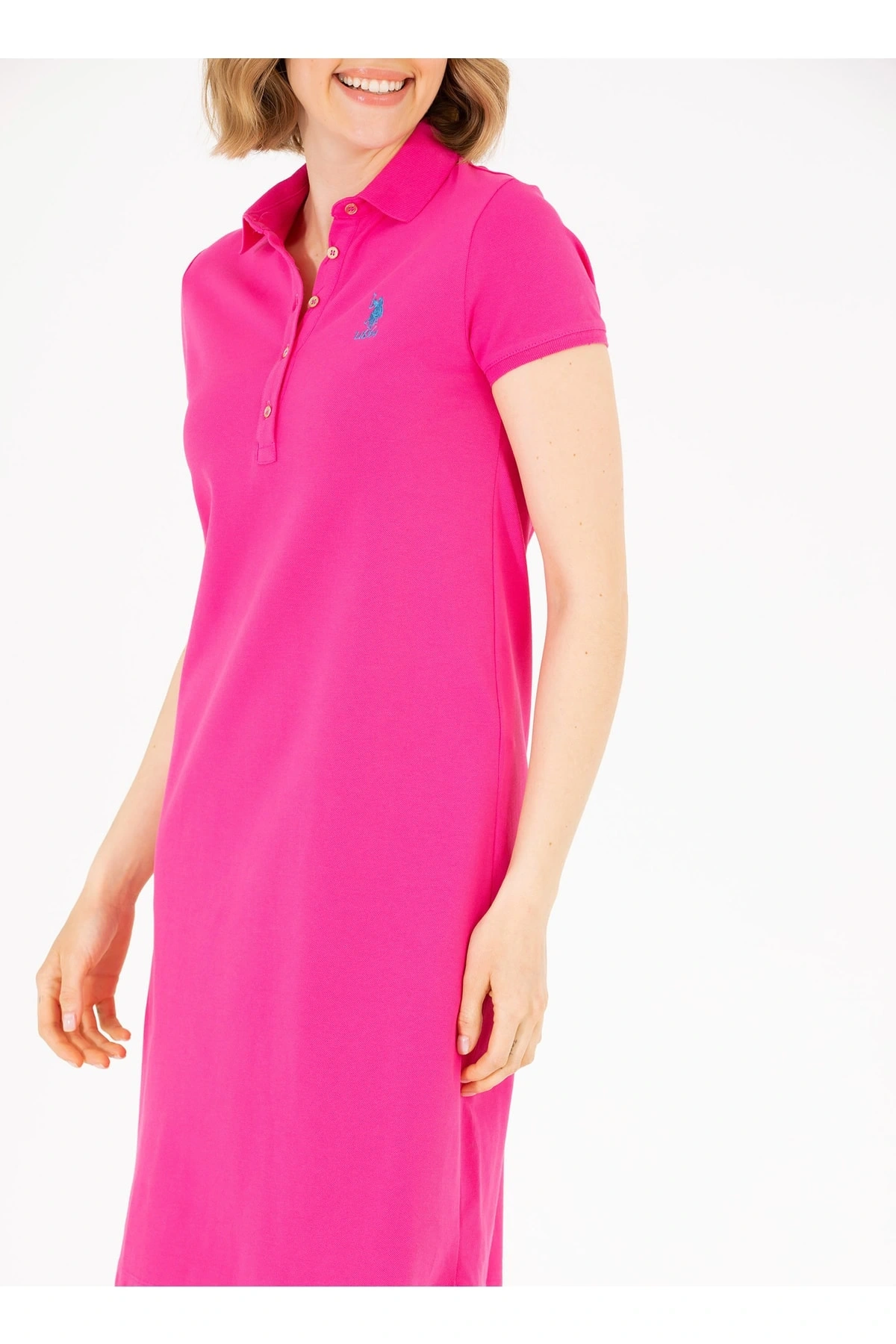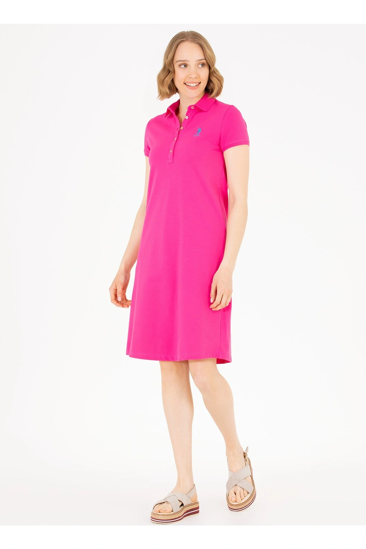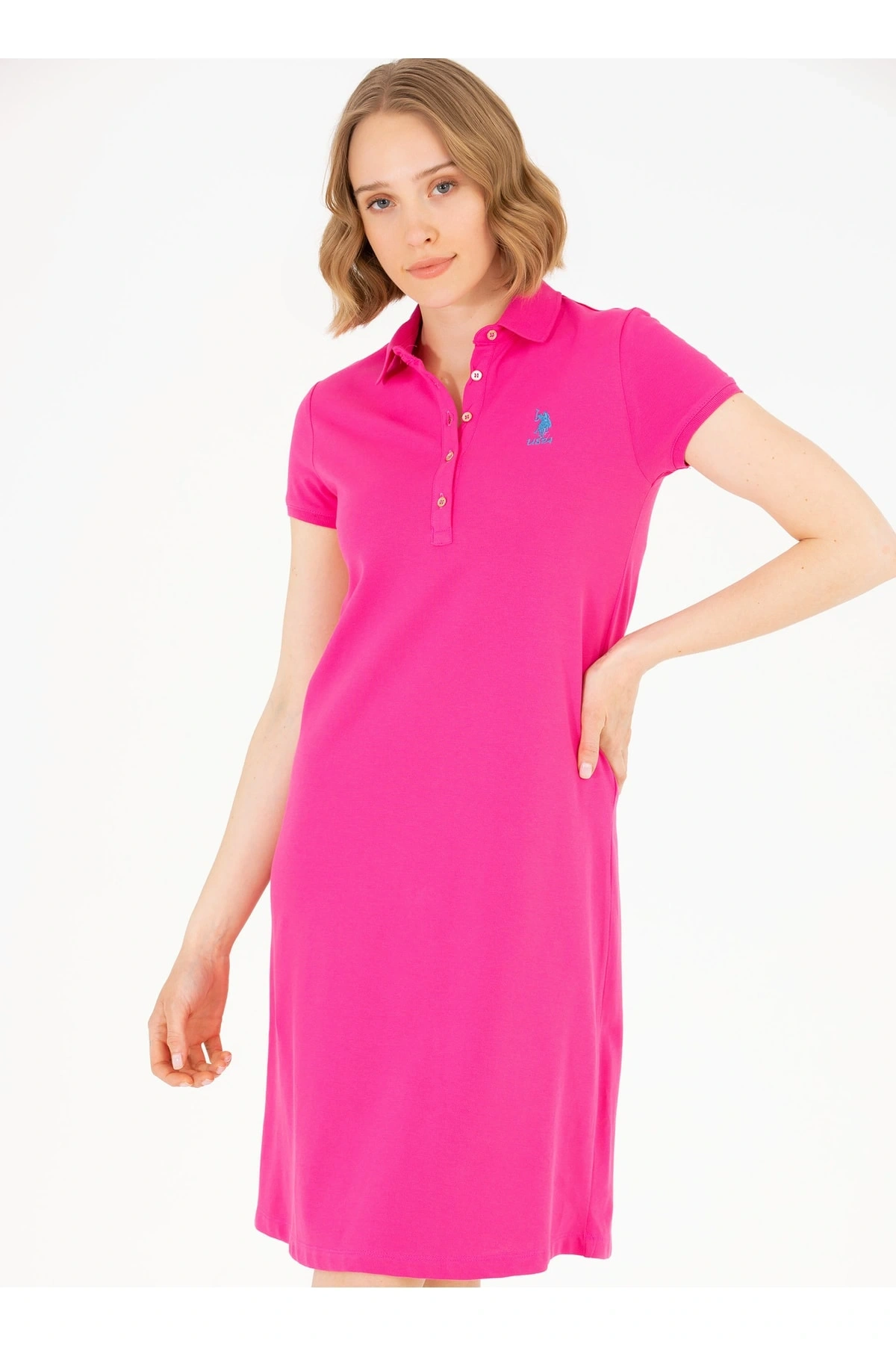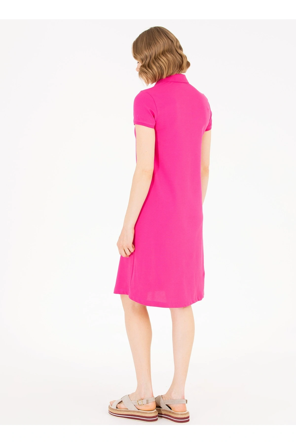 Polo Yaka Düz Pembe Diz Üstü Kadın Elbise Gurlın23