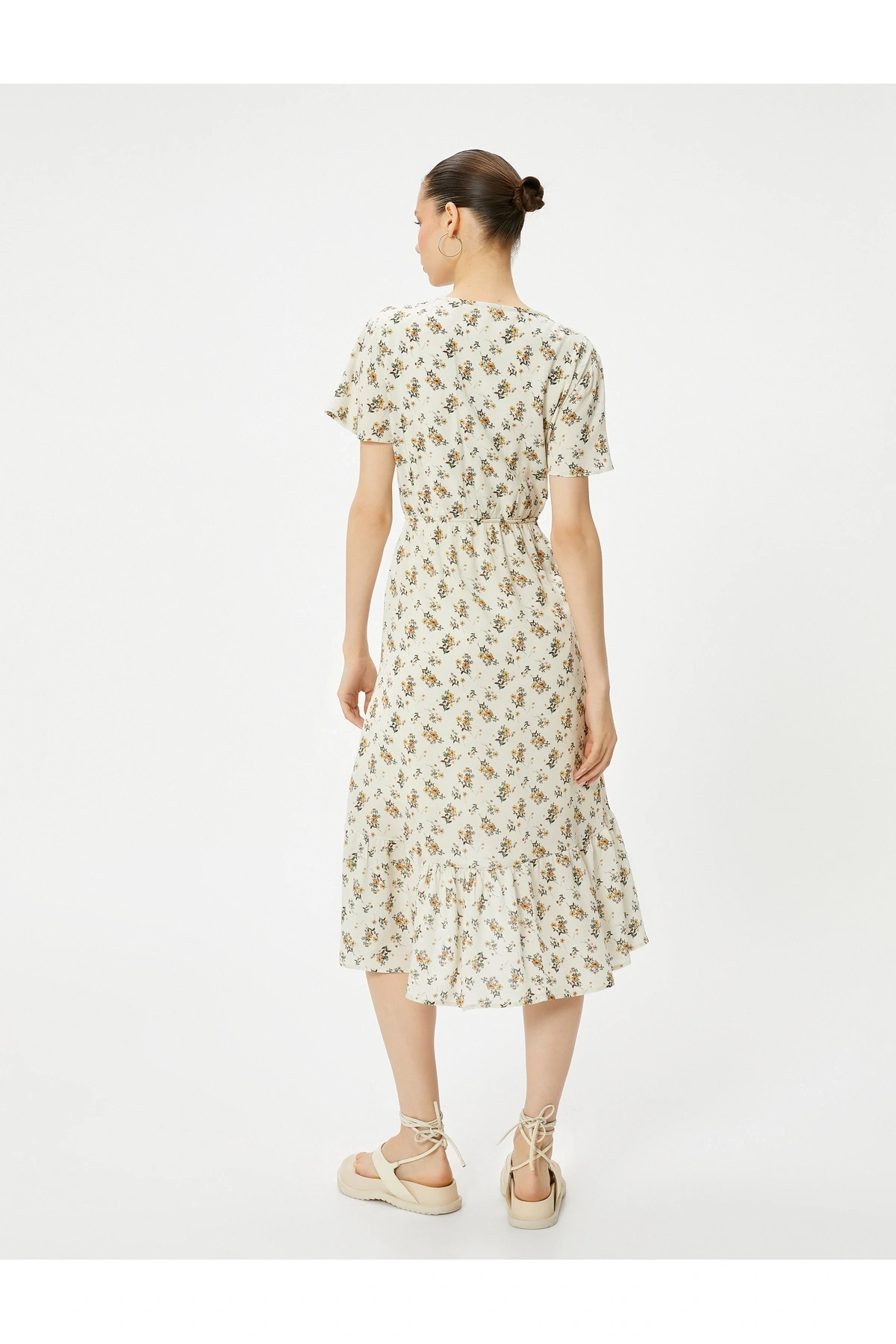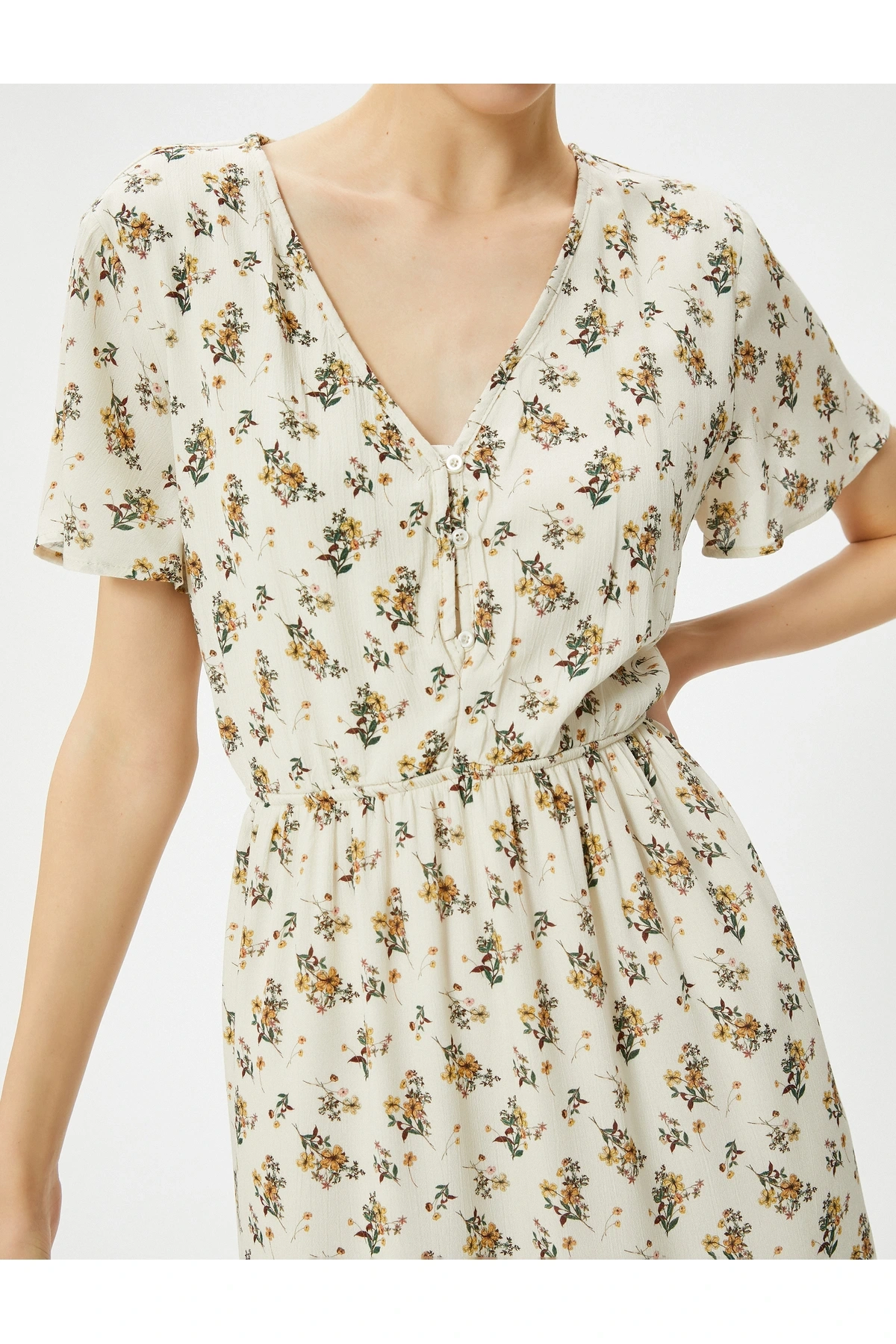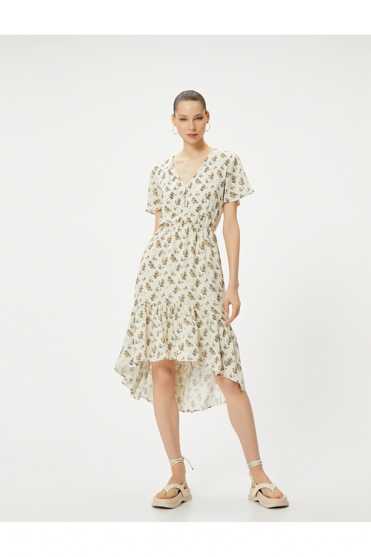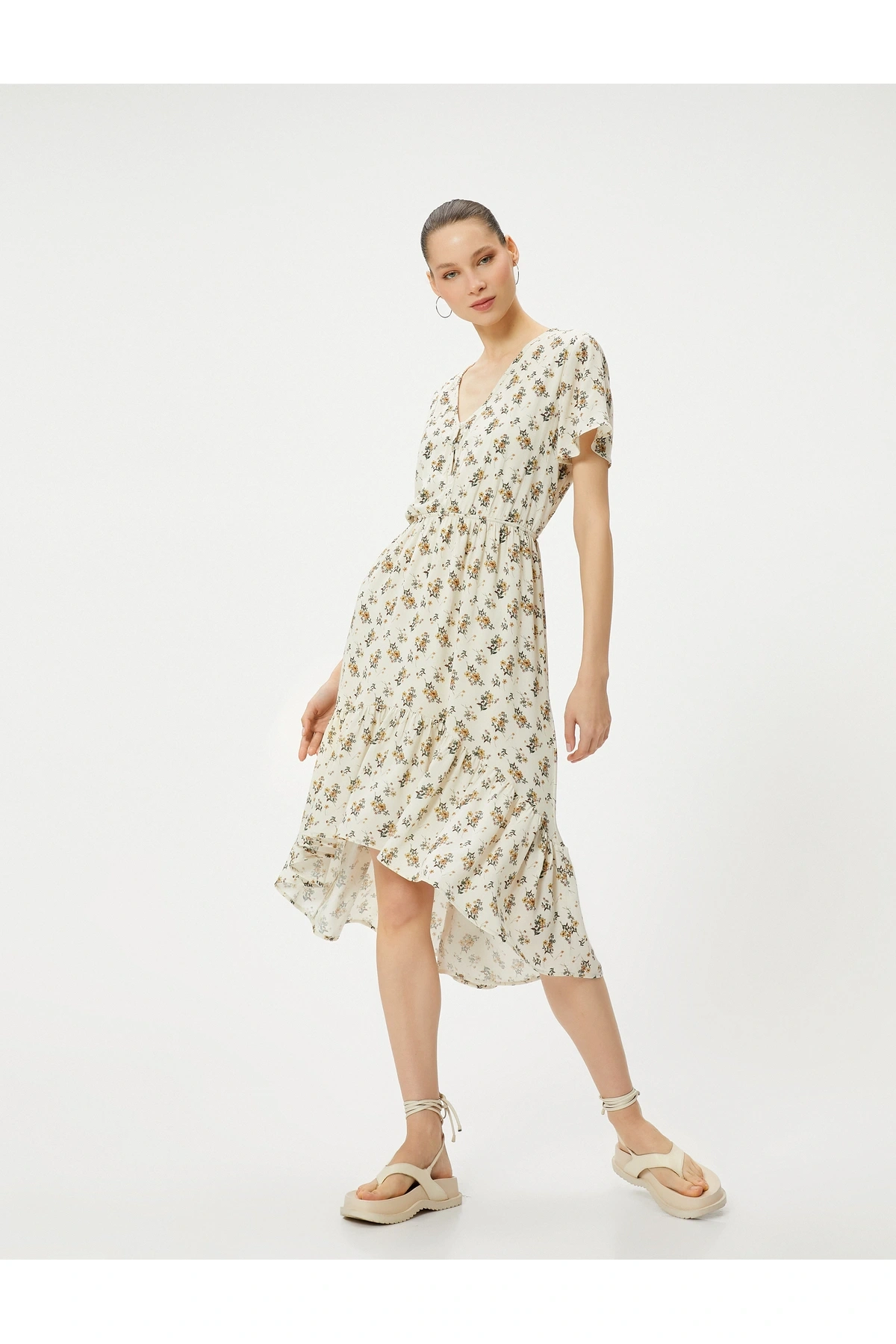 Çiçekli Midi Elbise Asimetrik Kesim Fırfırlı Kısa Kollu V Yaka Düğmeli Astarlı