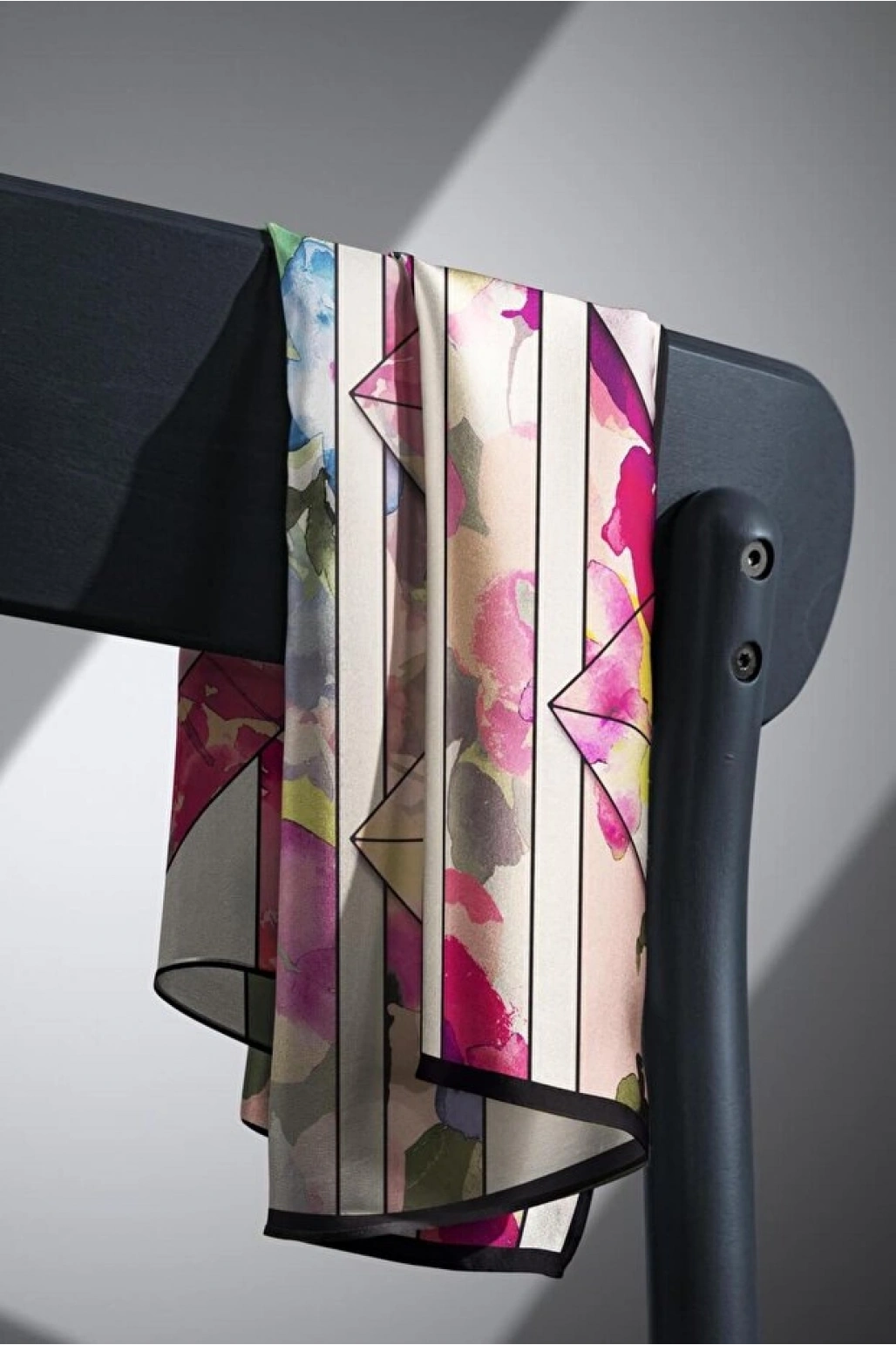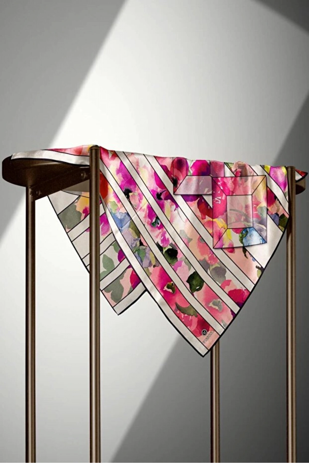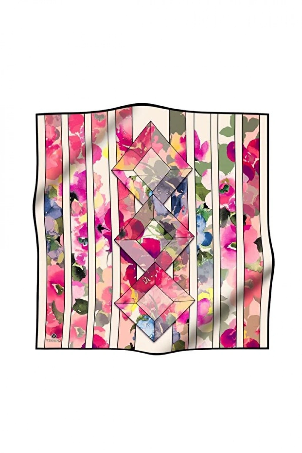 Vissona %100 Twill İpek Geometrik Çizgi Desenli Fuşya - Turuncu Renkli 90x90 Eşarp Kenar Dikiş Şekli El Diki