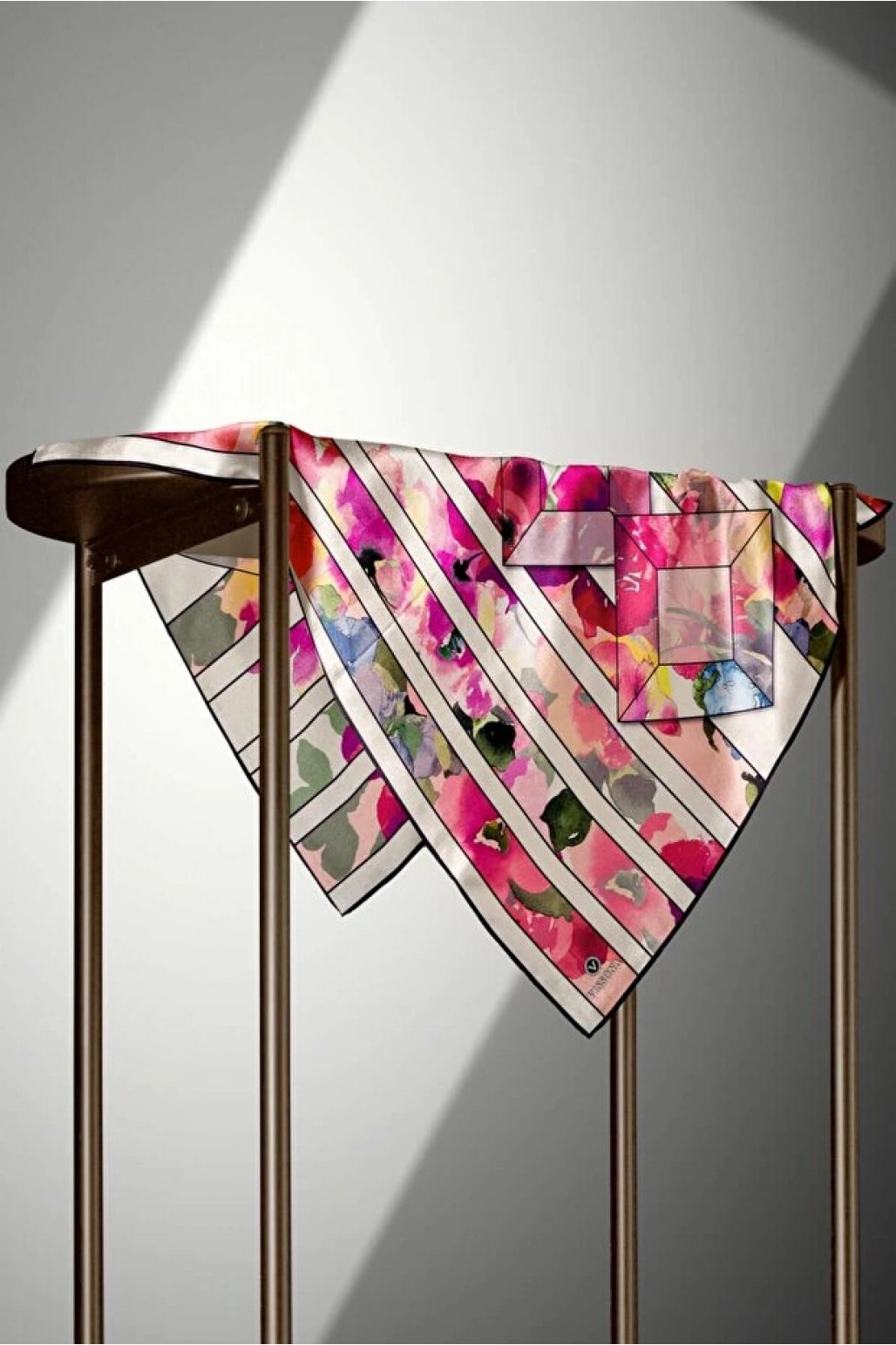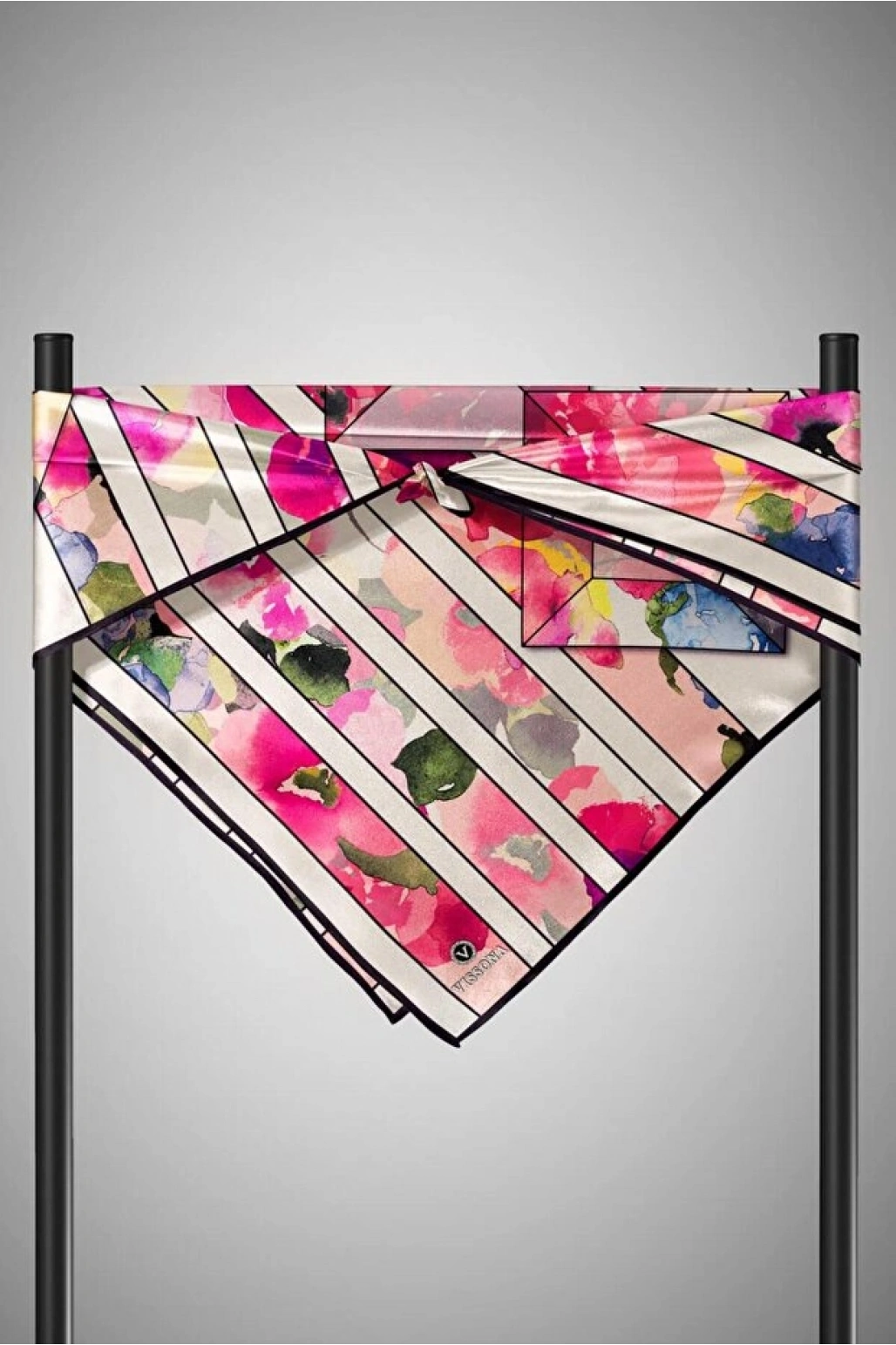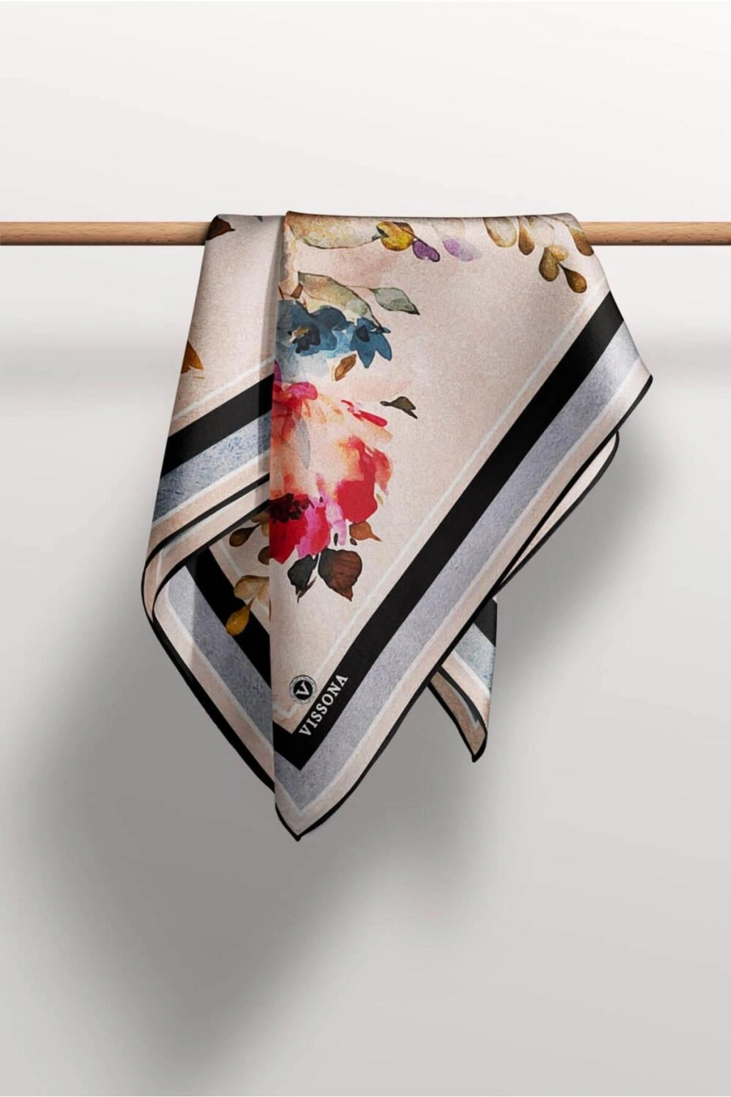 Vissona %100 Twill İpek Çizgili Çiçek Desenli Taba - Siyah Renkli 90x90 Eşarp Dikim Şekli : El Dikişi