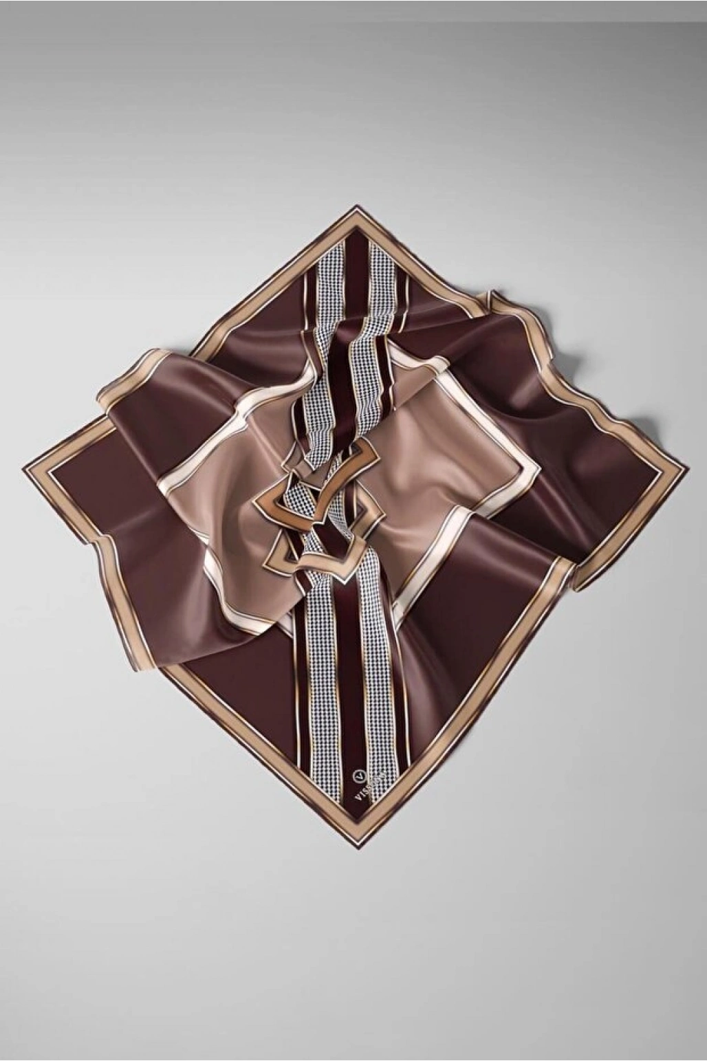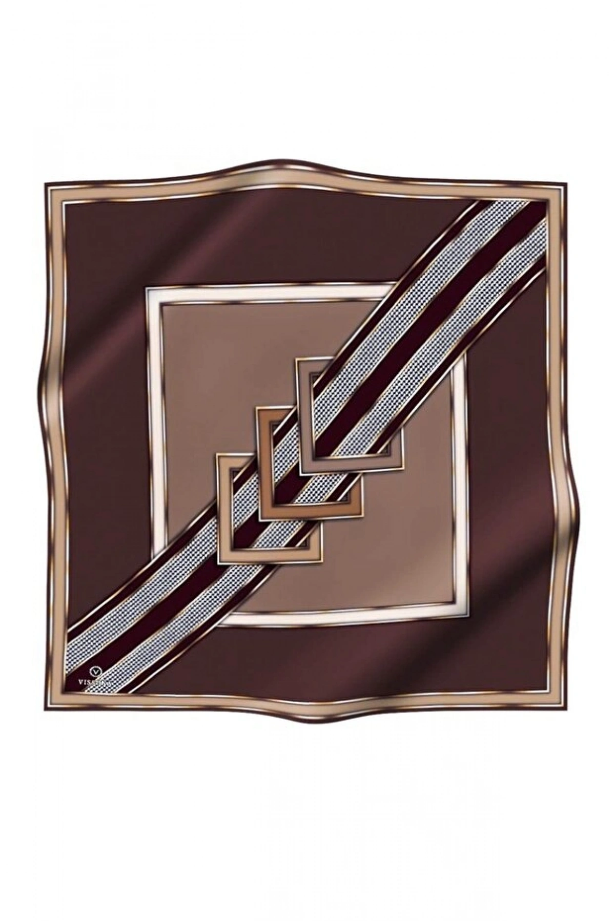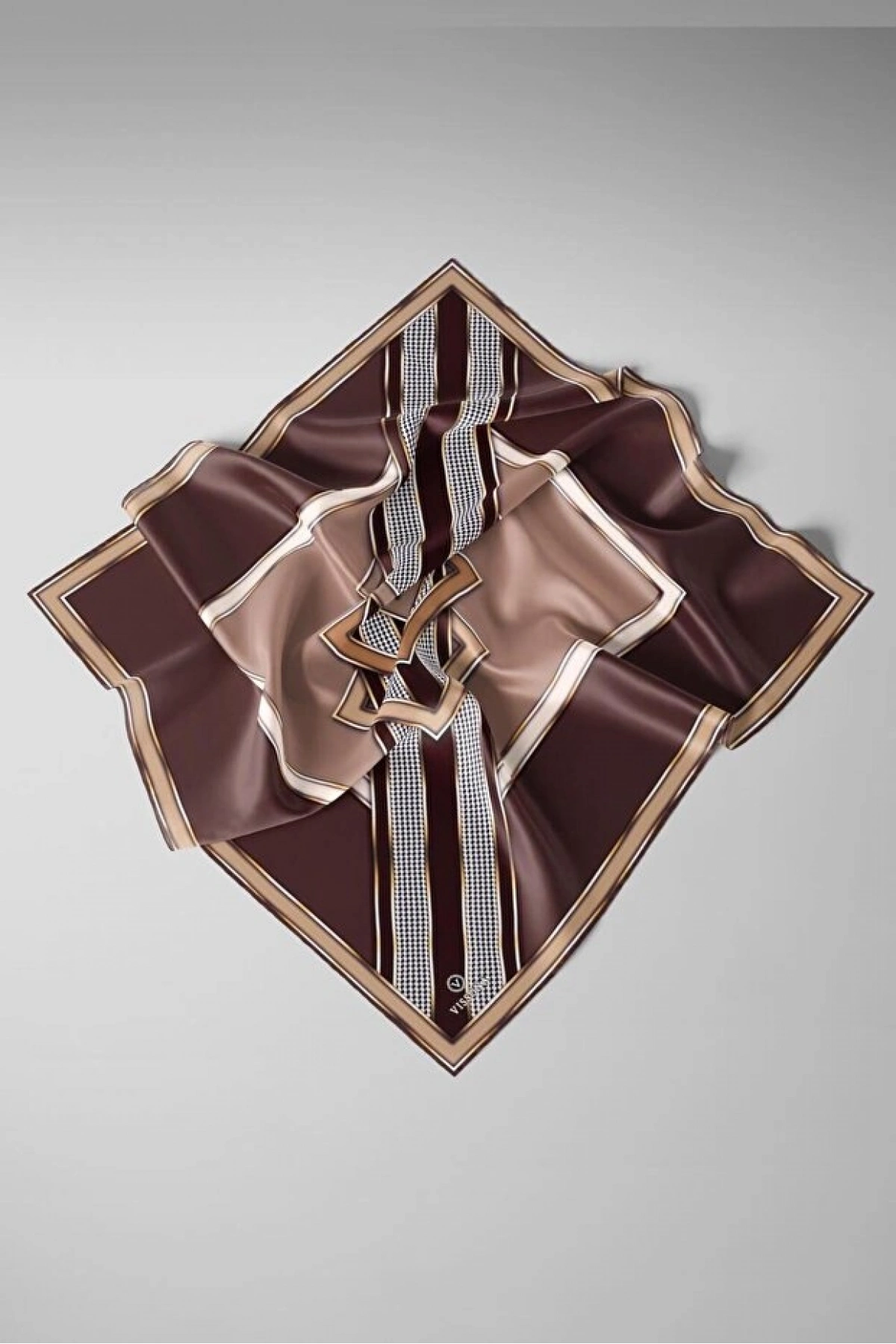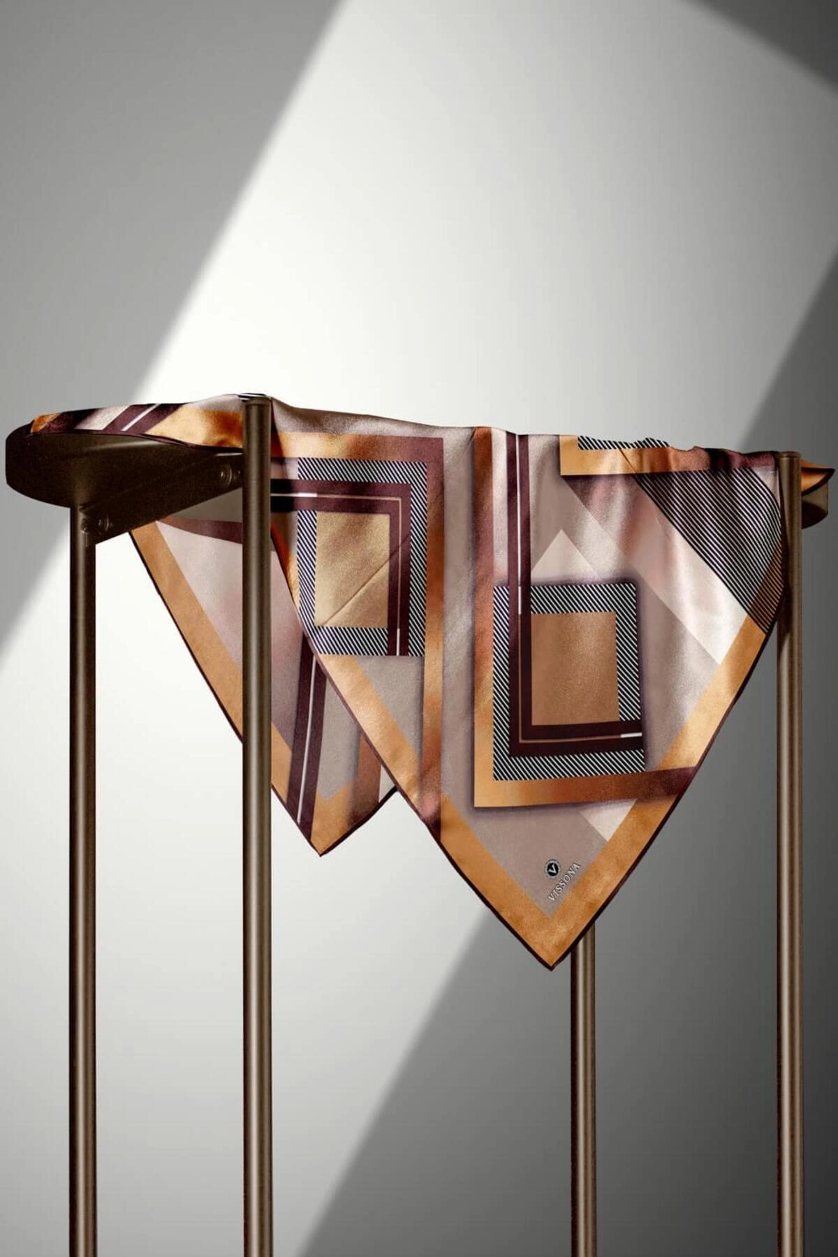 Vissona %100 Twill İpek Kareli Kazayaklı Desenli Kahverengi - Vizon Renkli 90x90 Eşarp Kenar Dikiş Şekli El