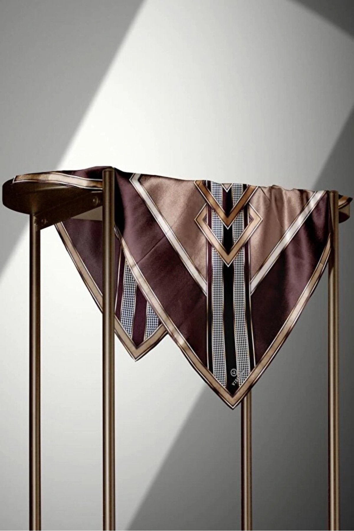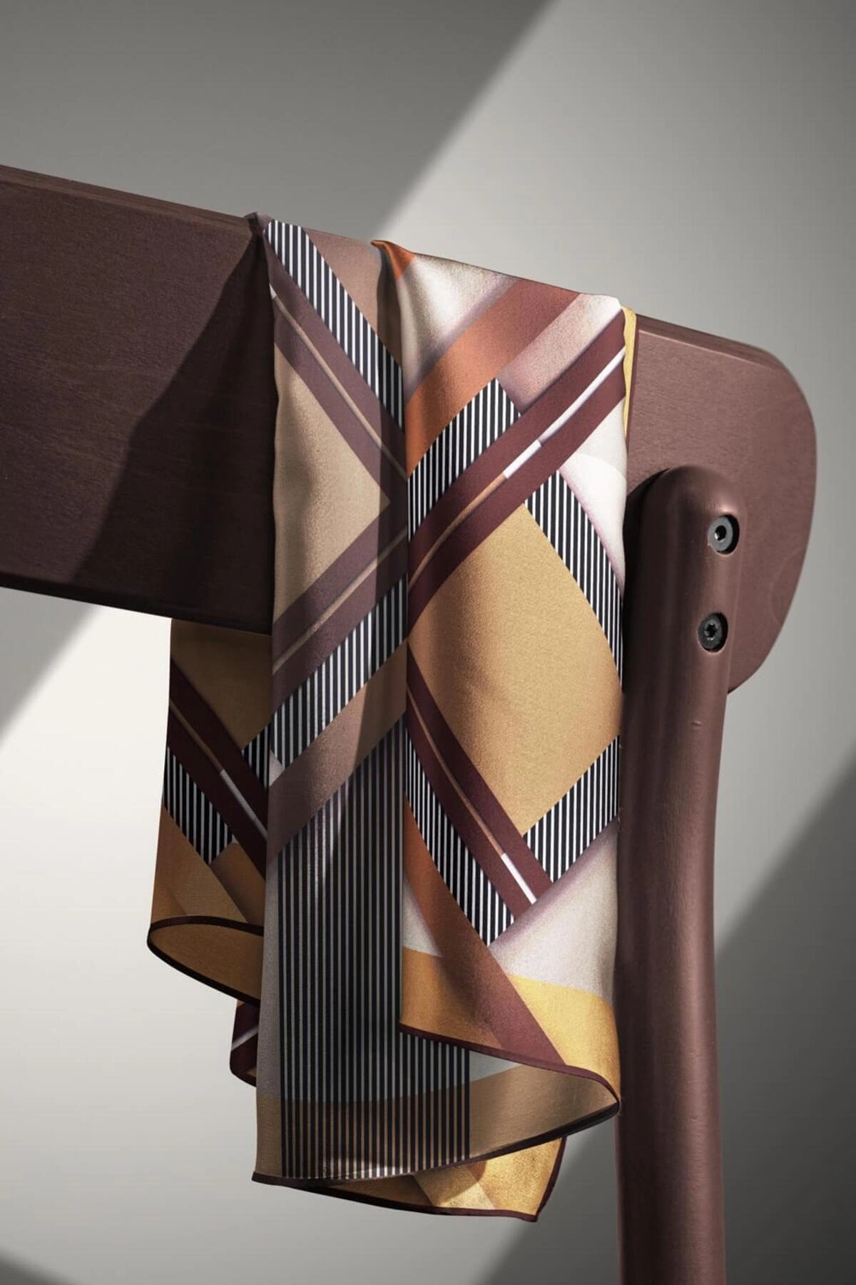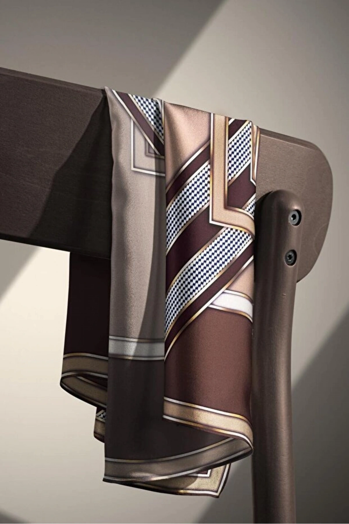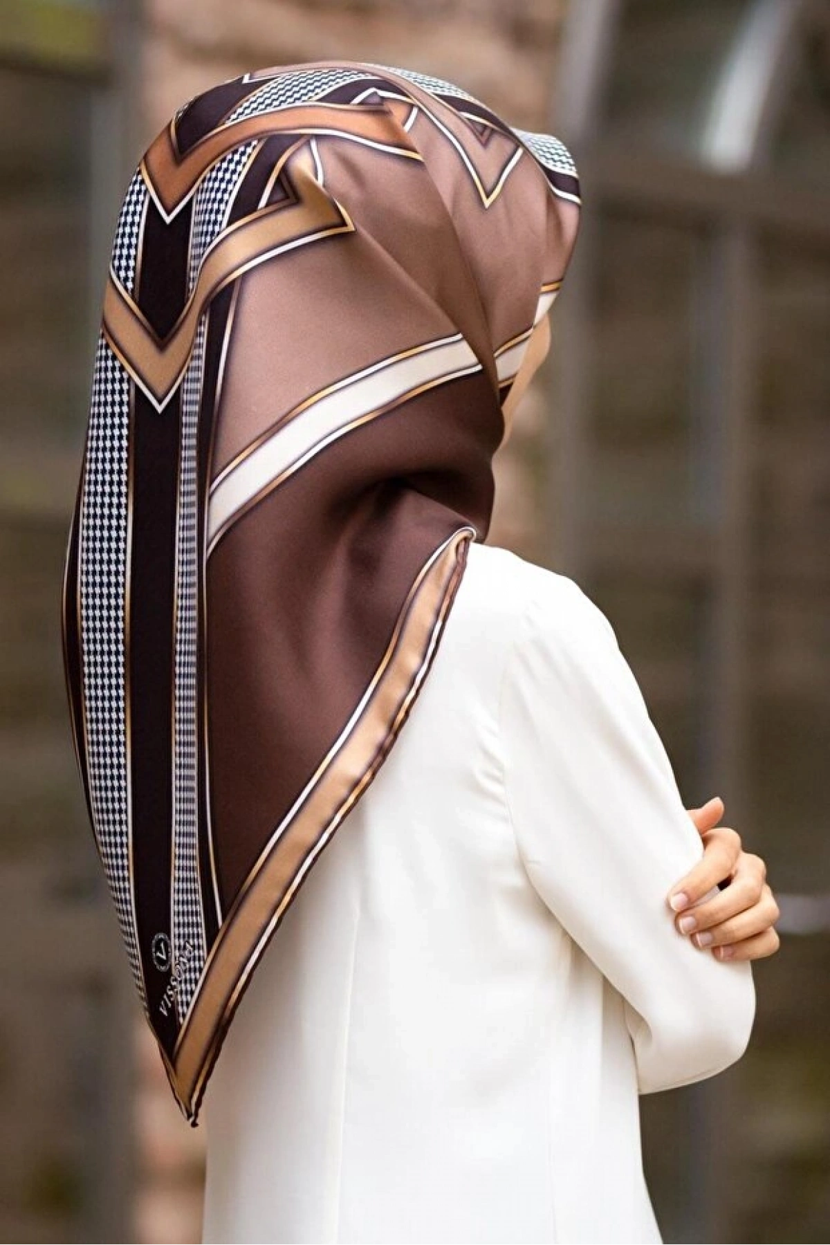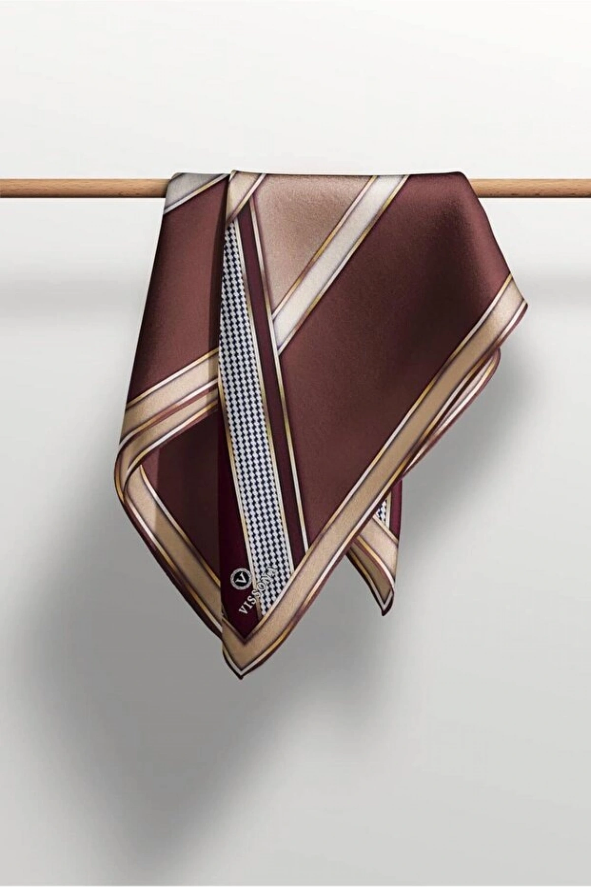 Vissona %100 Twill İpek Kareli Kazayaklı Desenli Kahverengi - Vizon Renkli 90x90 Eşarp Kenar Dikiş Şekli El