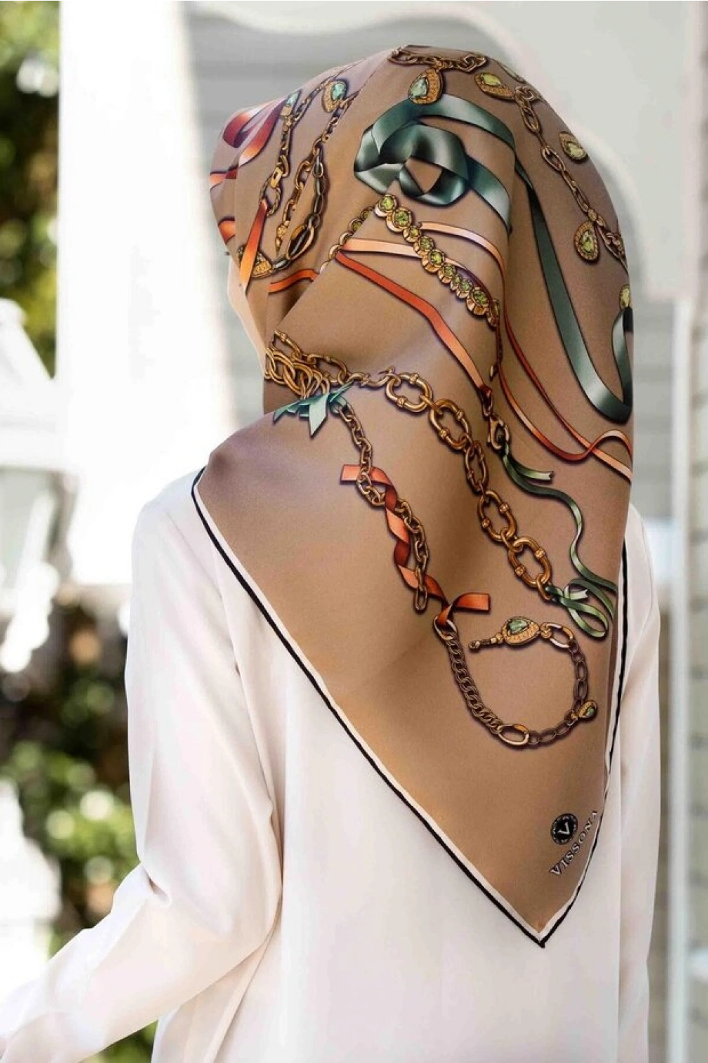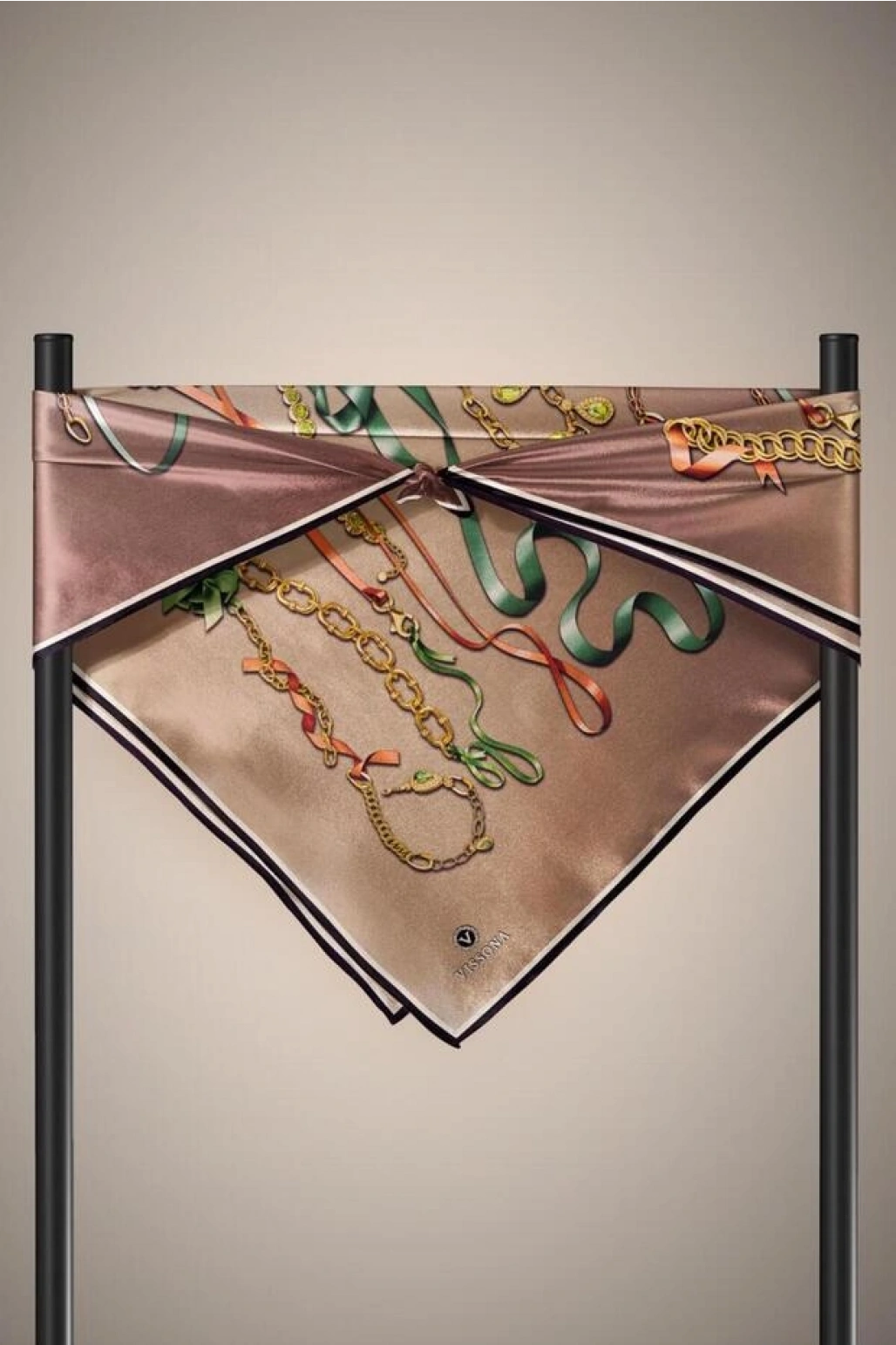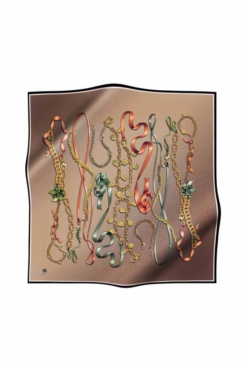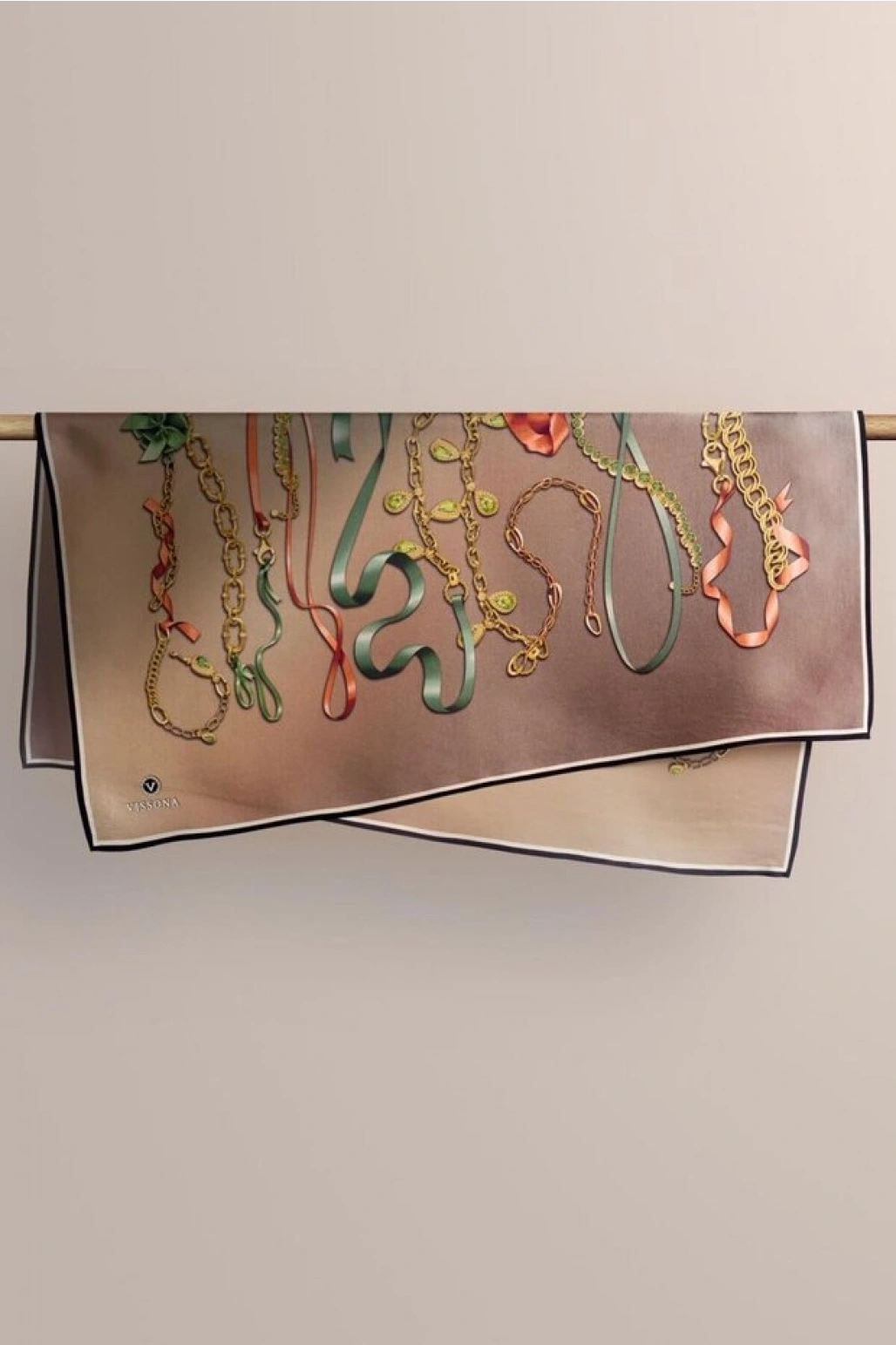 Vissona %100 Twill İpek Kurdele Ve Zincir Desenli Bej Renkli 90x90 Eşarp Dikim Şekli : El Dikişi
