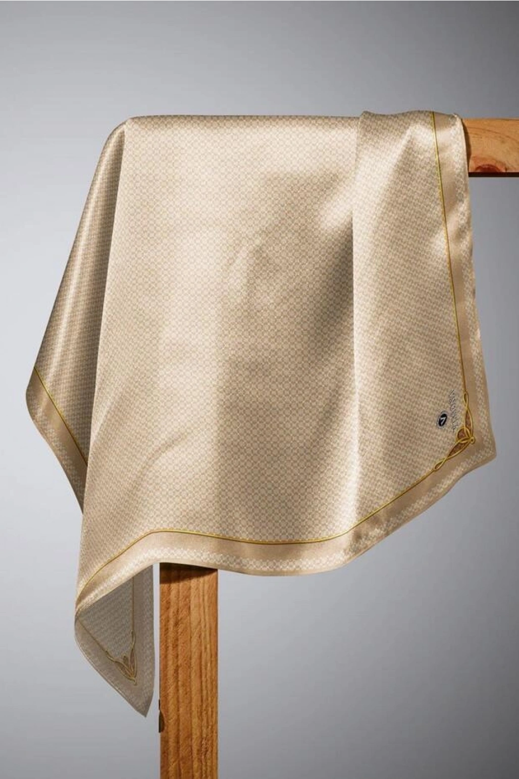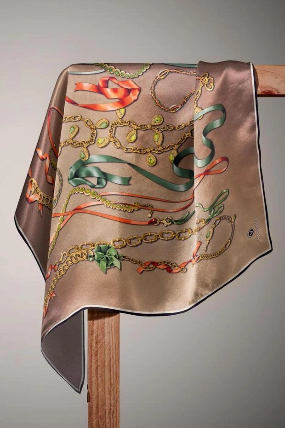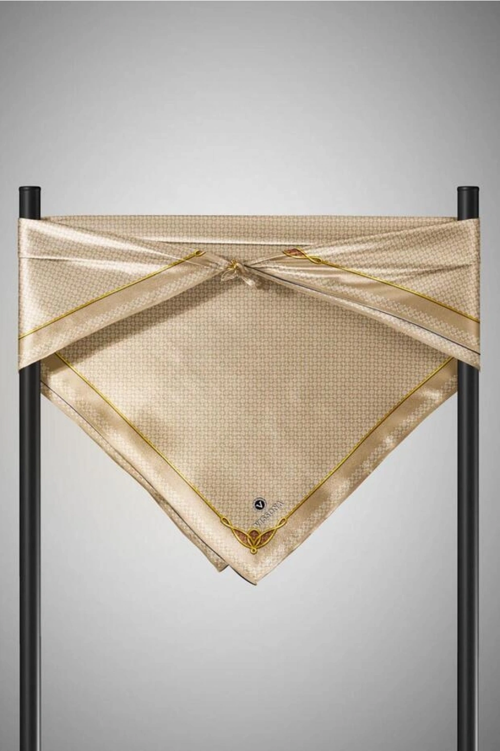 Vissona %100 Twill İpek Kurdele Ve Zincir Desenli Bej Renkli 90x90 Eşarp Dikim Şekli : El Dikişi