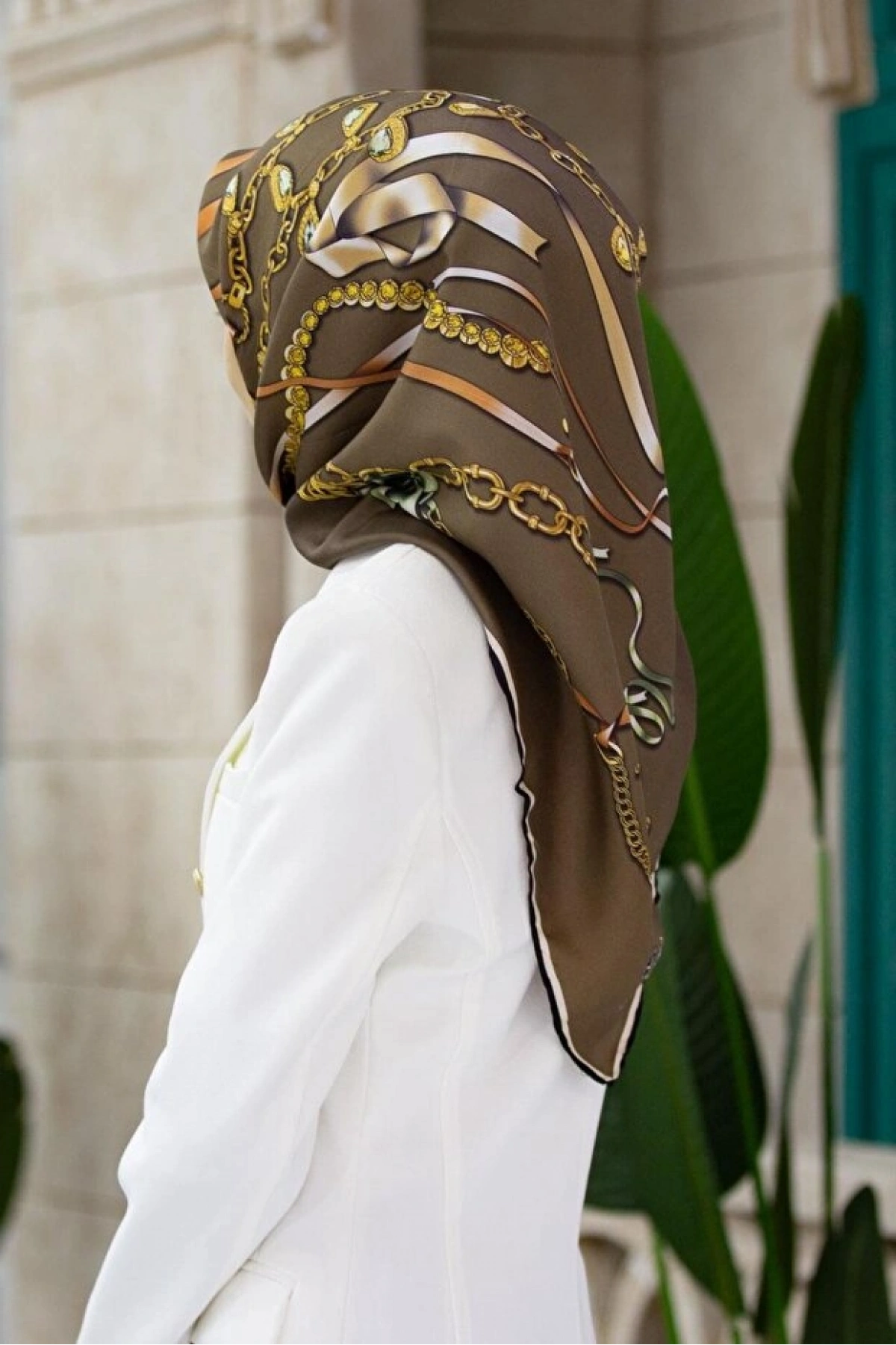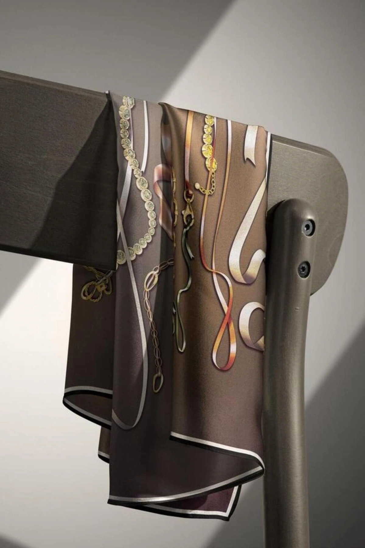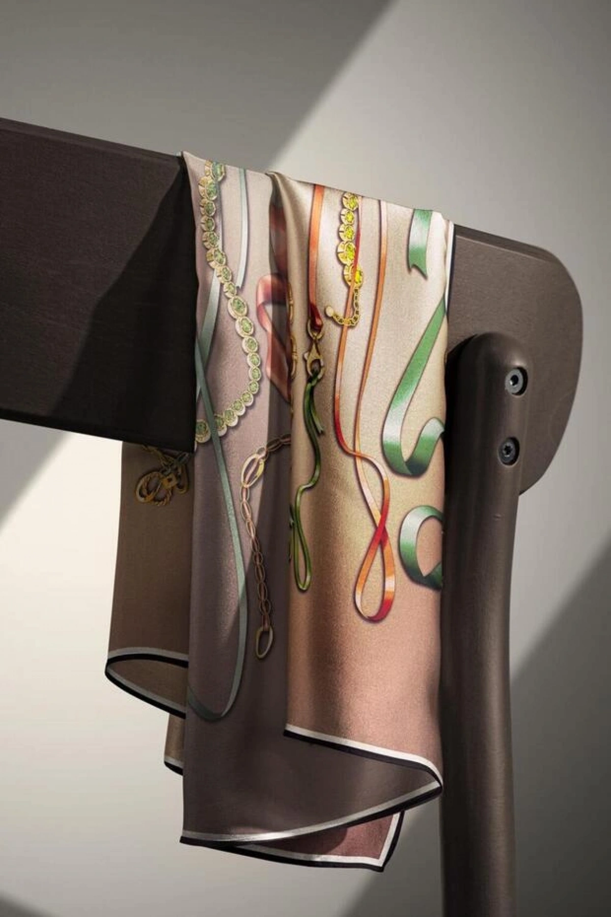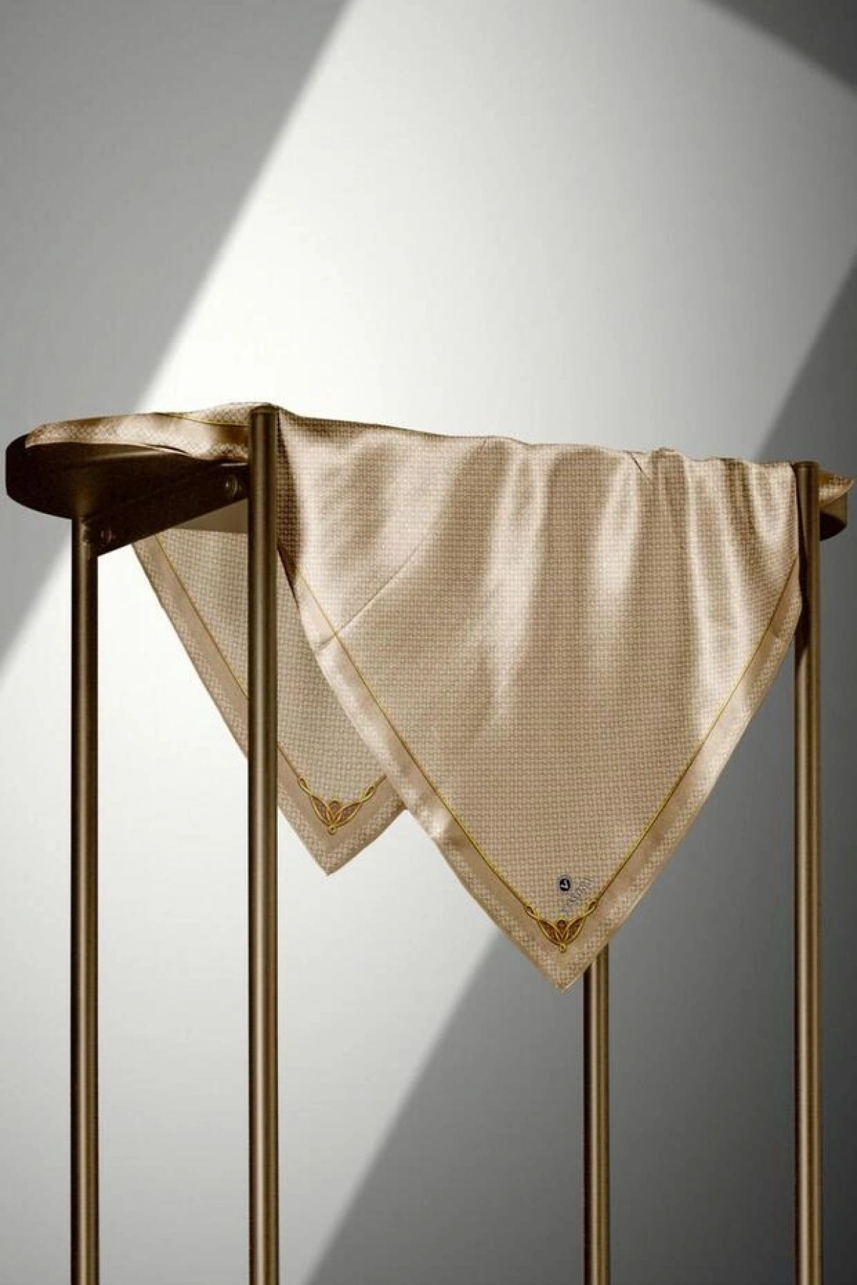 Vissona %100 Twill İpek Kurdele Ve Zincir Desenli Bej Renkli 90x90 Eşarp Dikim Şekli : El Dikişi