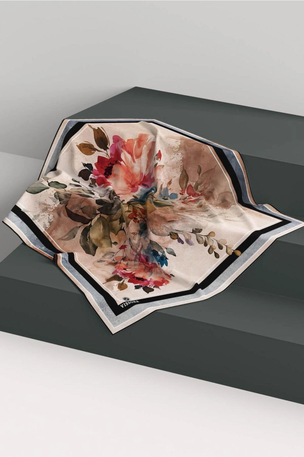 Vissona %100 Twill İpek Bahar Çiçekleri Desenli Siyah - Haki Renkli 90x90 Eşarp Dikim Şekli : El Dikişi