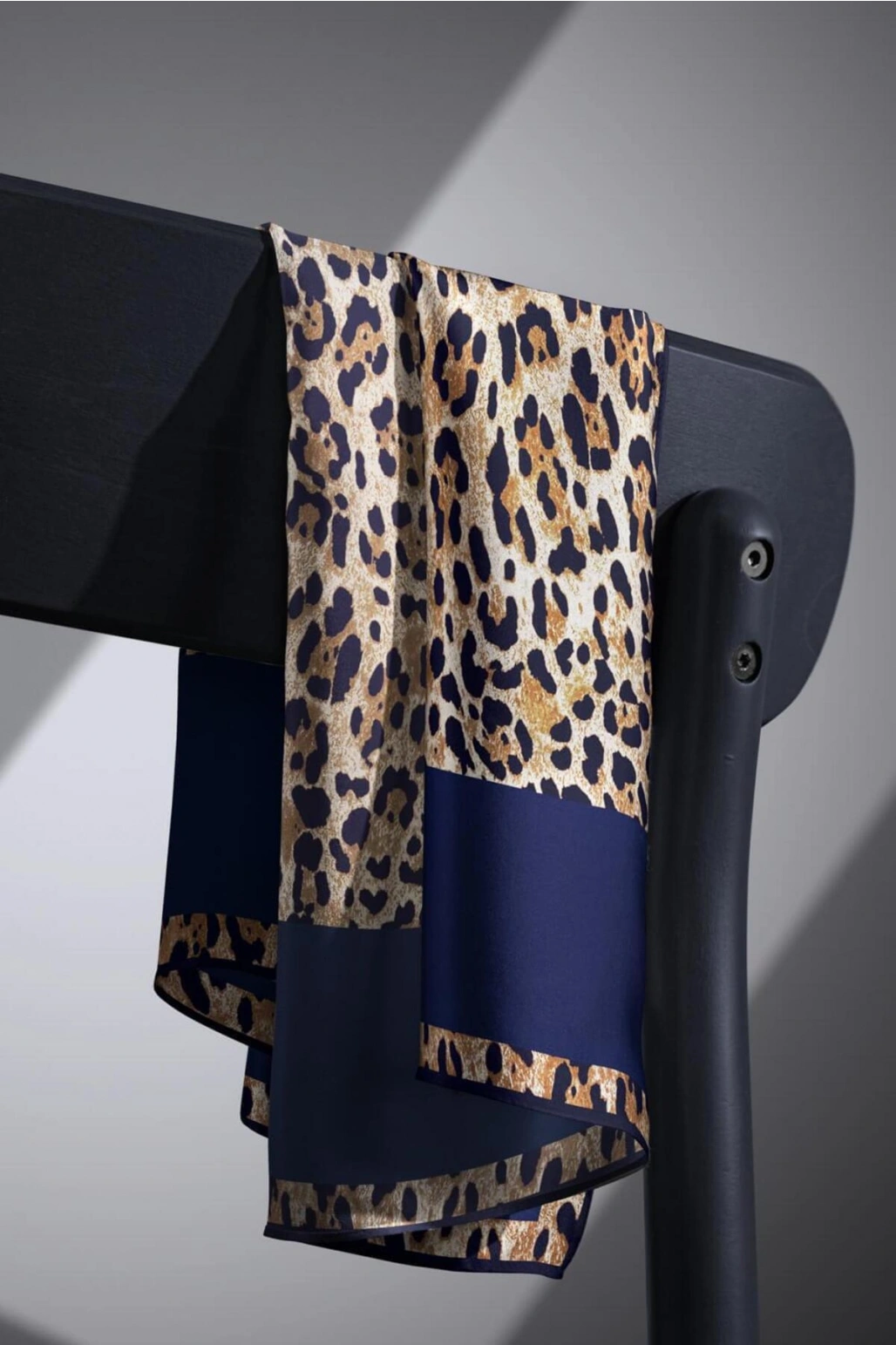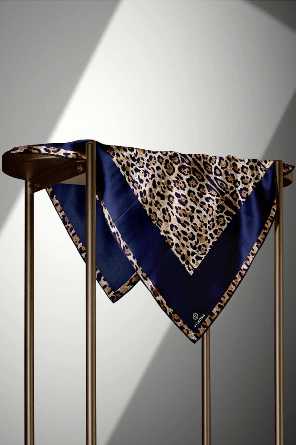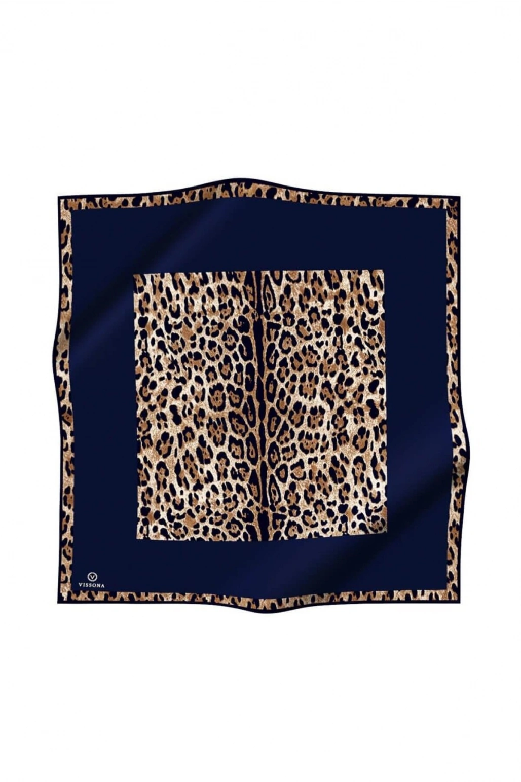 Vissona %100 Twill İpek Leopar Desenli Lacivert Renkli 90x90 Eşarp Dikim Şekli : El Dikişi