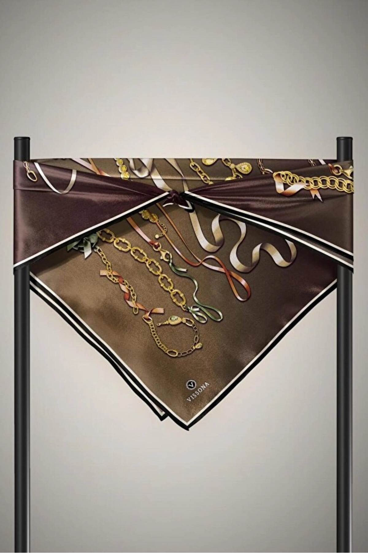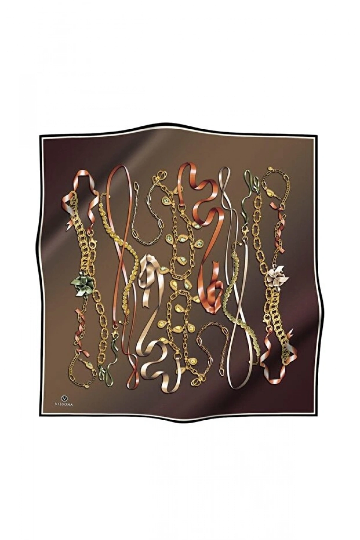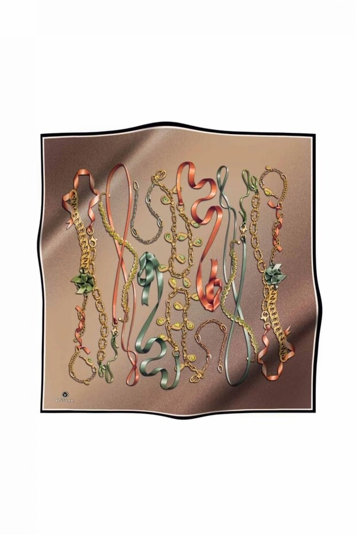 Vissona %100 Twill İpek Kurdele Ve Zincir Desenli Bakır - Turuncu Renkli 90x90 Eşarp Dikim Şekli : El Dikişi