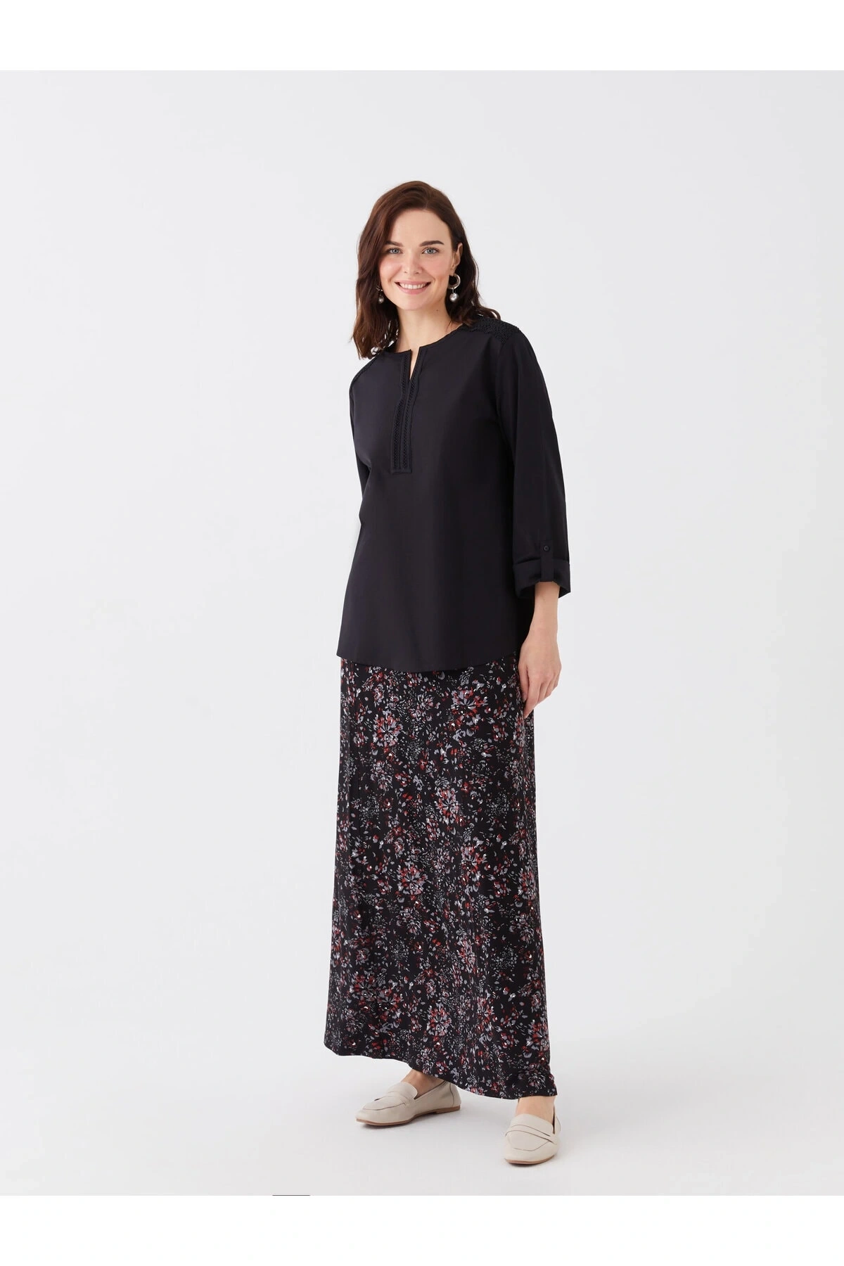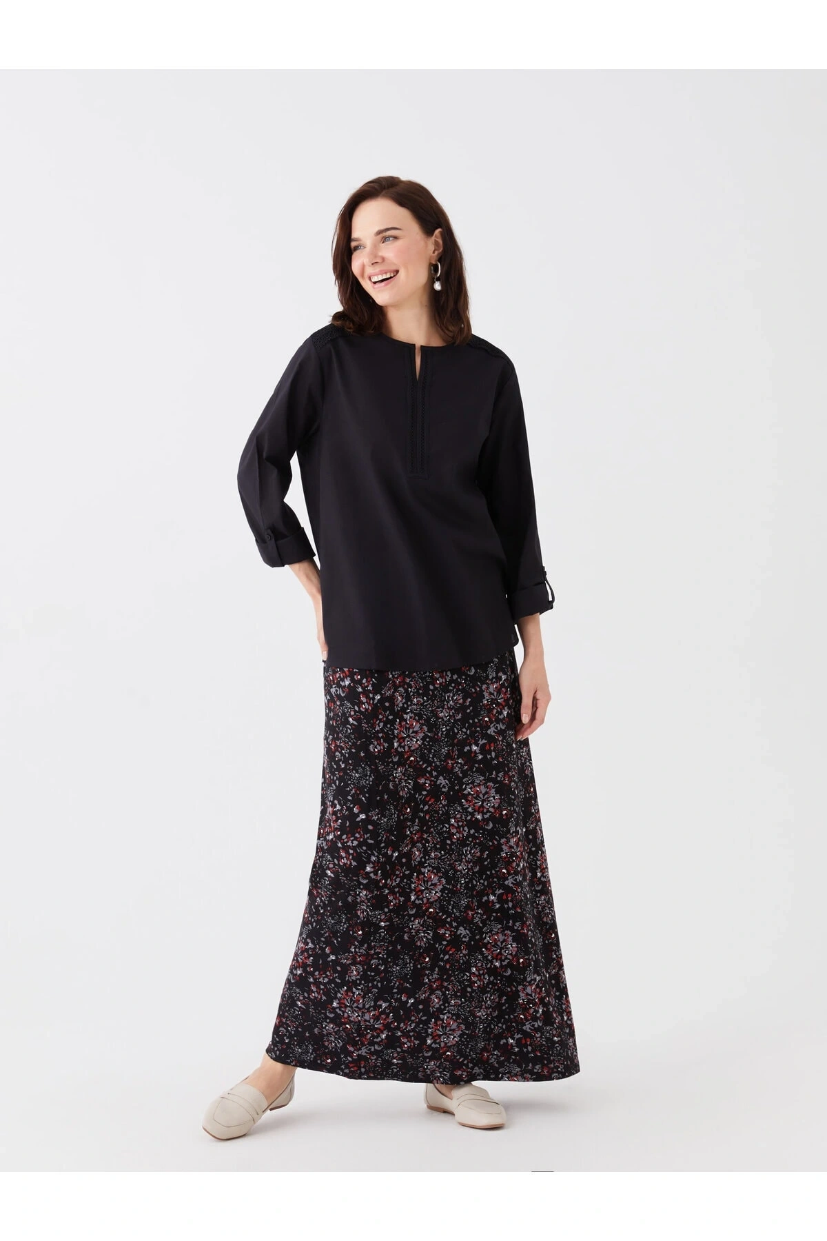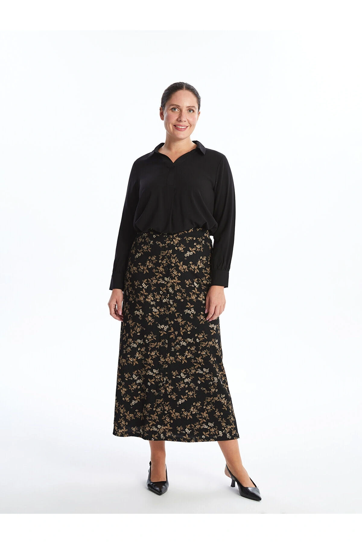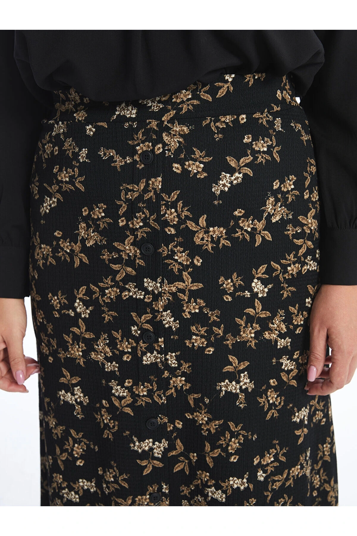 LCW Grace Siyah Beli Lastikli Çiçekli A Kesim Kadın Etek