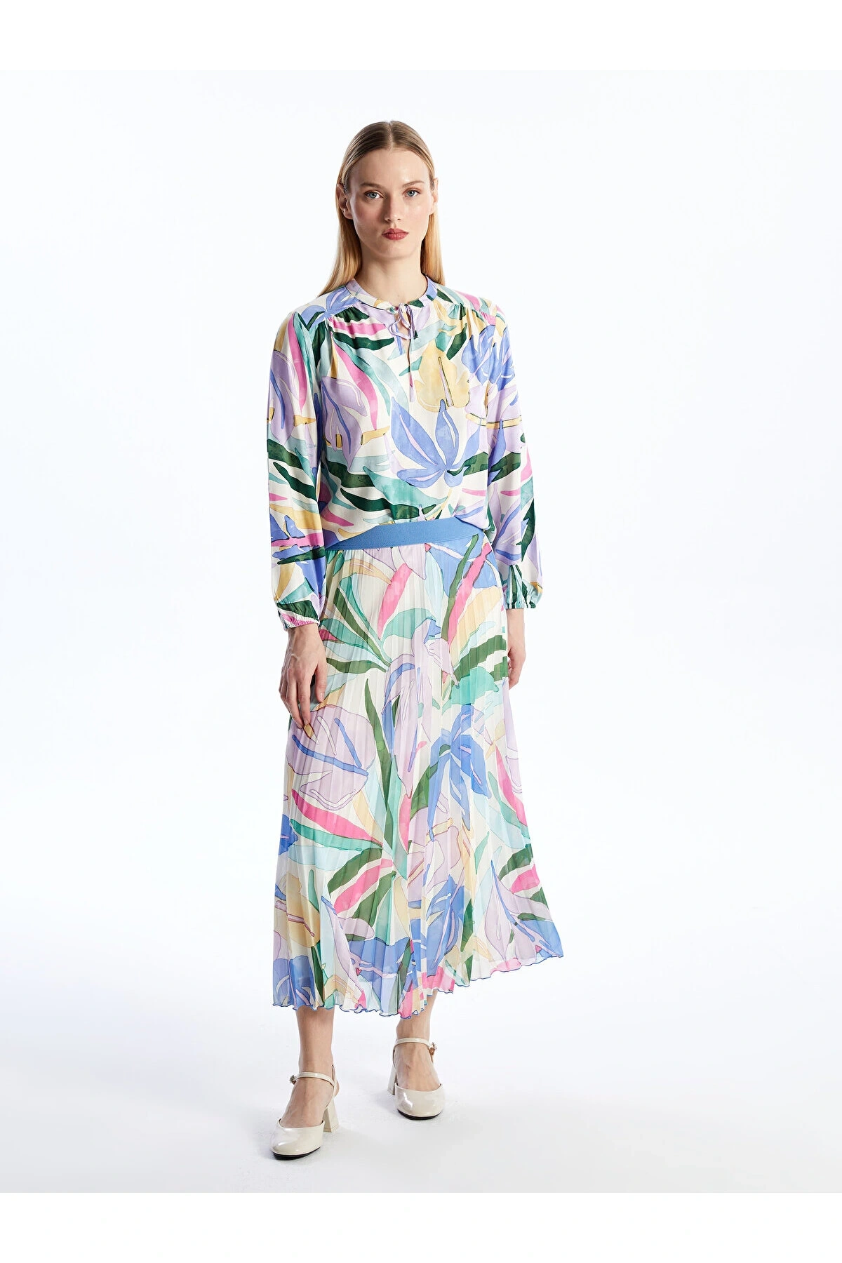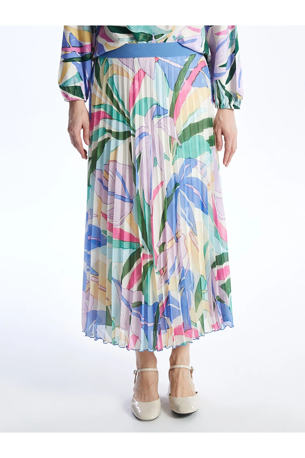 Beli Lastikli Desenli Şifon Kadın Pileli Etek