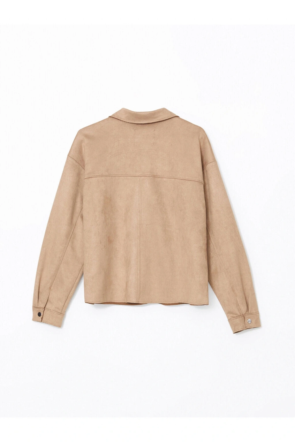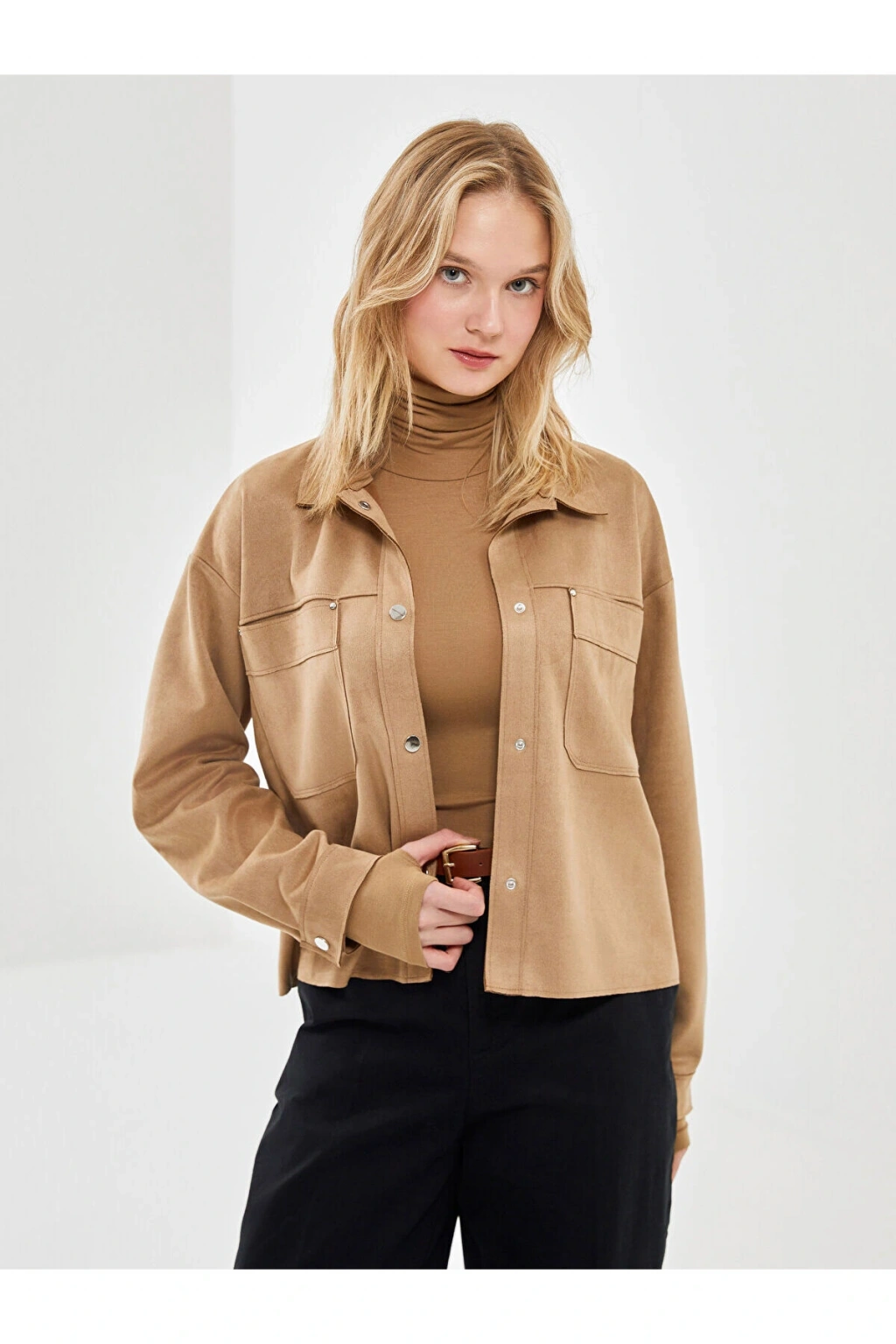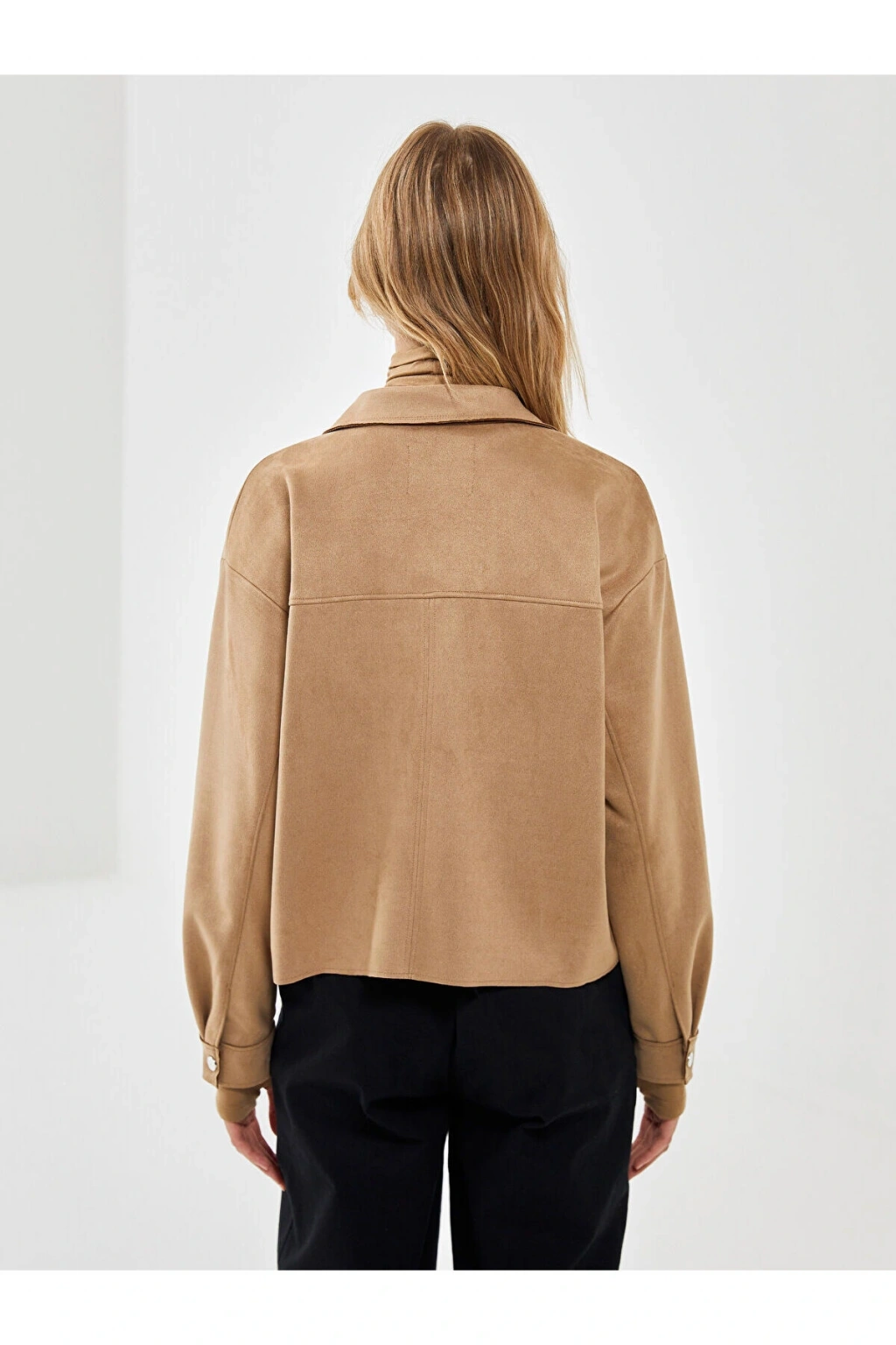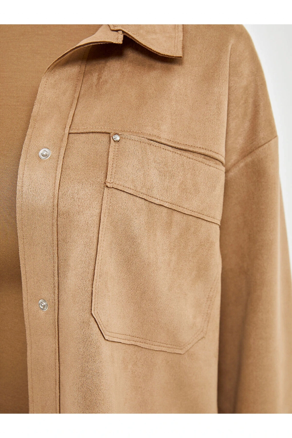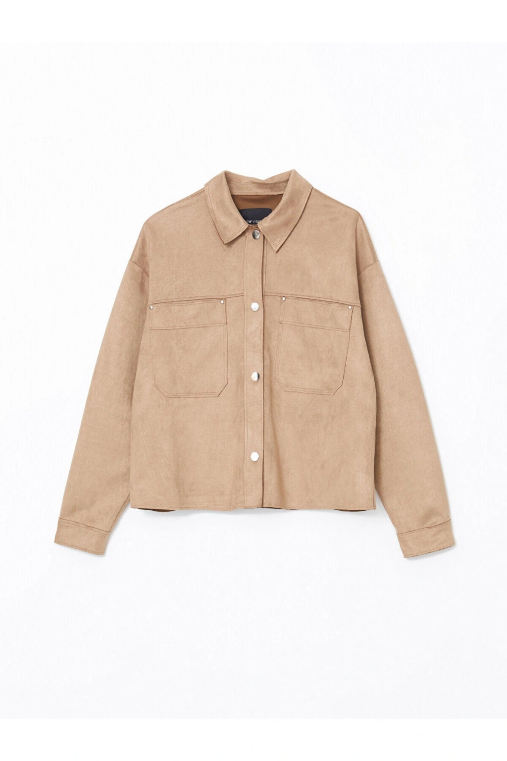 Gömlek yaka süet kadın ceket, önden çıtçıt kapamasıyla pratik bir kullanım sunar İki göğüs cebi ise hem işlevsel hem de şık bir detay katar