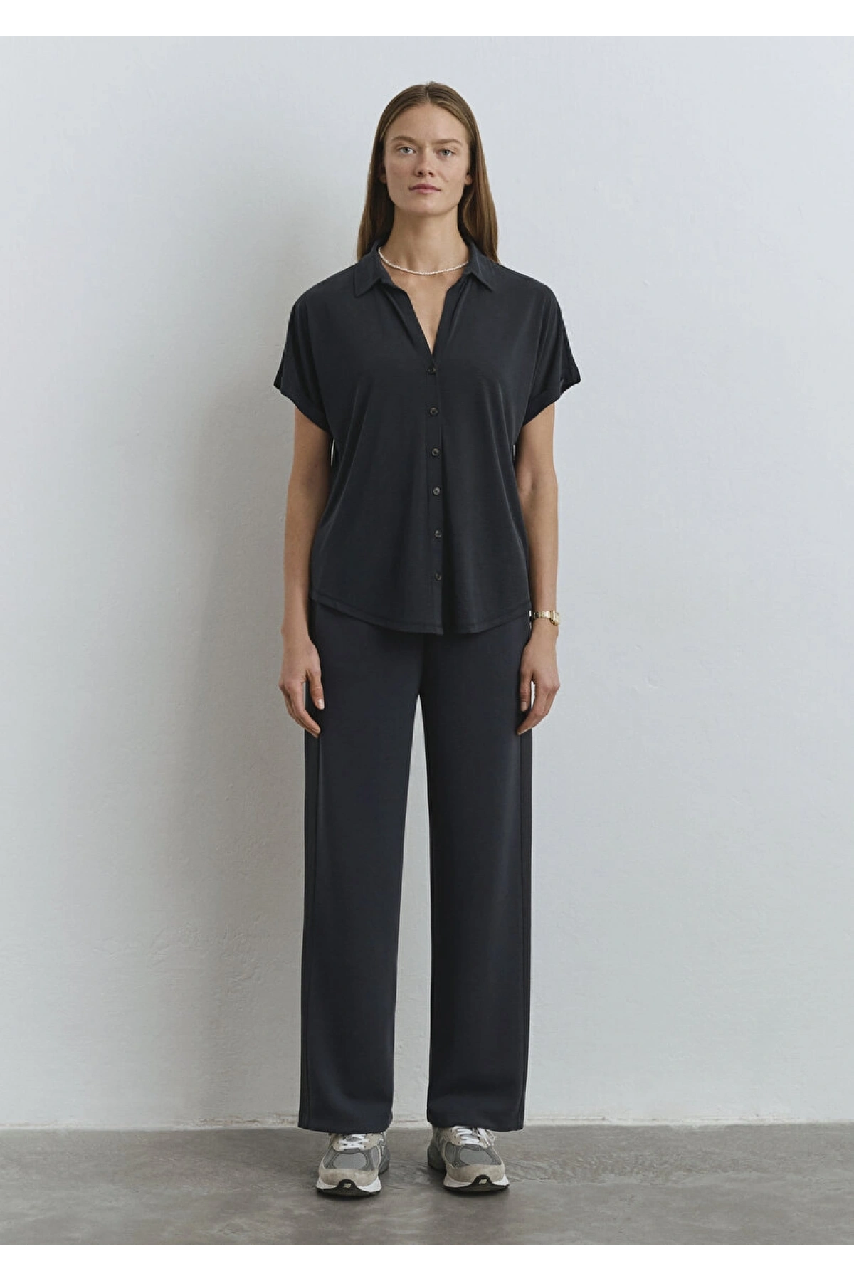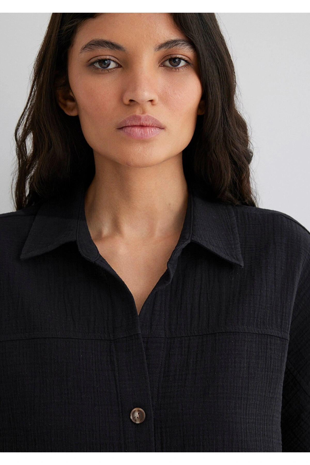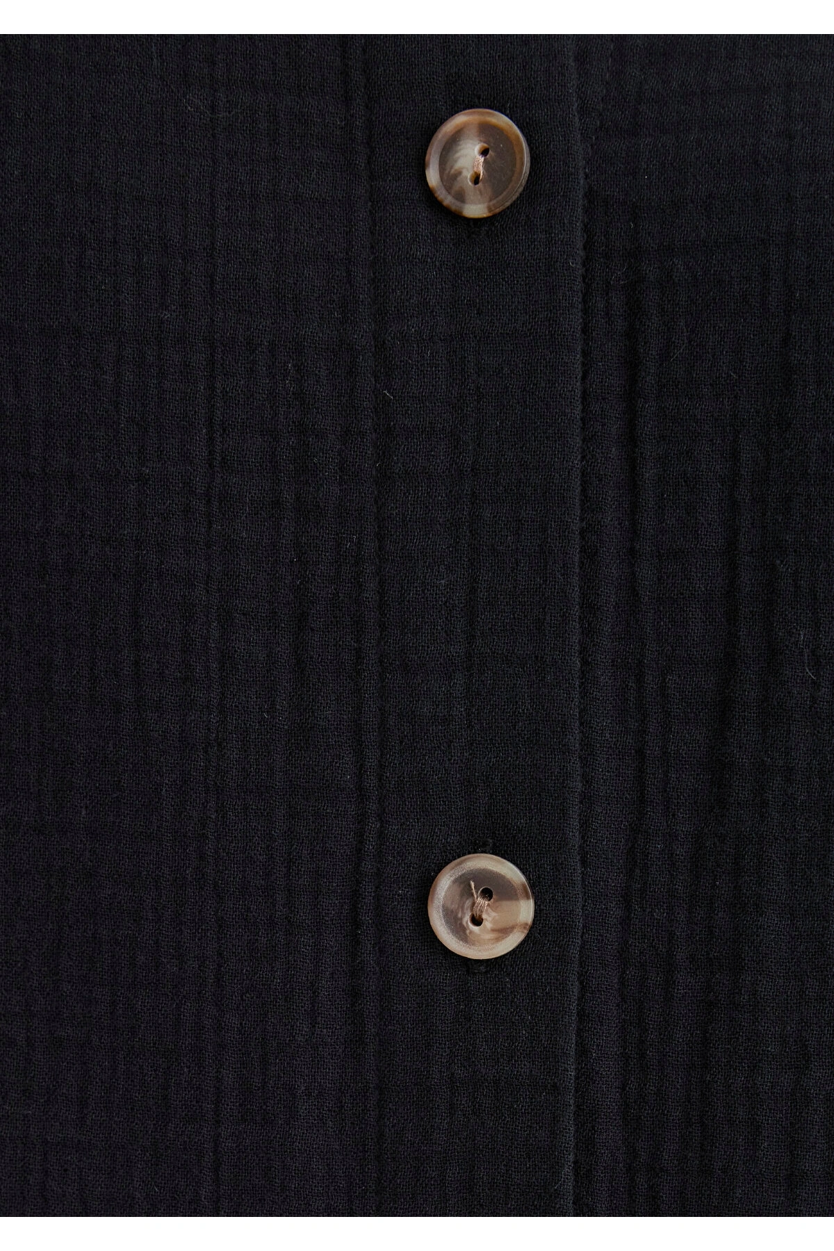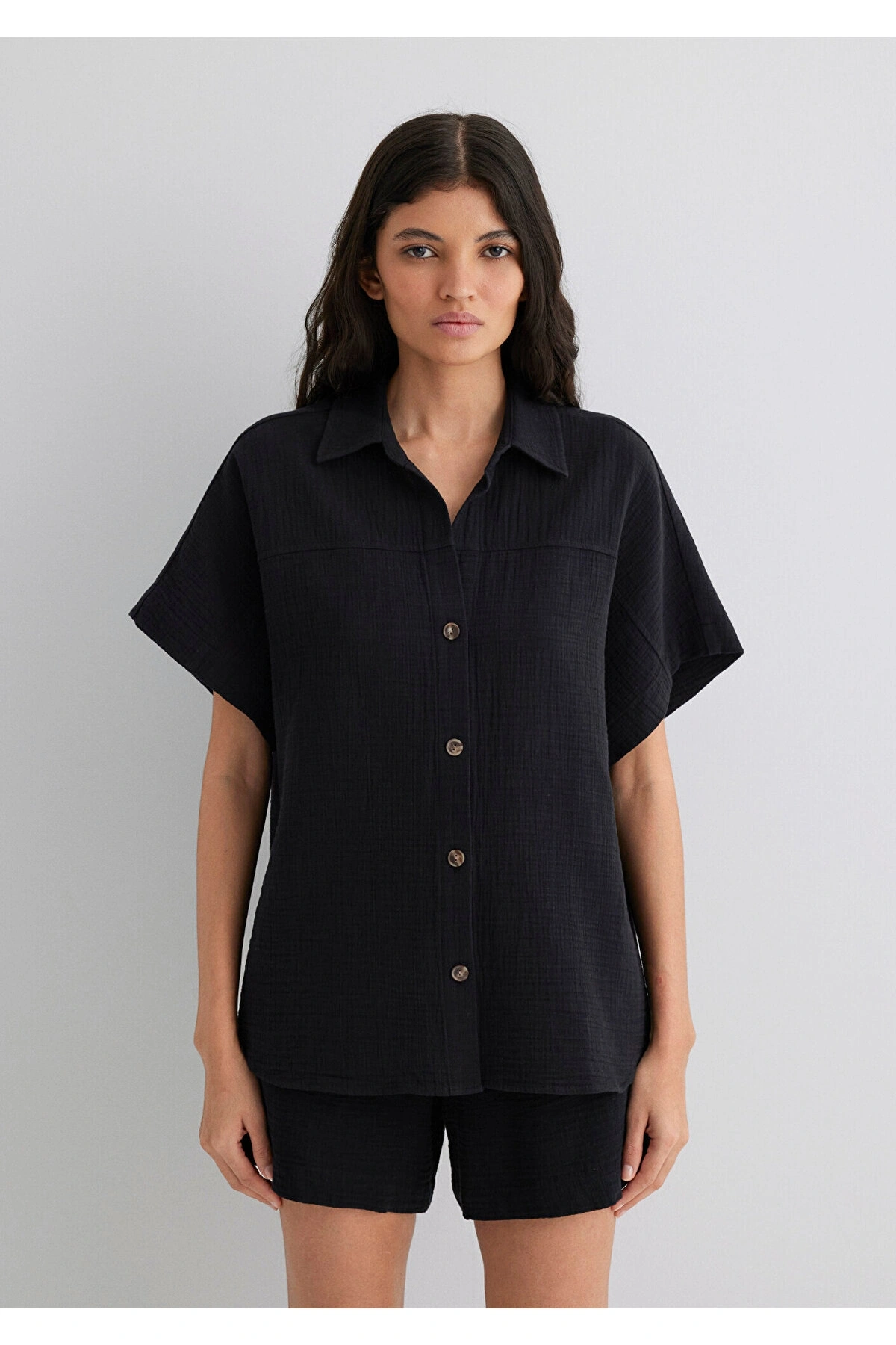 Mavi Dokulu Siyah Gömlek Loose Fit / Bol Rahat Kesim