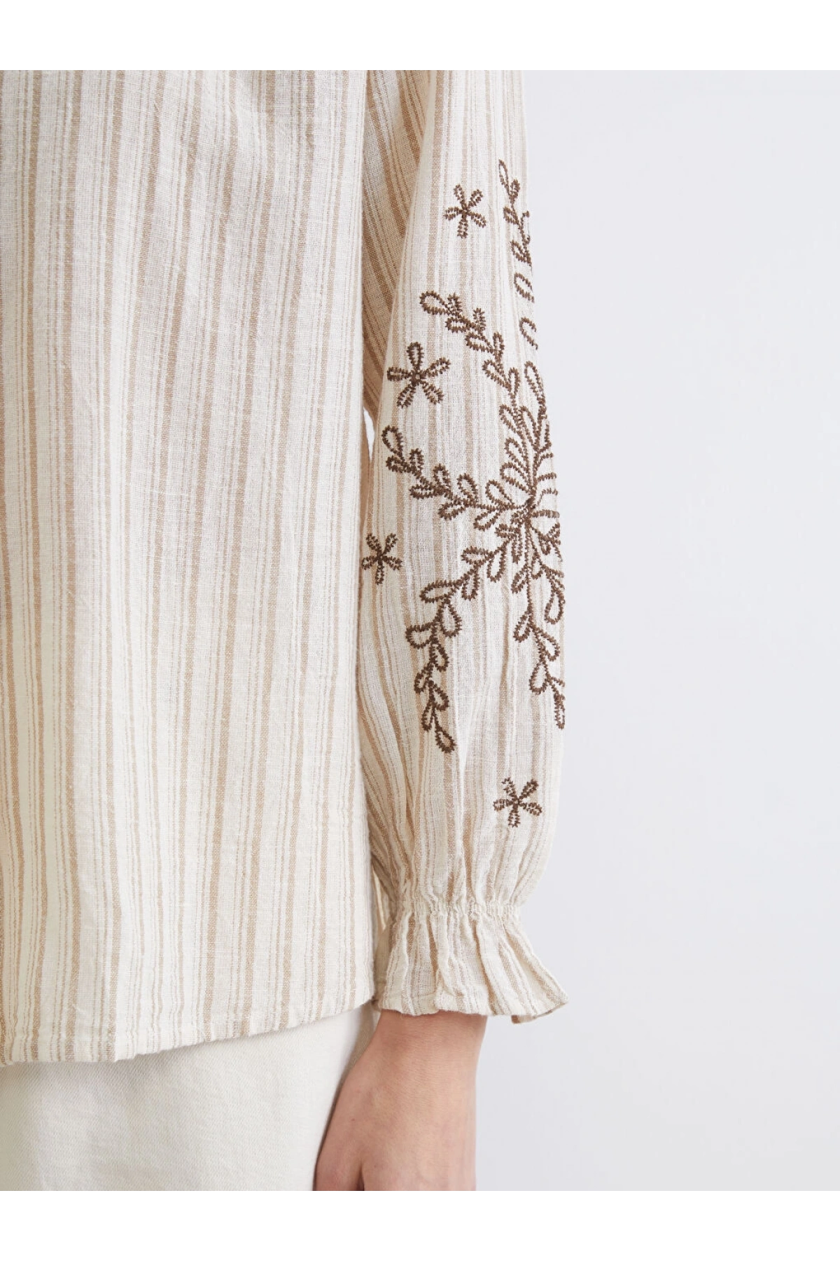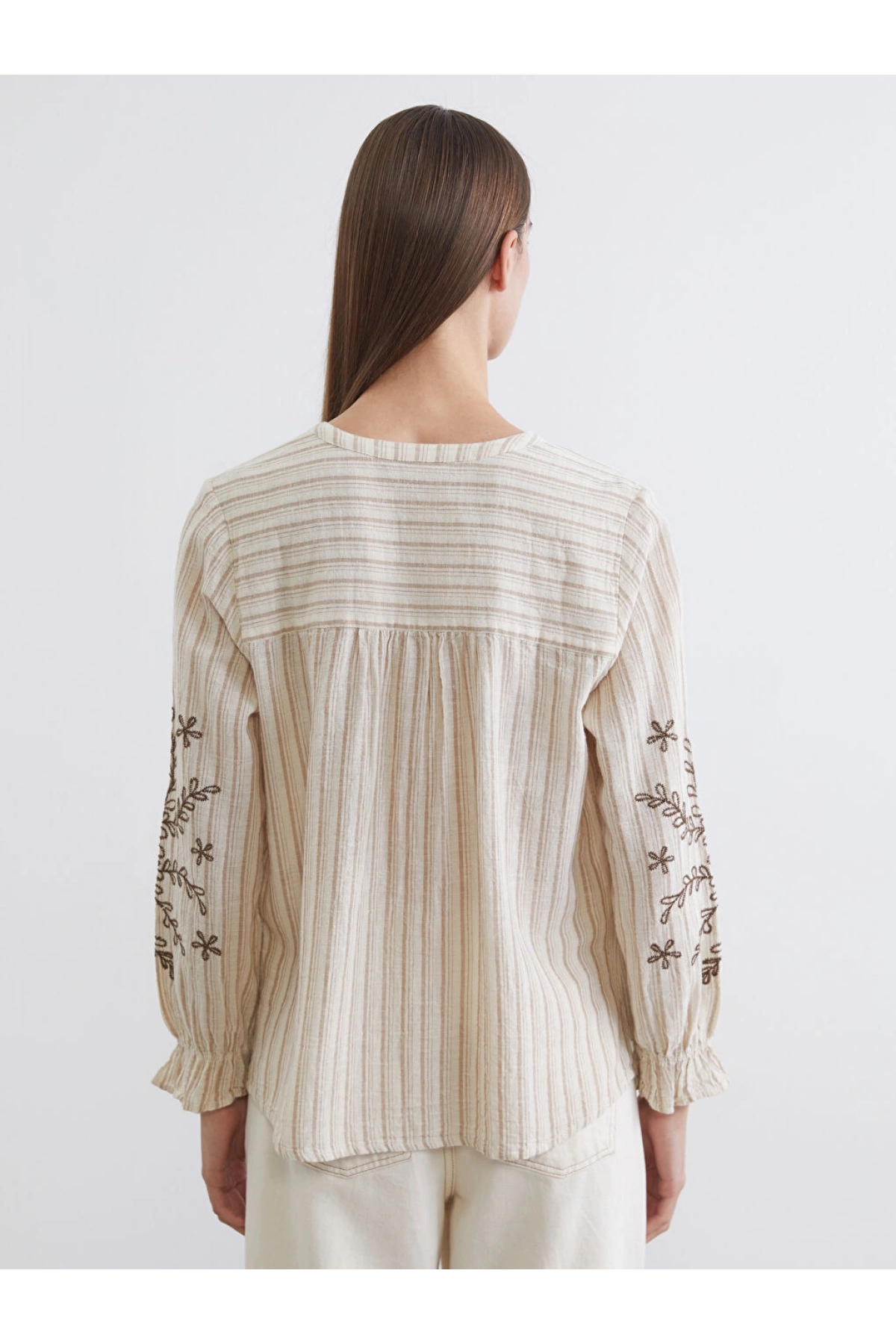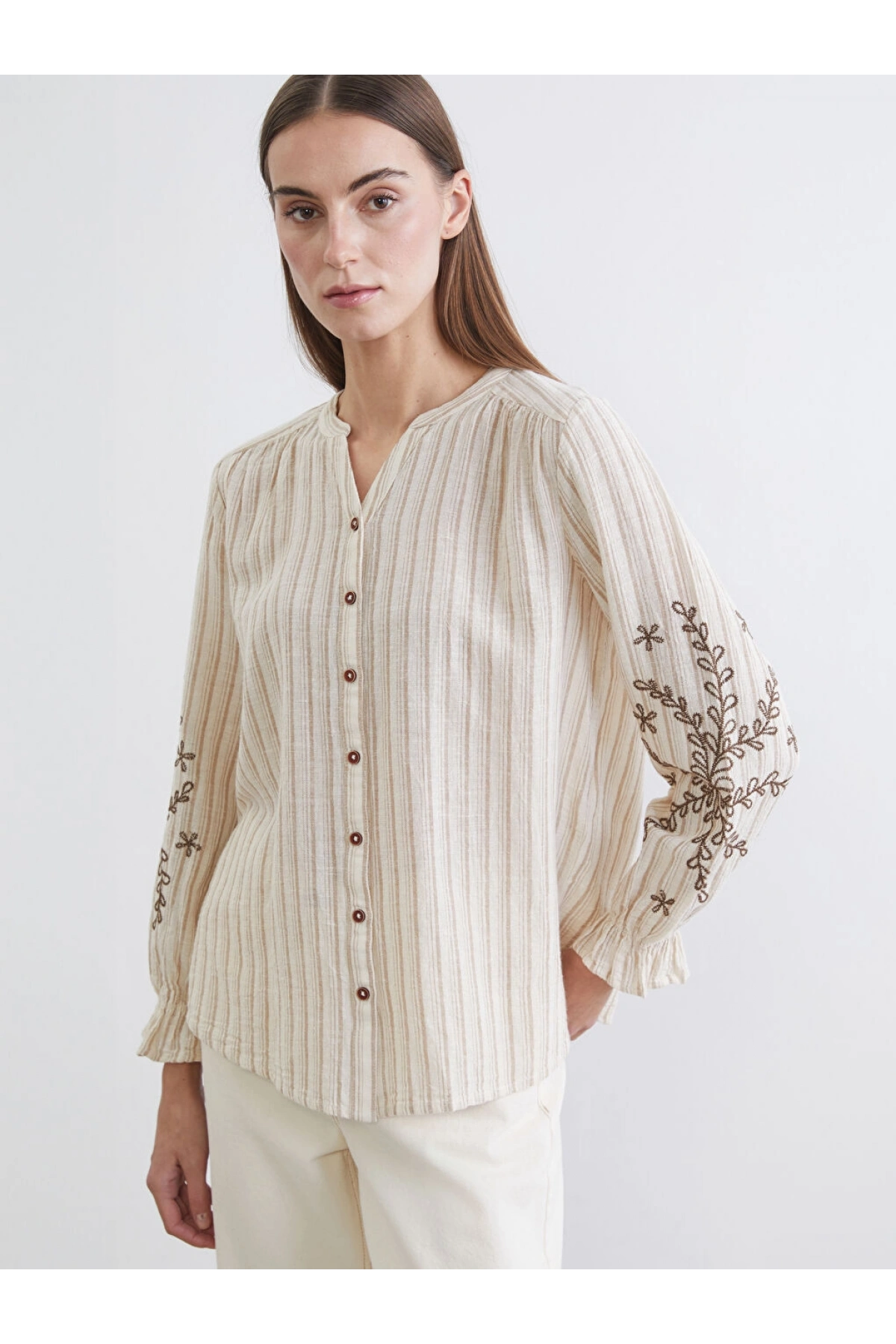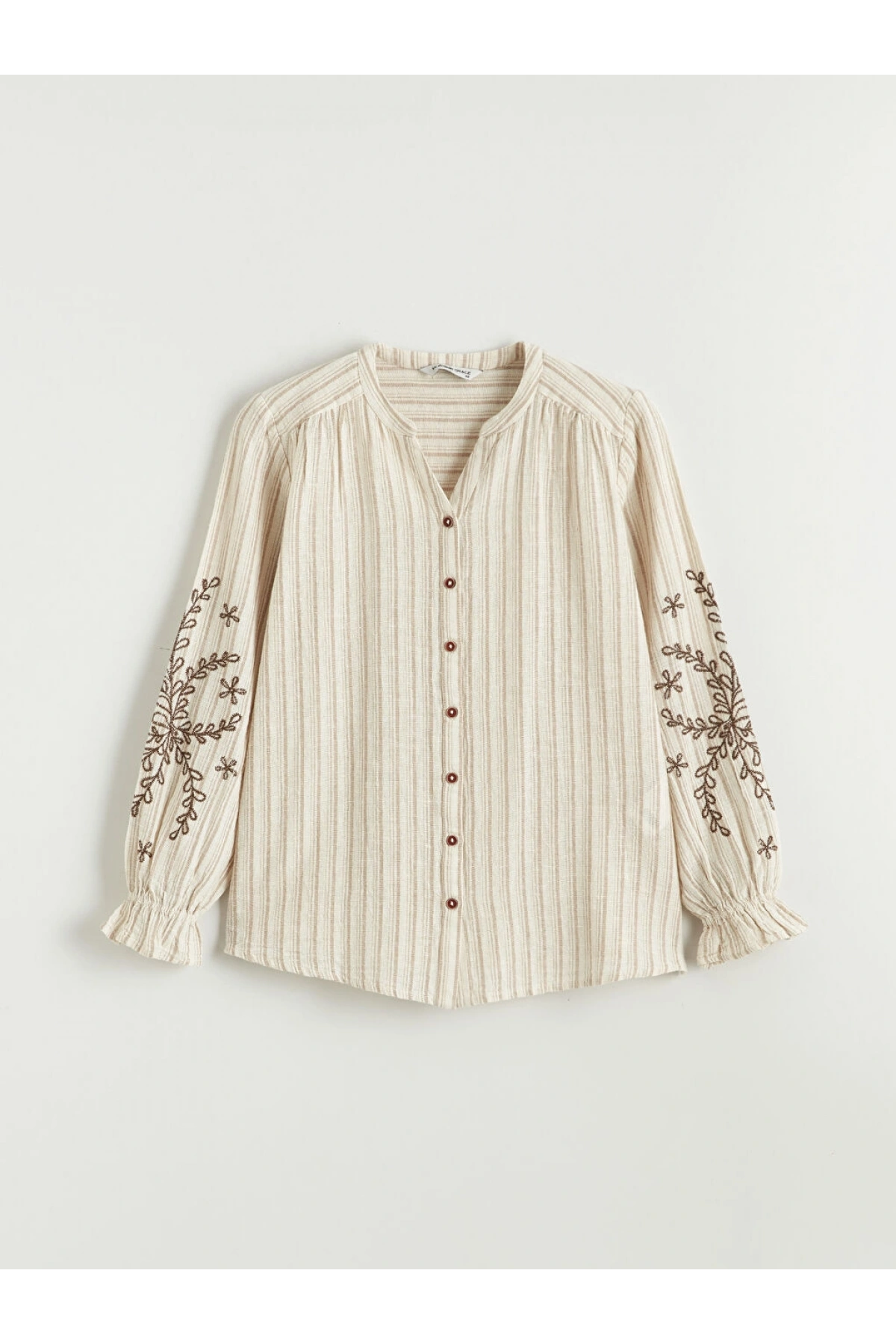 LCW Grace Kahverengi Kaçık Yaka Çizgili Keten Karışımlı Kadın Gömlek