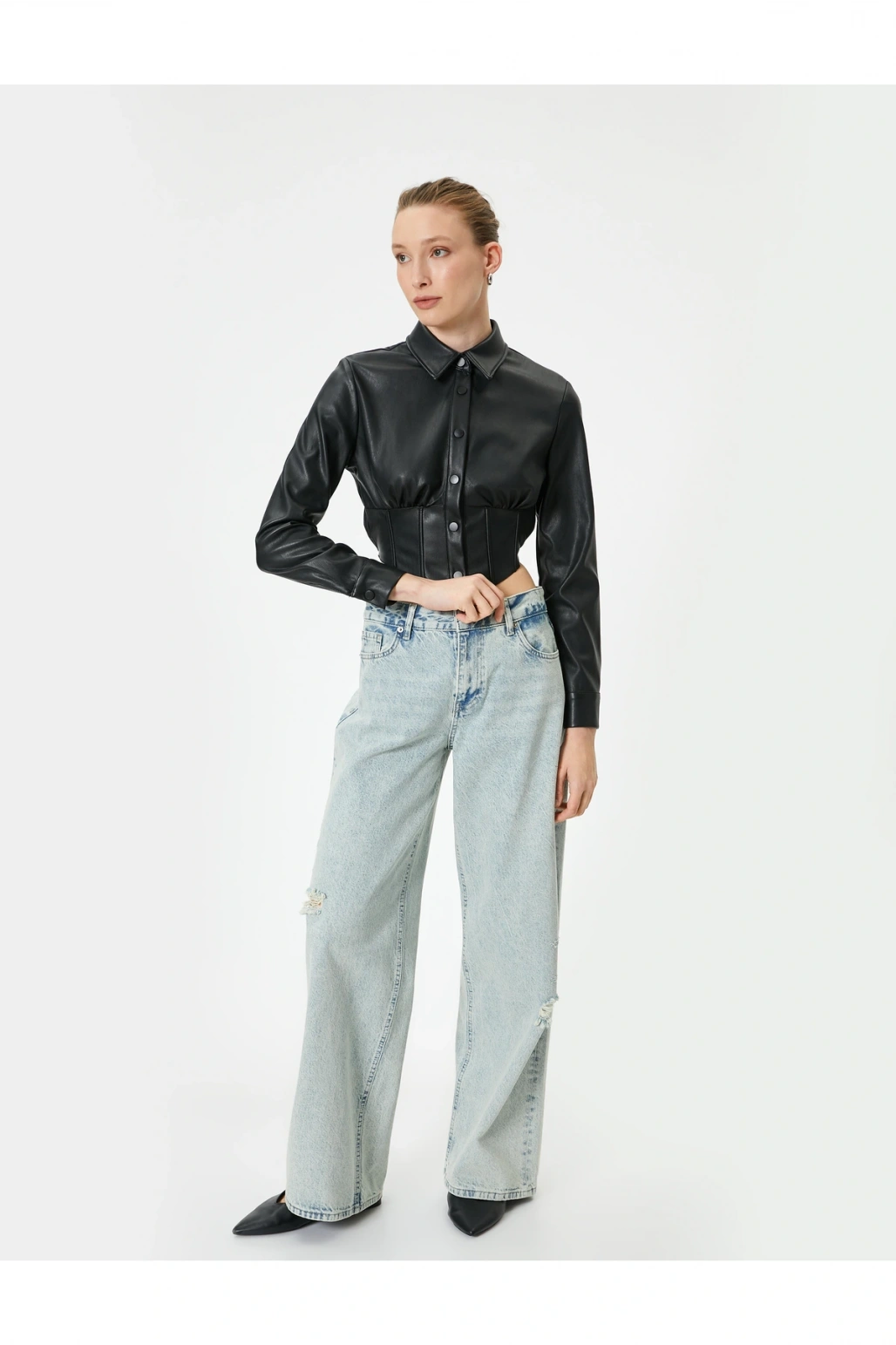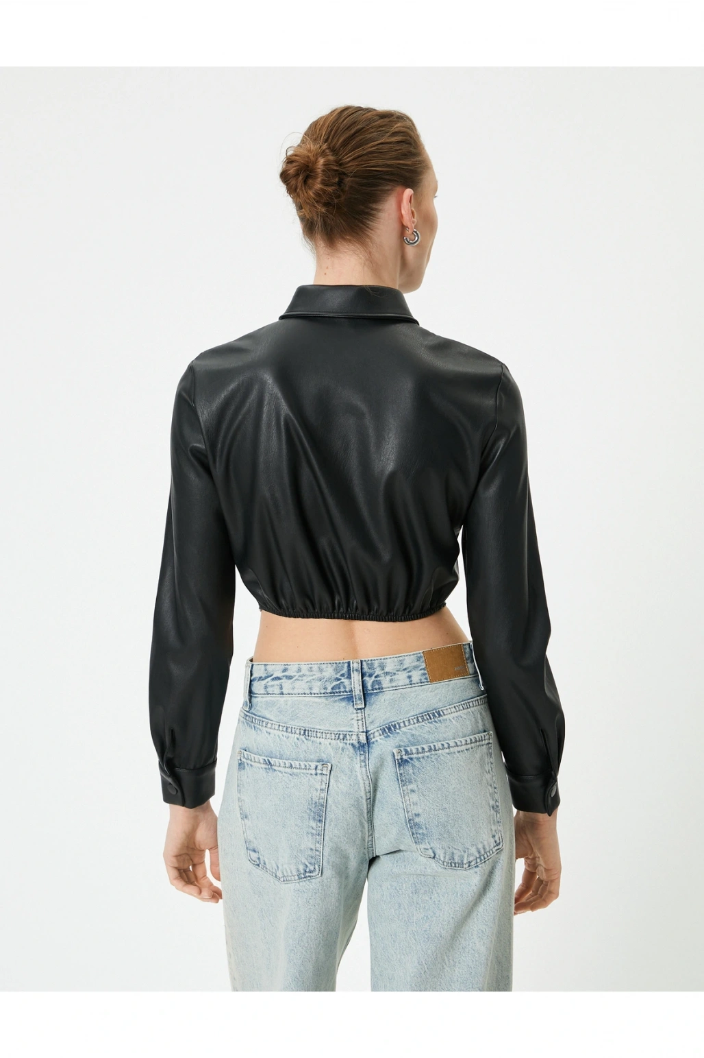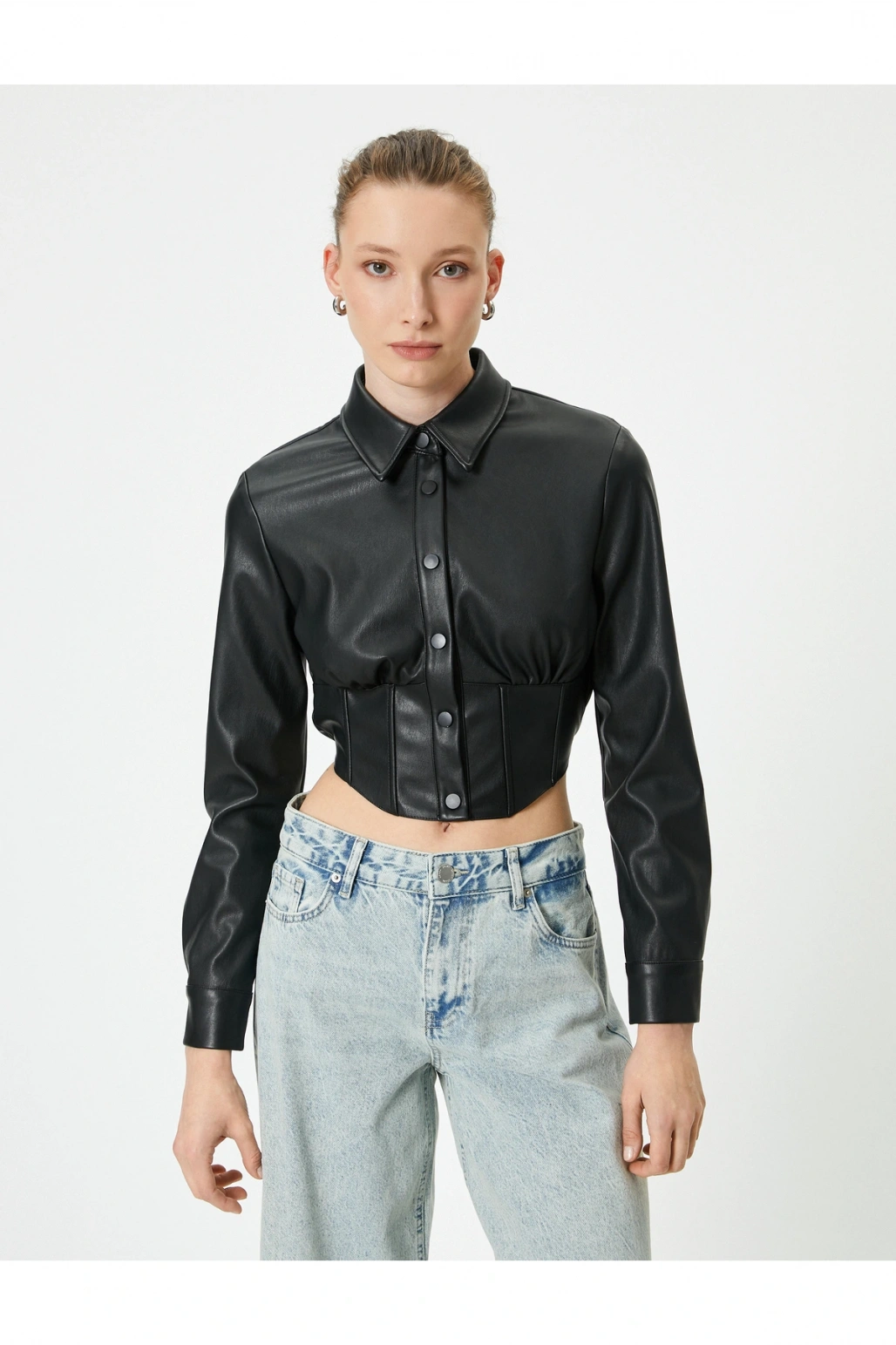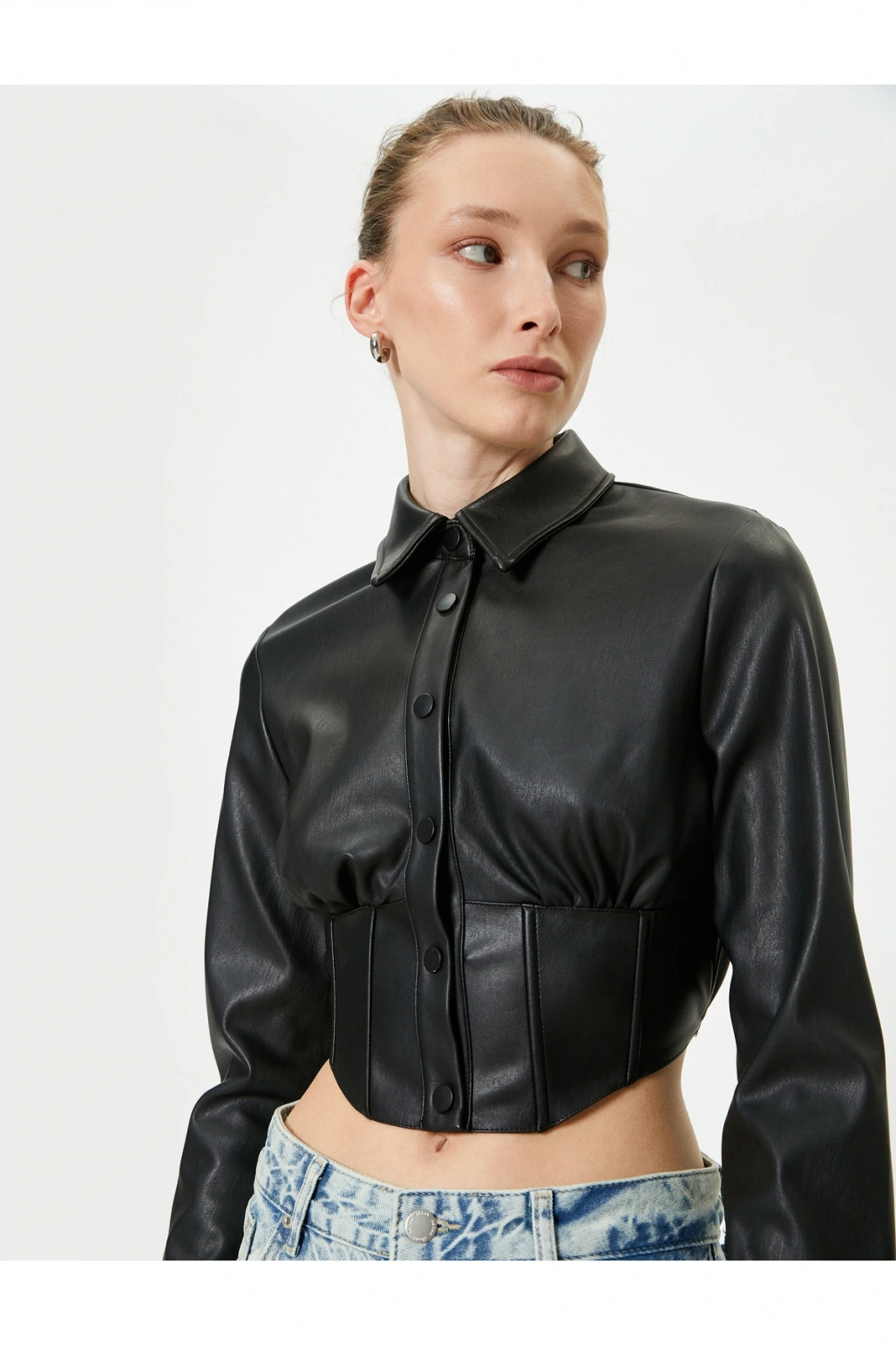 Deri Görünümlü Gömlek Crop Korse Detaylı Uzun Kollu Düğmeli Slim Fit