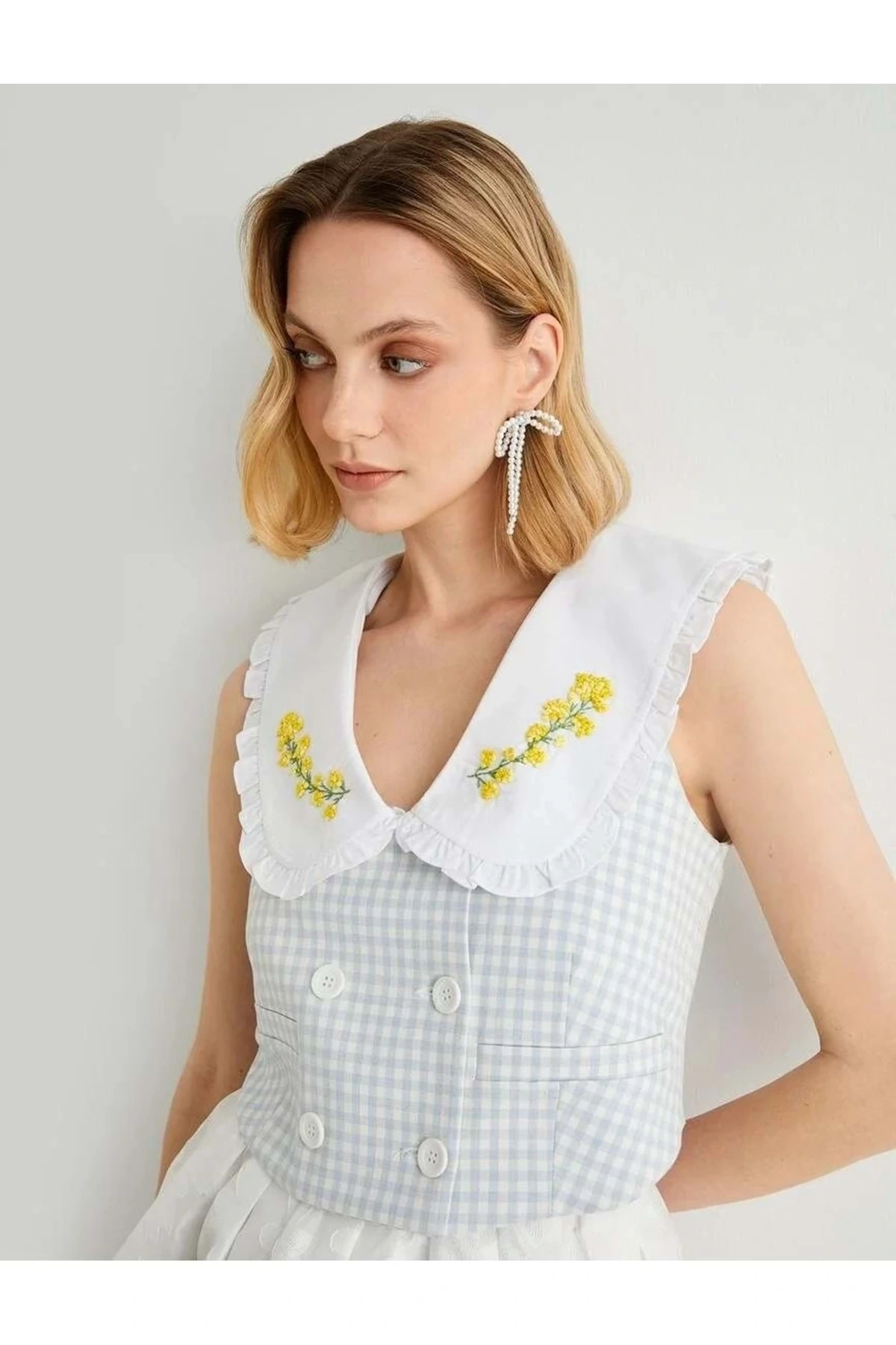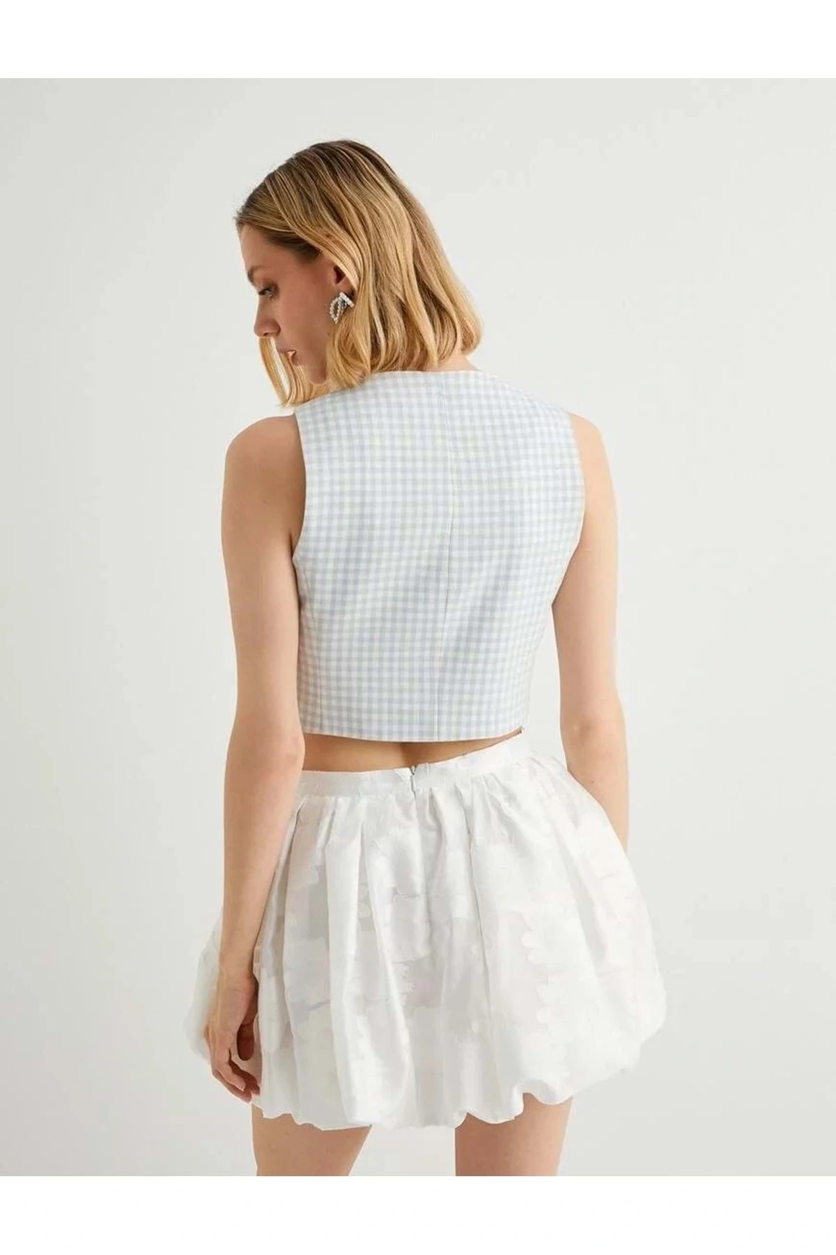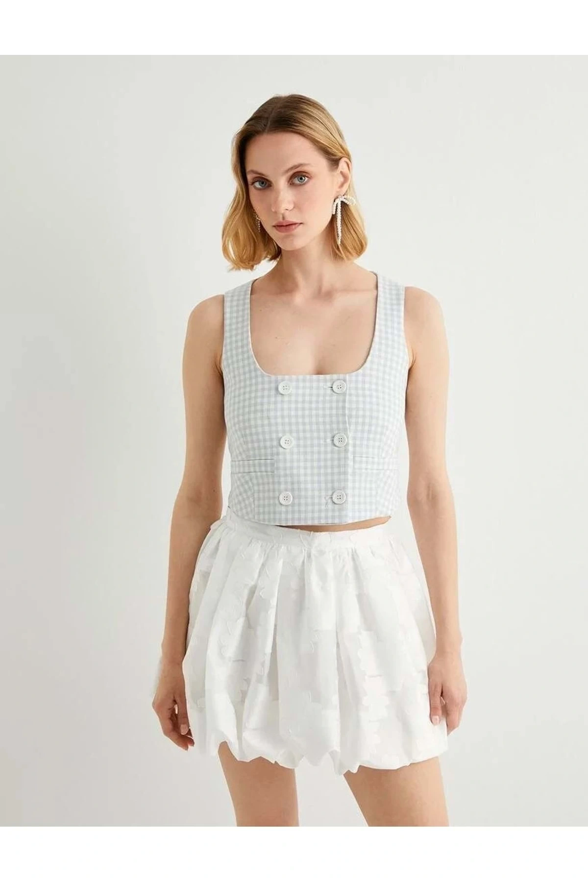 X Tuba Ünsal - Düğmeli Kruvaze Crop Yelek 4SAK20115UW Mavi Ekose