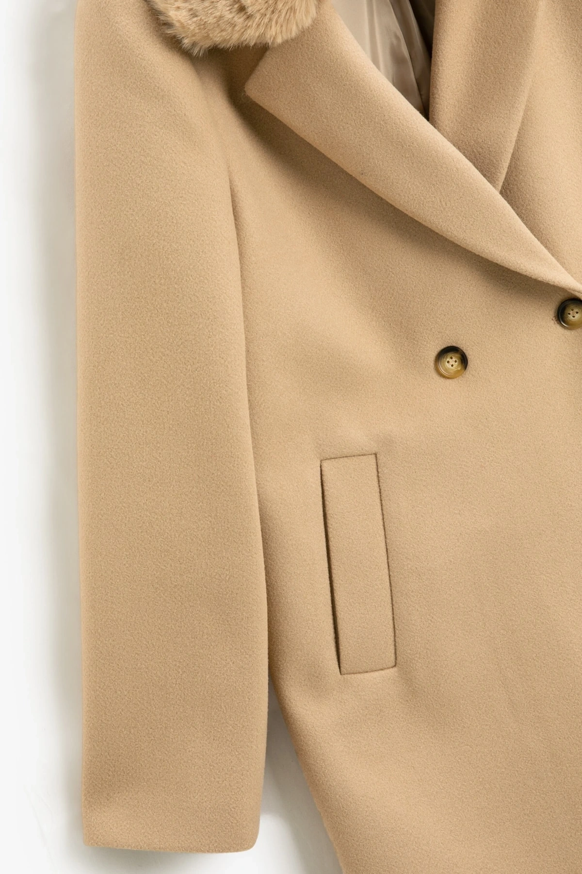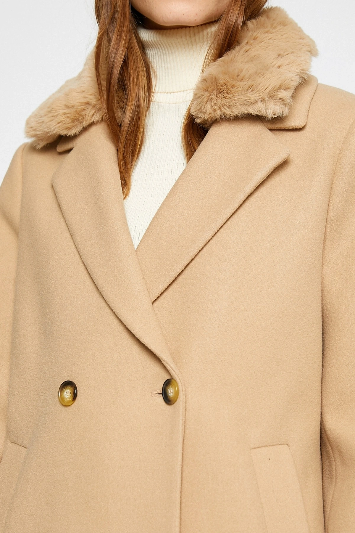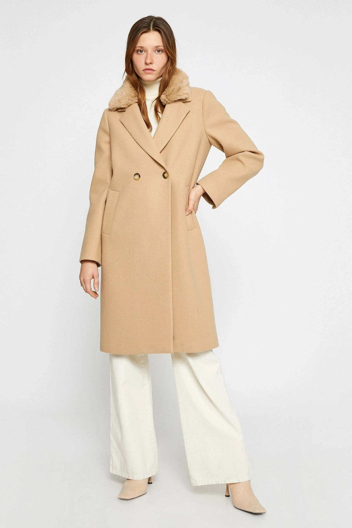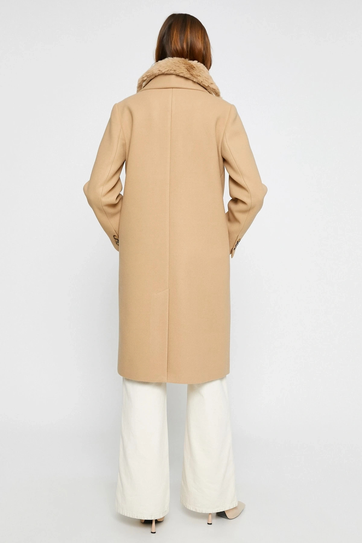 Koton X Şahika Ercümen - Suni Kürk Yaka Kaban Kaşe Kruvaze Kemerli Cepli