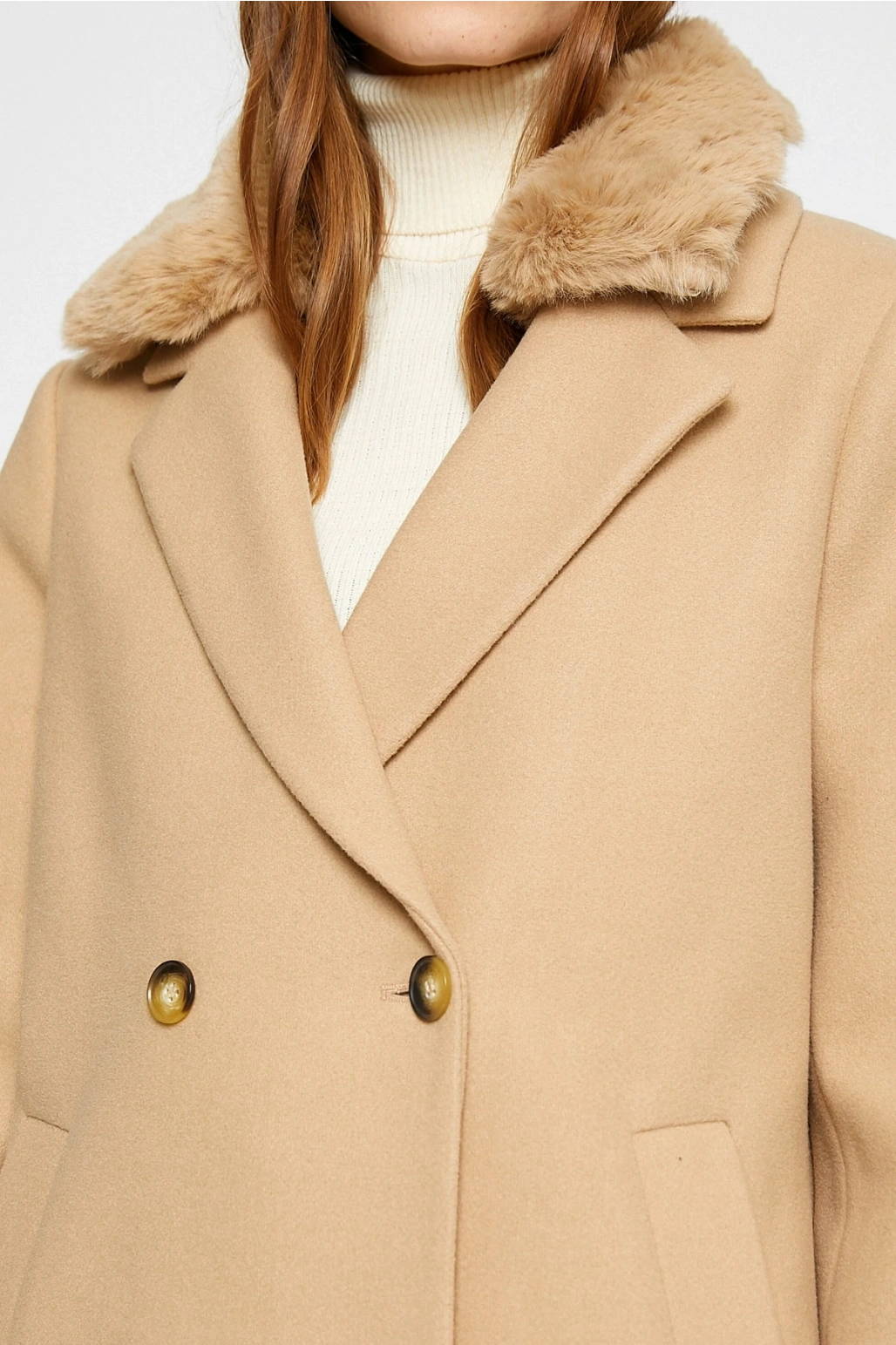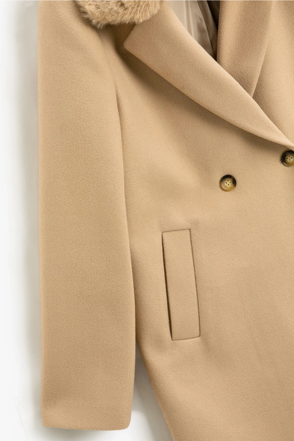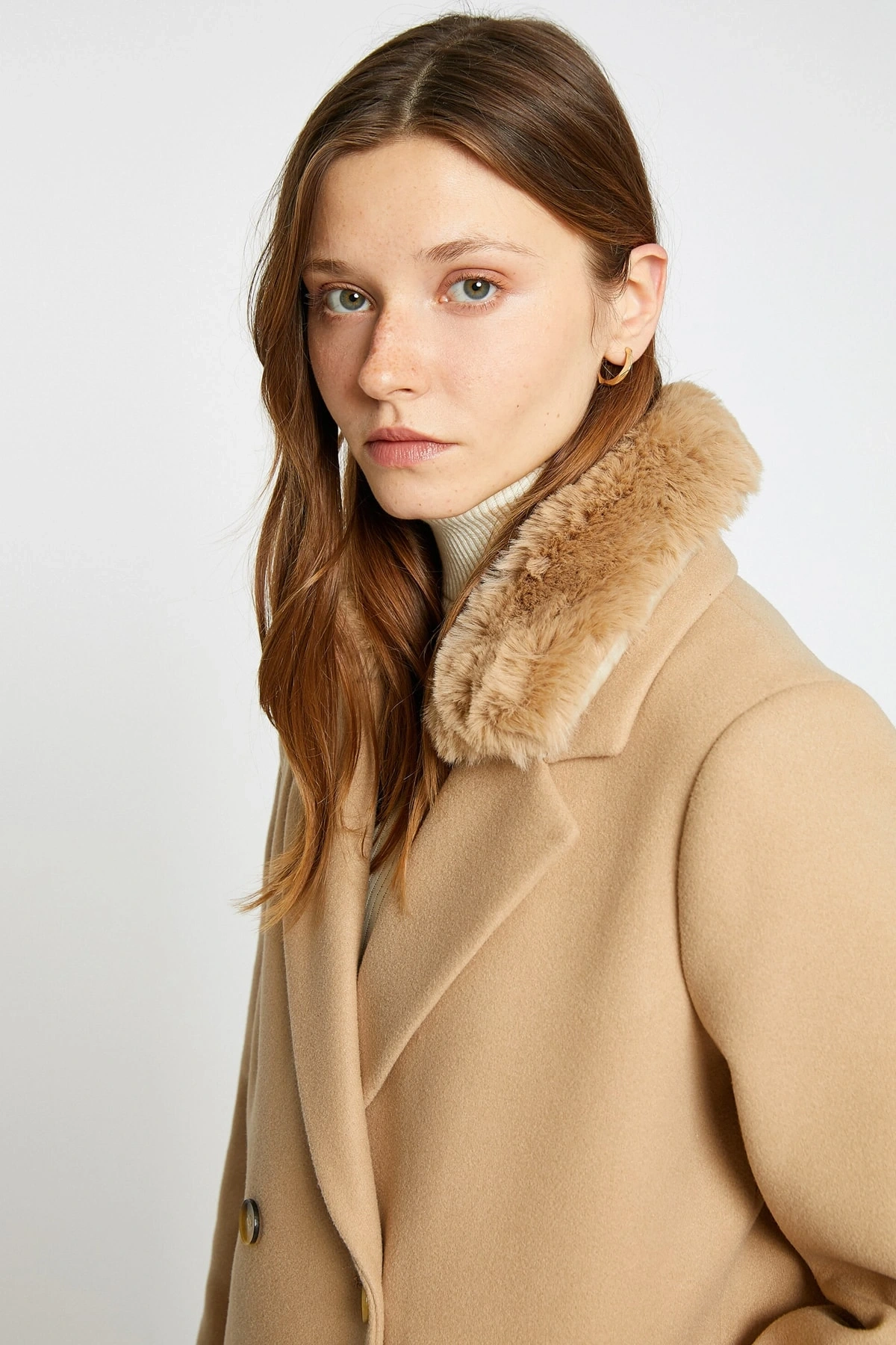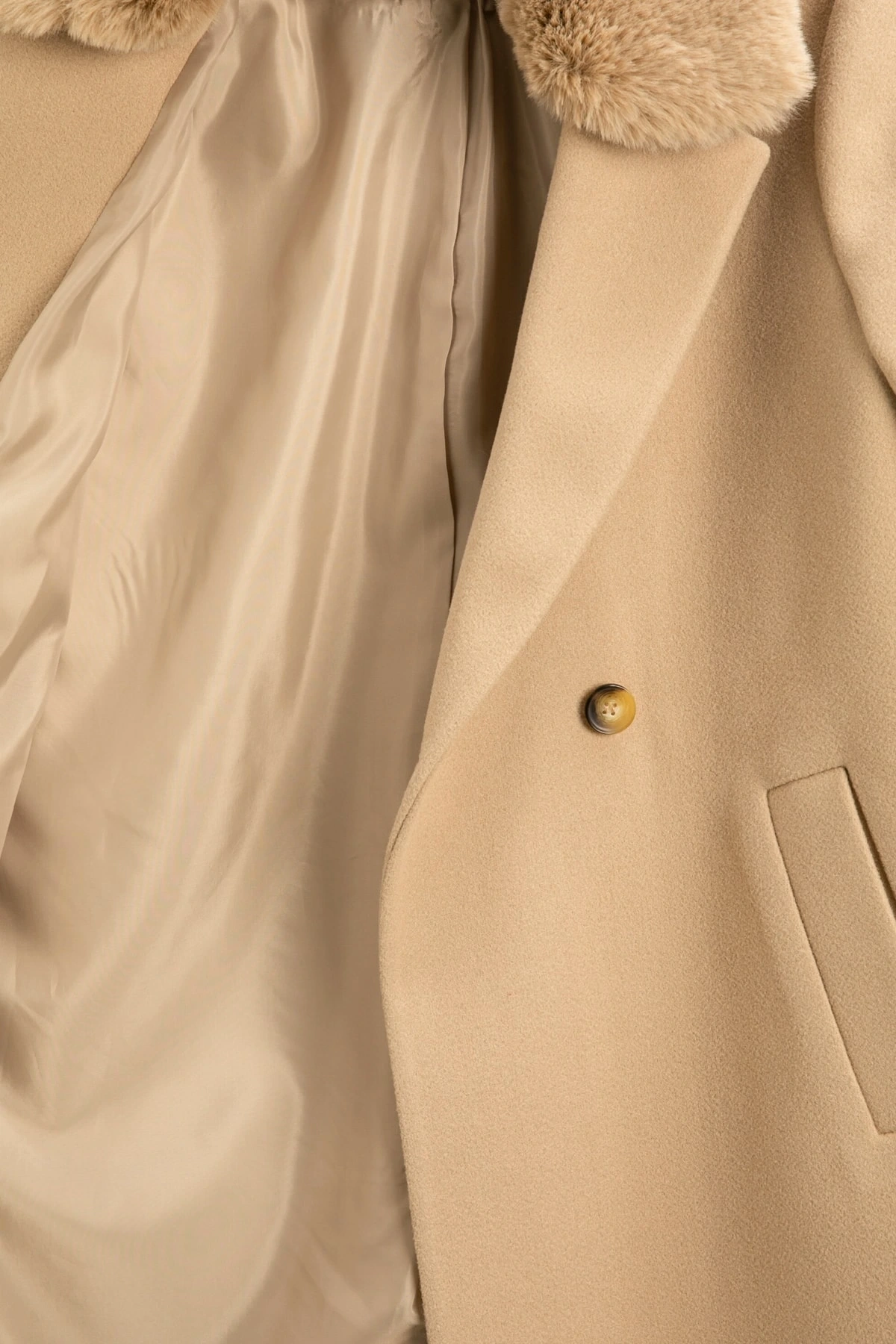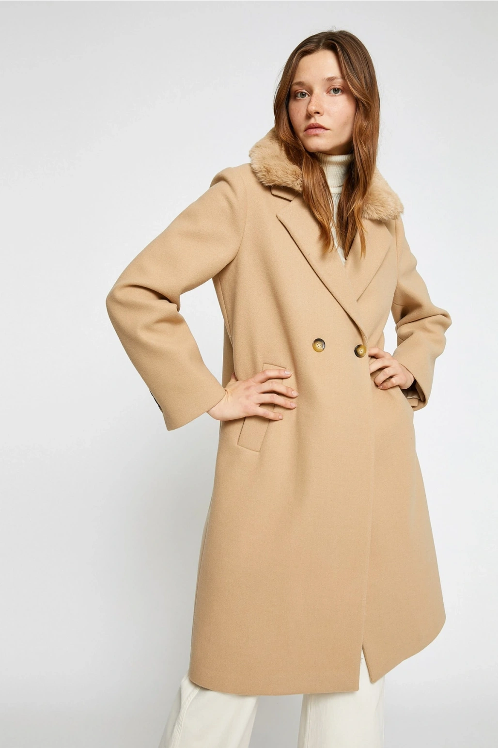 Koton X Şahika Ercümen - Suni Kürk Yaka Kaban Kaşe Kruvaze Kemerli Cepli