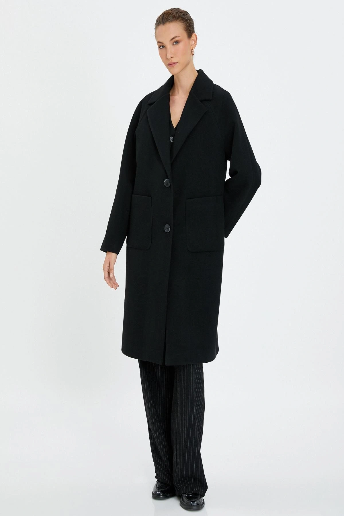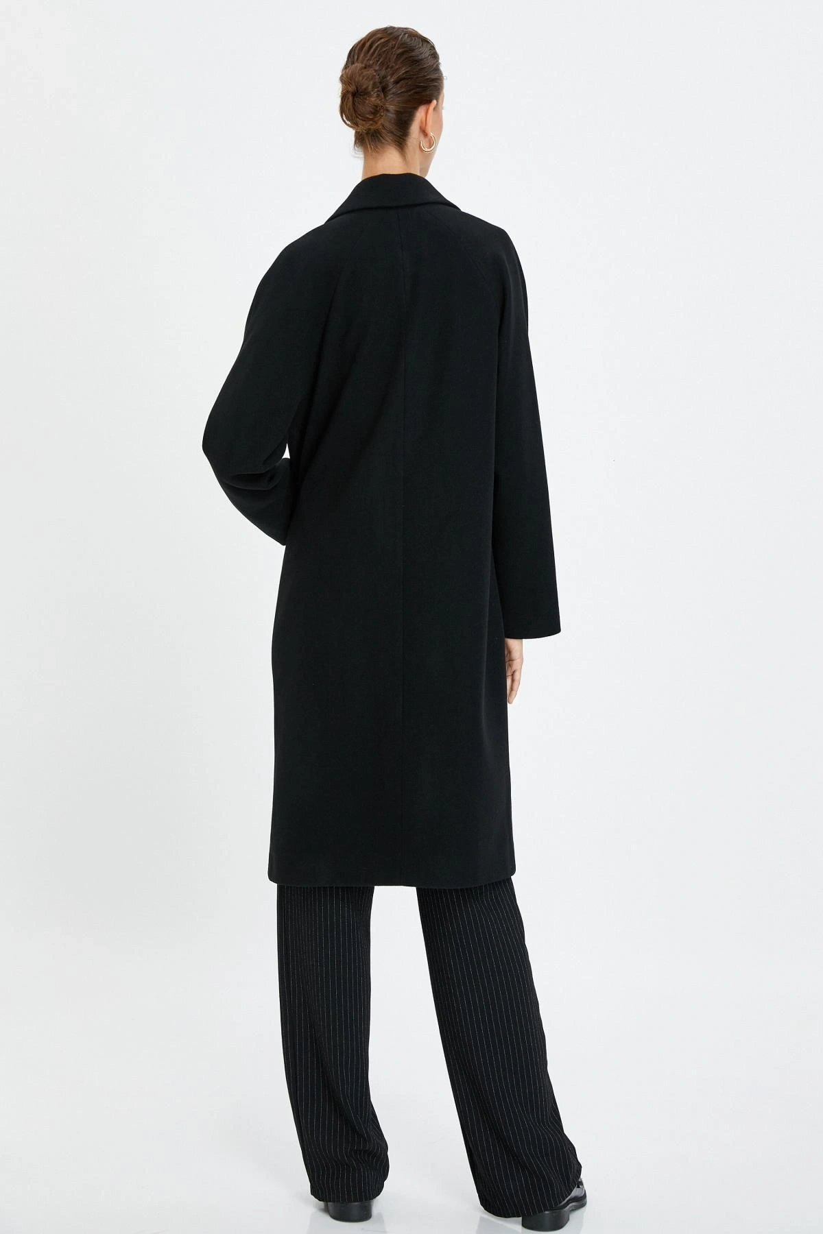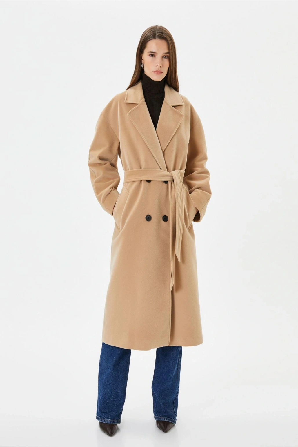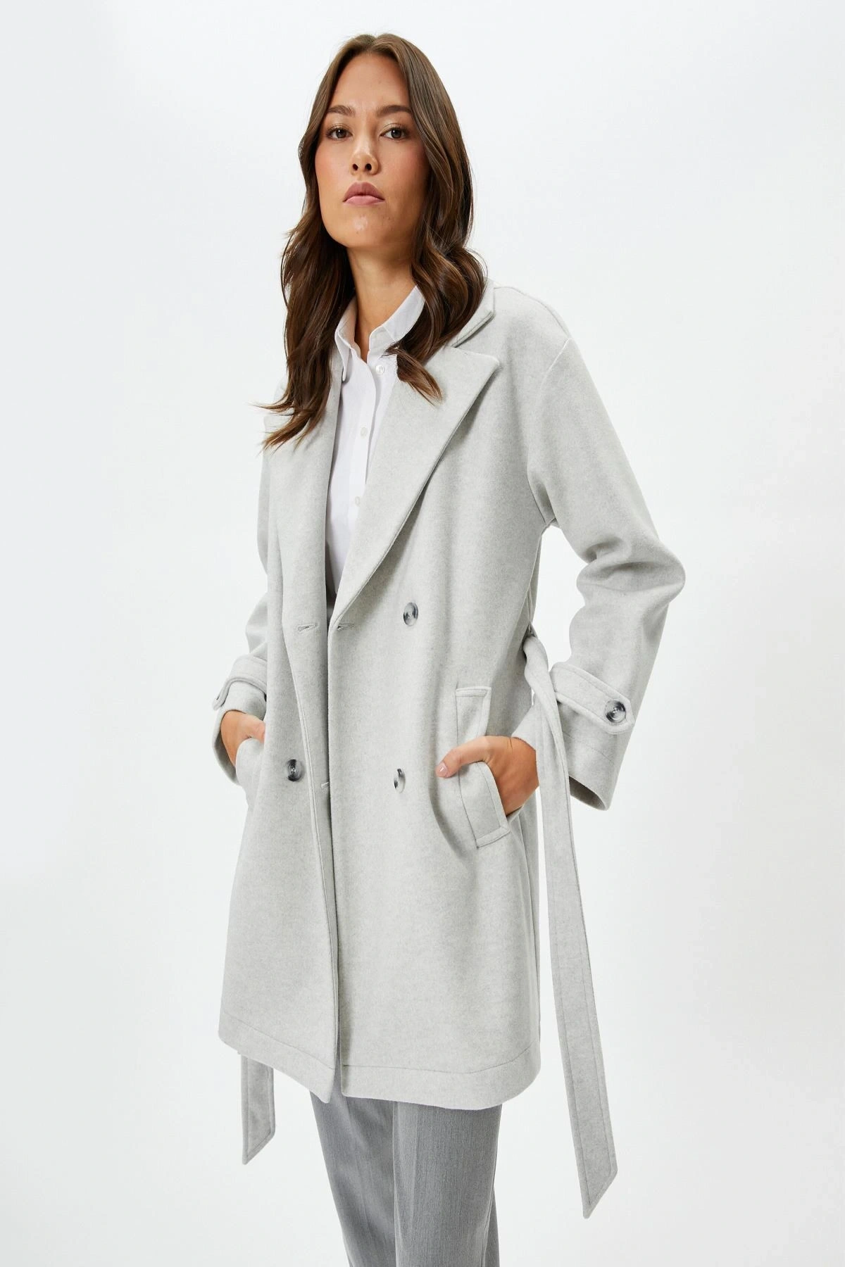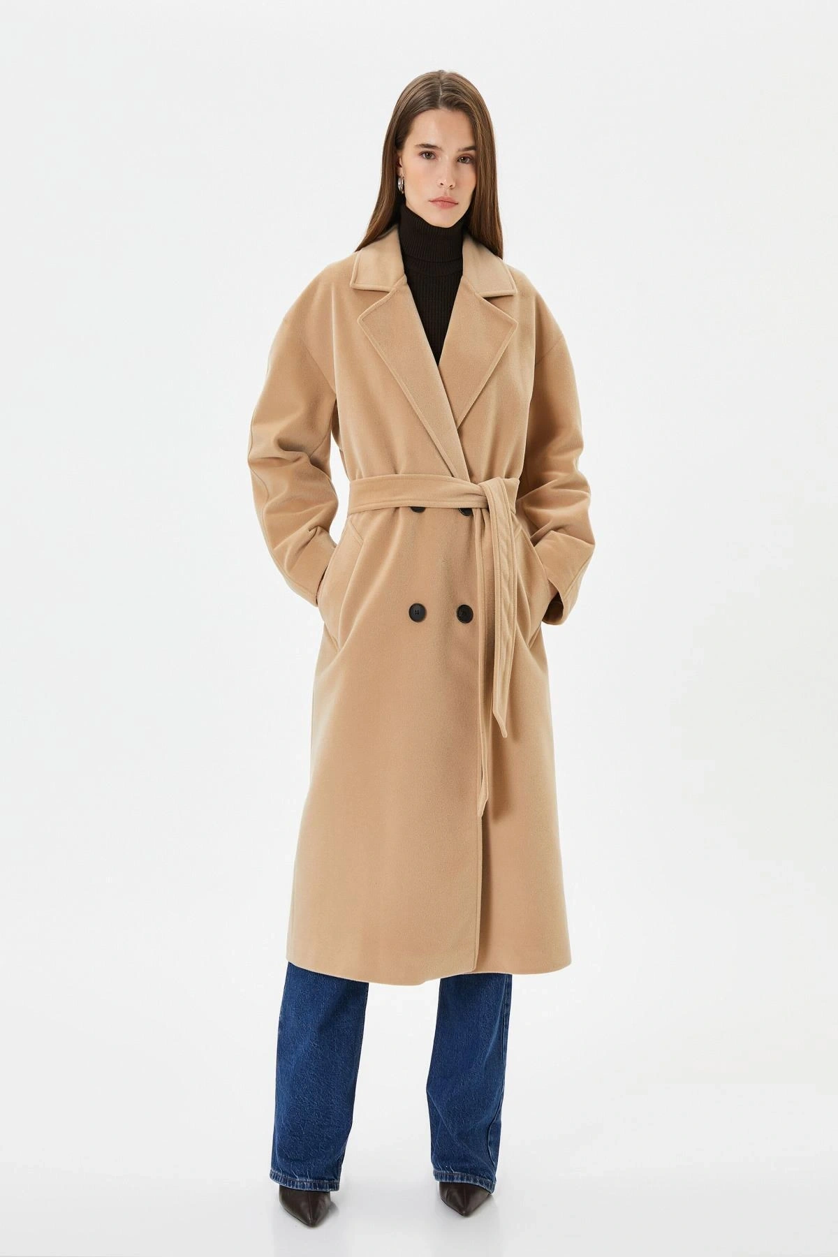 Uzun Kollu Cepli Düğmeli Kemerli Kruvaze Kaşe Kaban