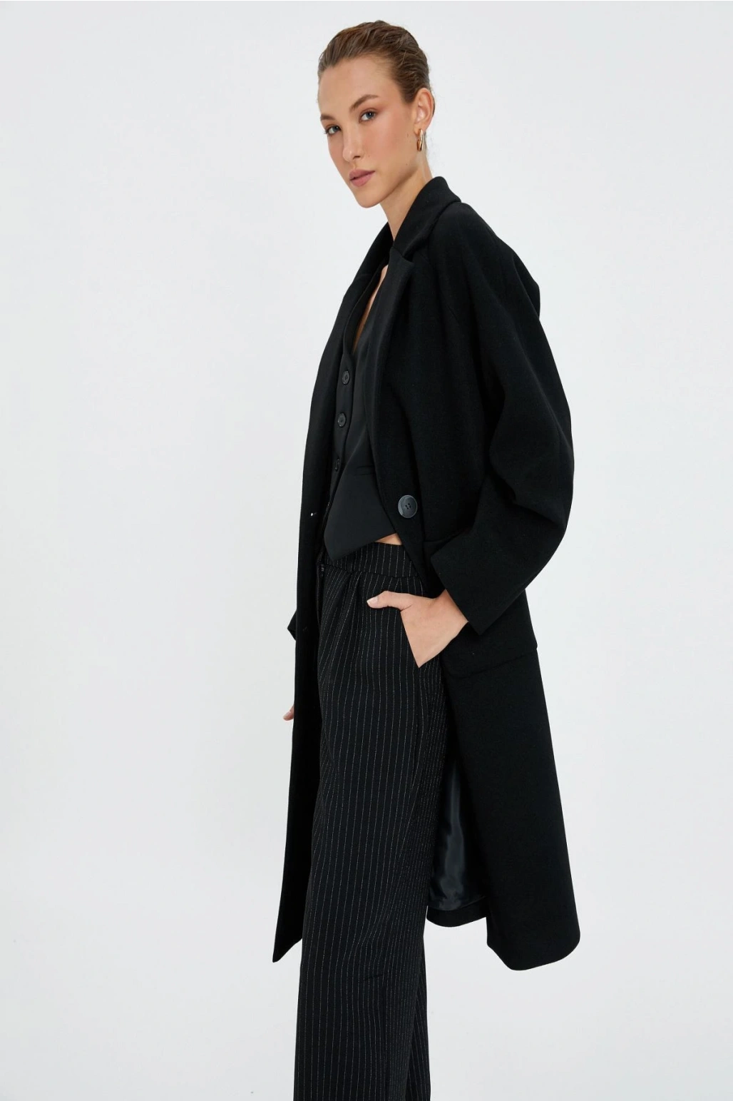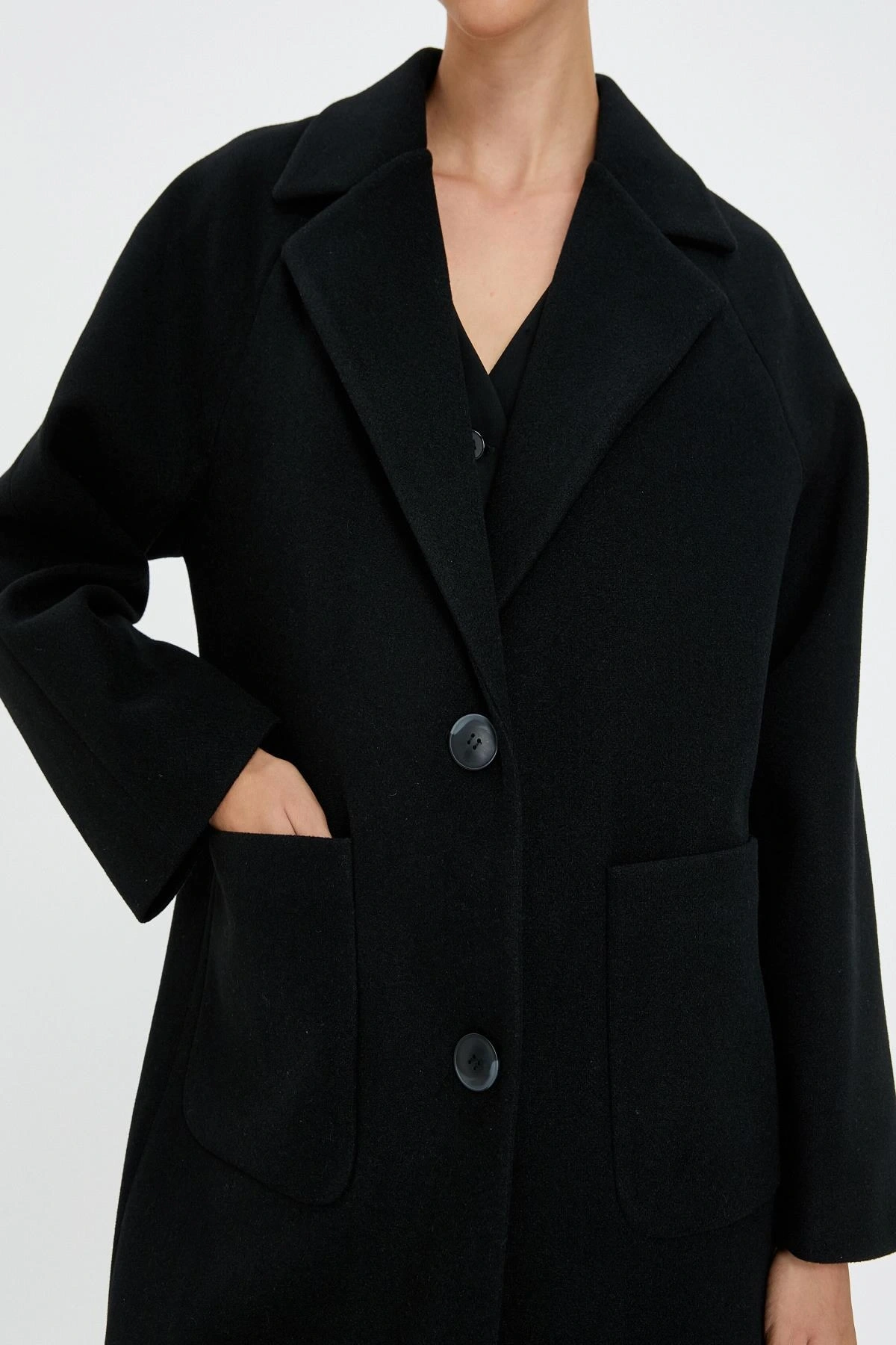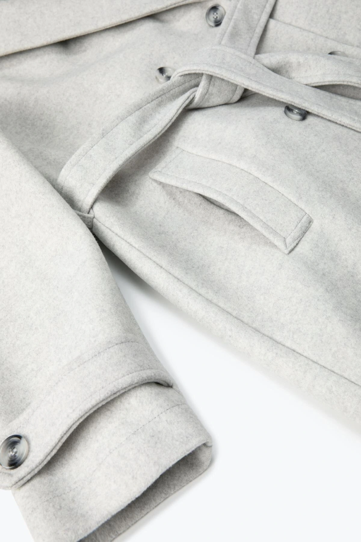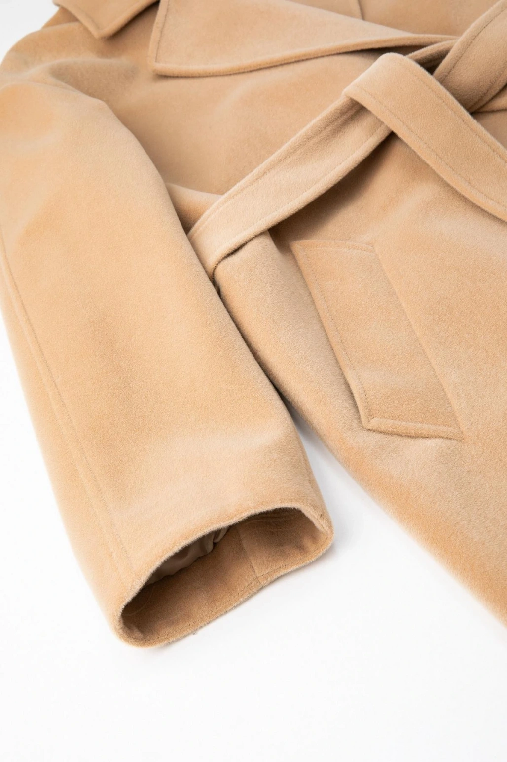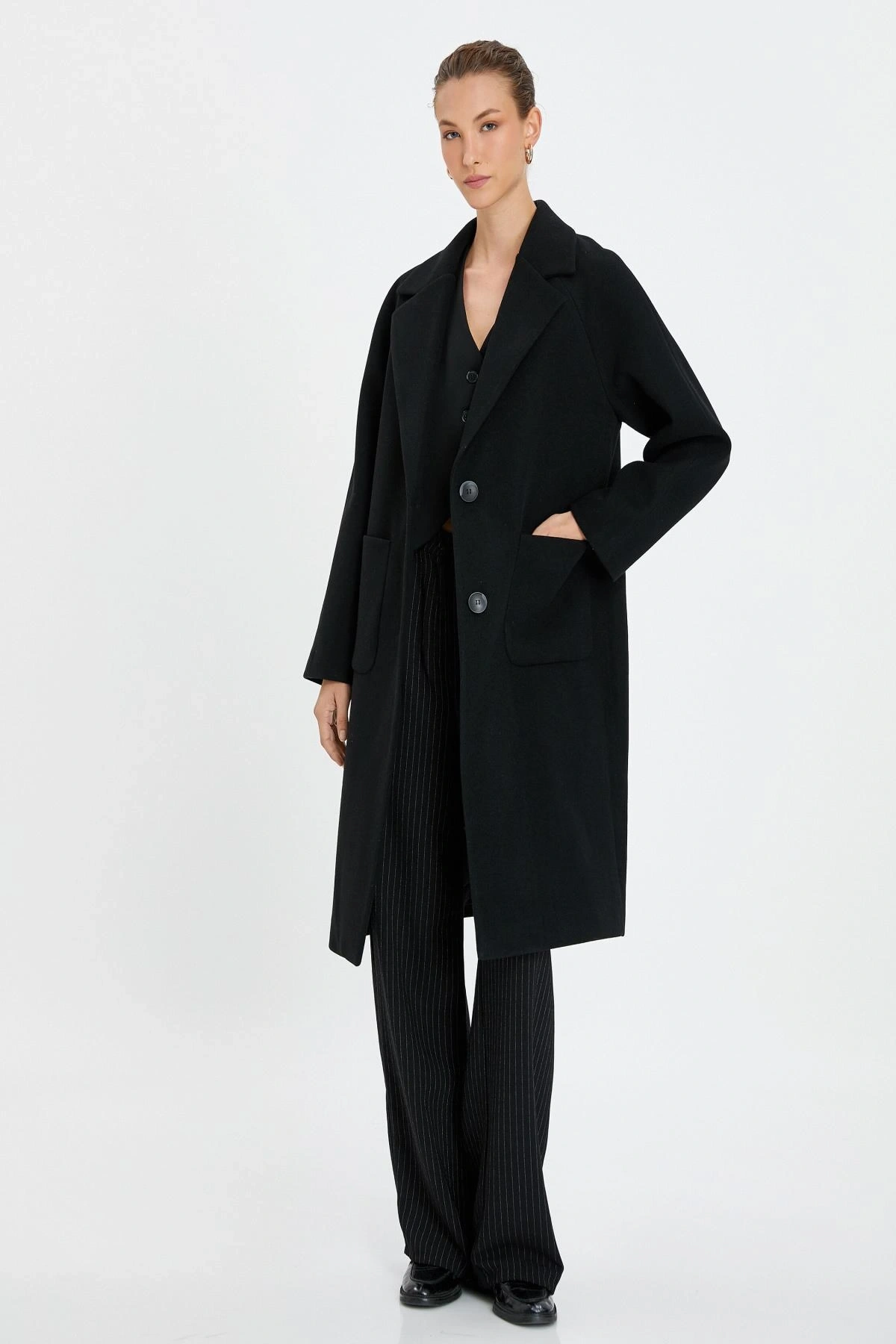 Uzun Kollu Cepli Düğmeli Kemerli Kruvaze Kaşe Kaban