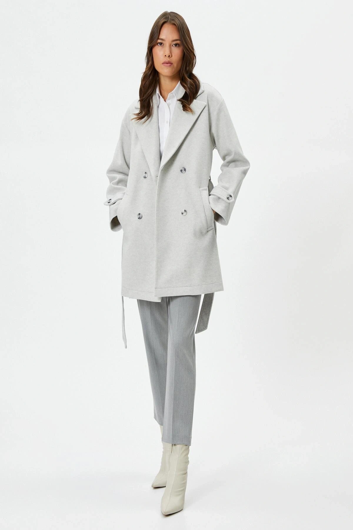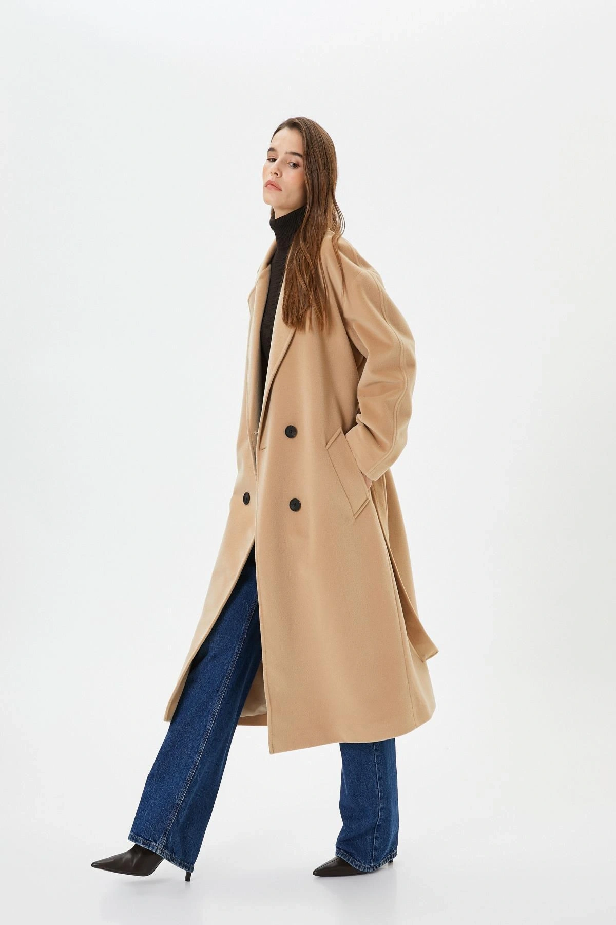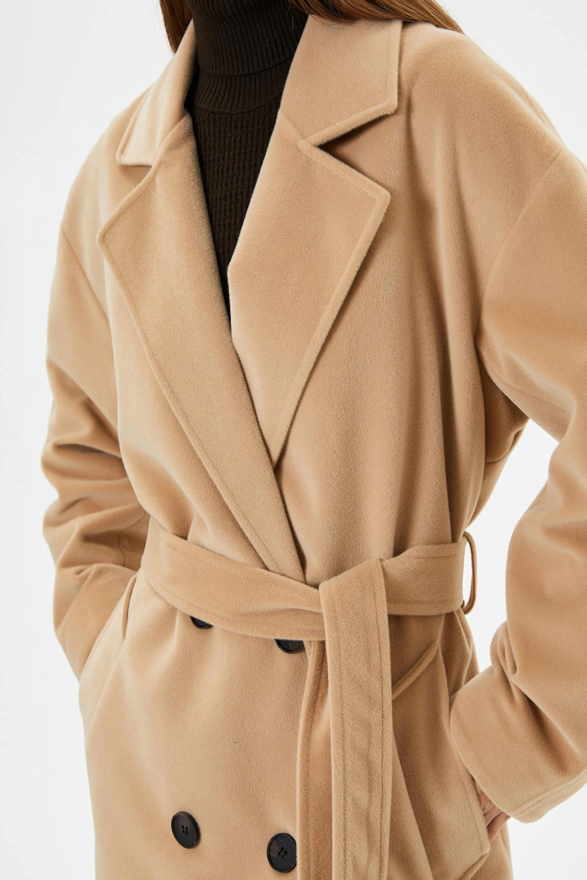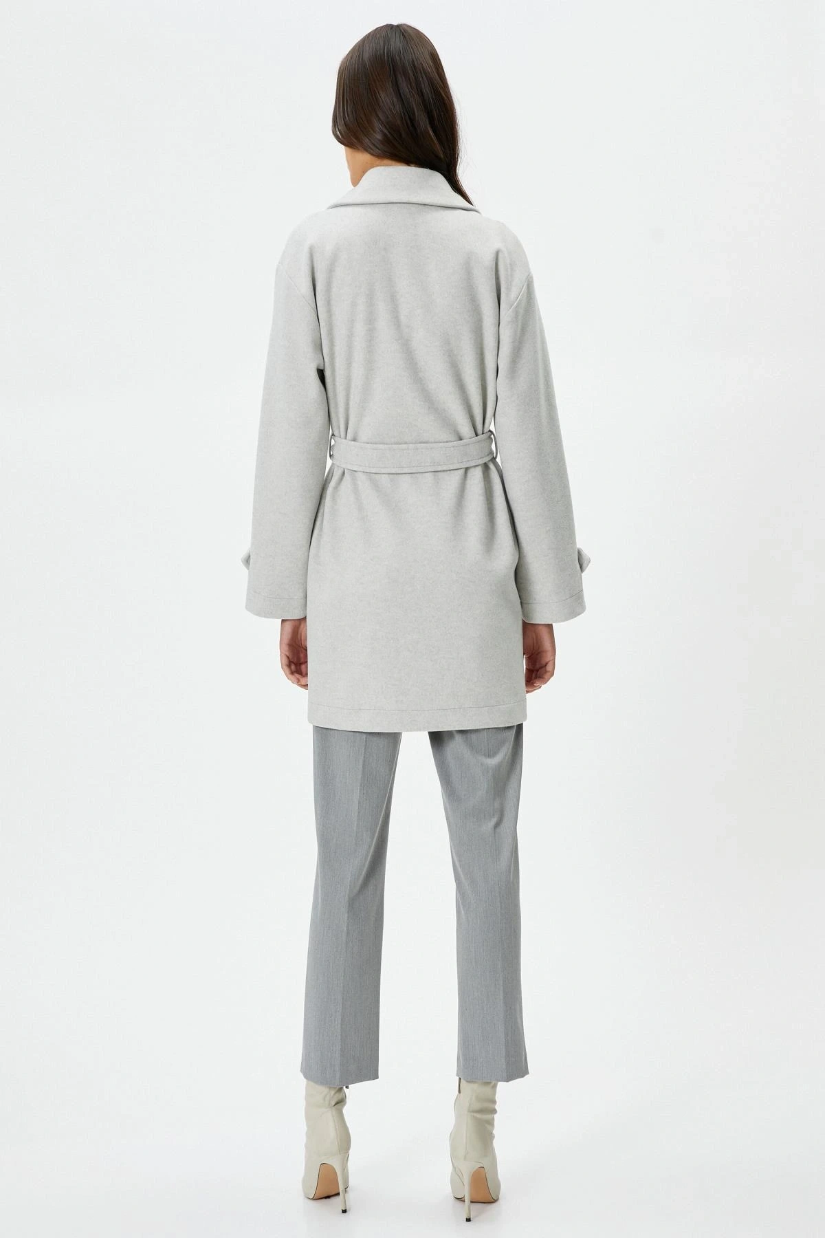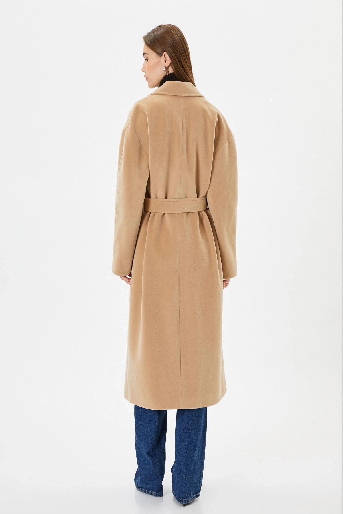 Koton Uzun Kollu Kruvaze Kemerli Uzun Kaşe Kaban