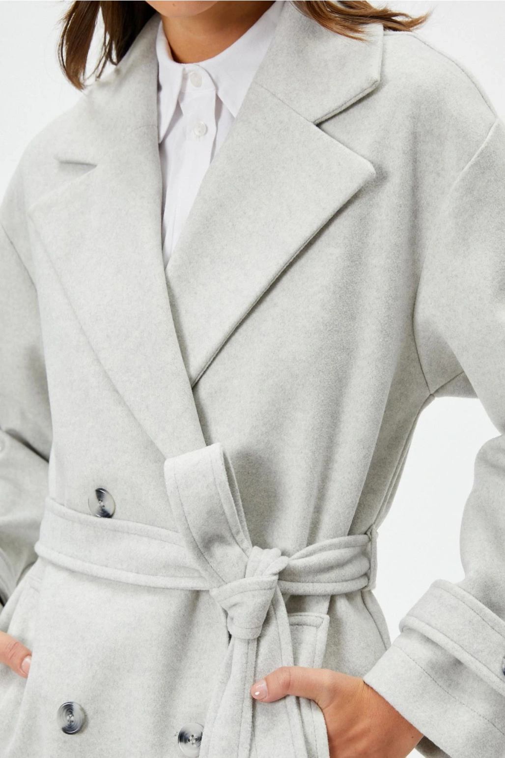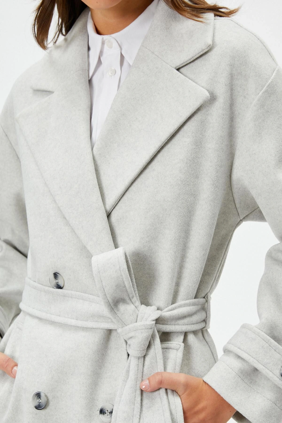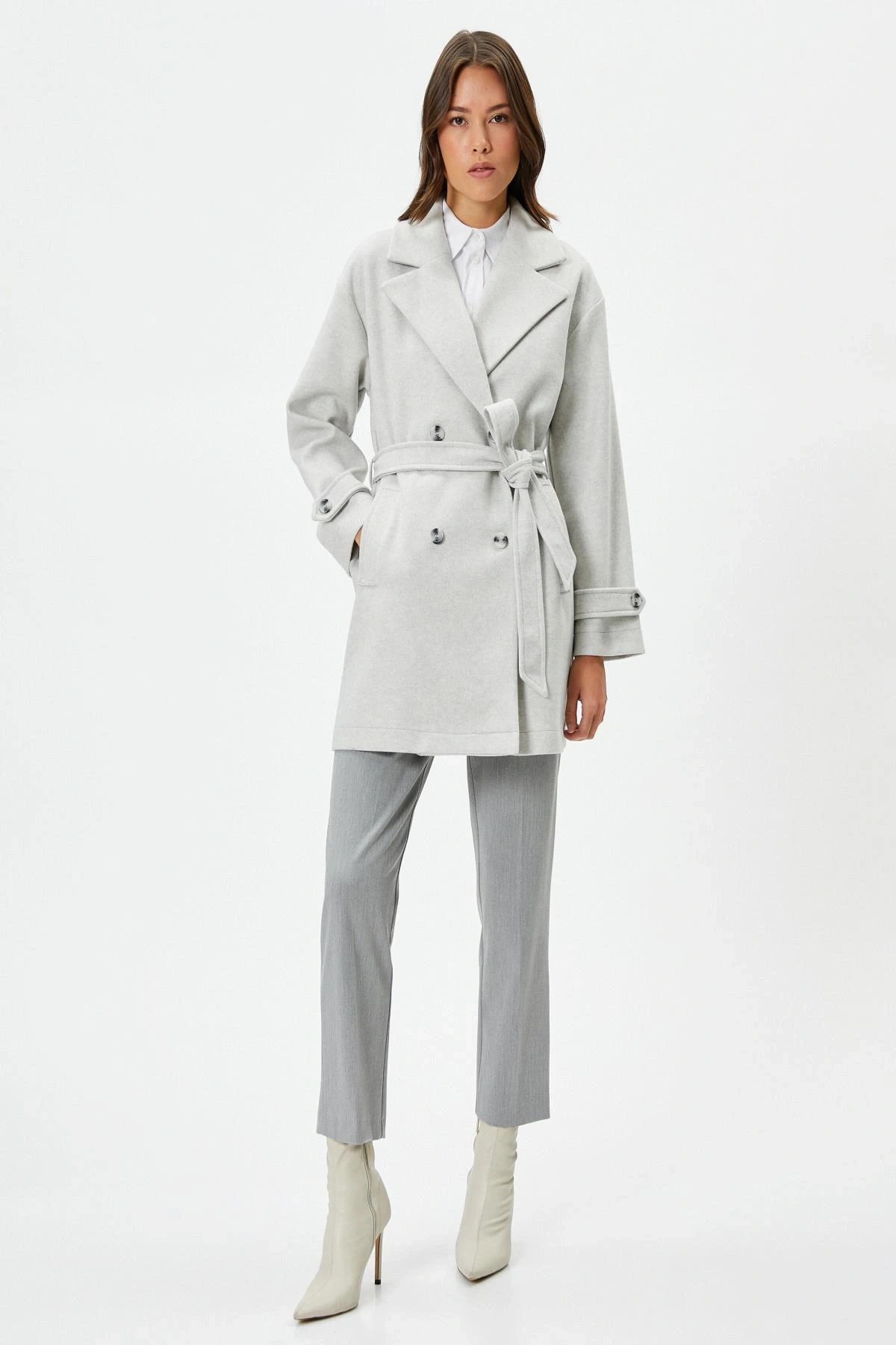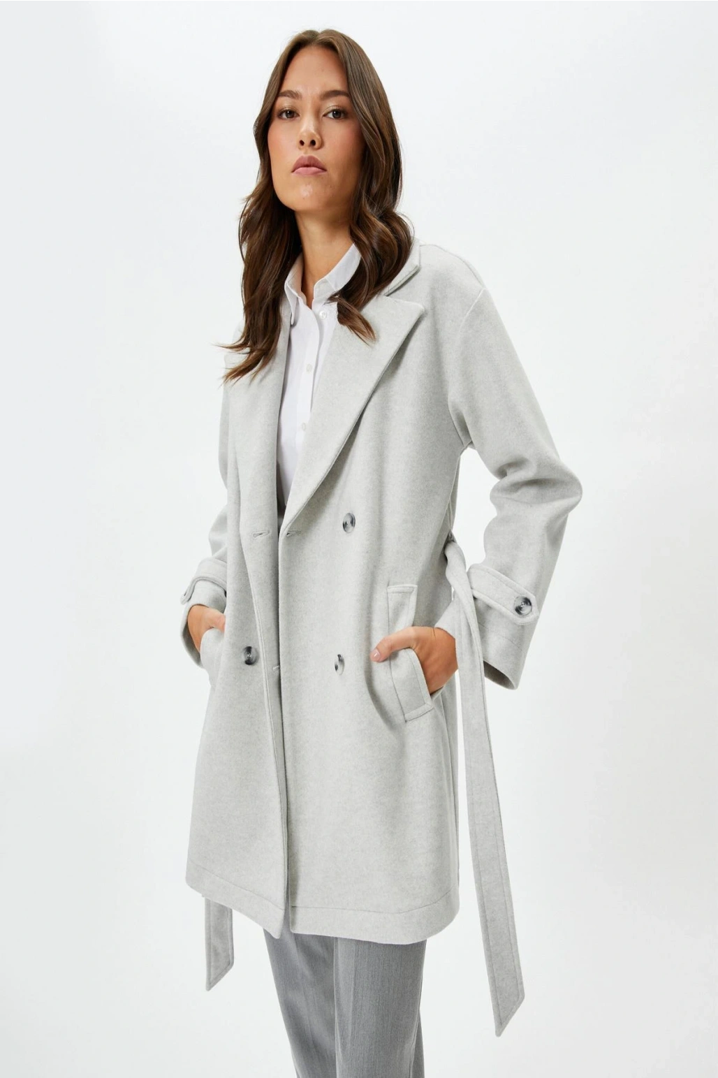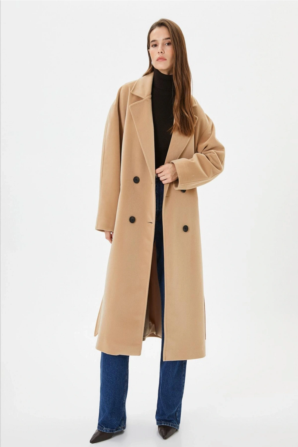 Koton Uzun Kollu Kruvaze Kemerli Uzun Kaşe Kaban