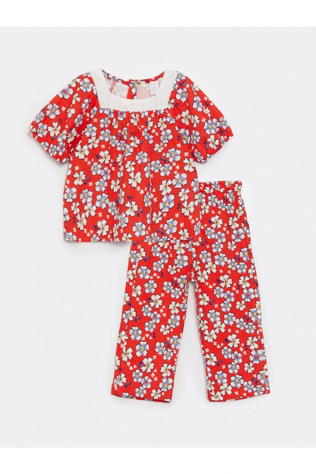Kare yaka bluz ve beli lastikli pantolondan oluşan 2’li takım nefes alan pamuk karışımlı esnek kumaşıyla terlemeyi önler, nefes alır ve sıcak havalarda konfor sağlar. Bluz modelinin yakasındaki nakış detaylar zarif ve şık görünümü destekler.