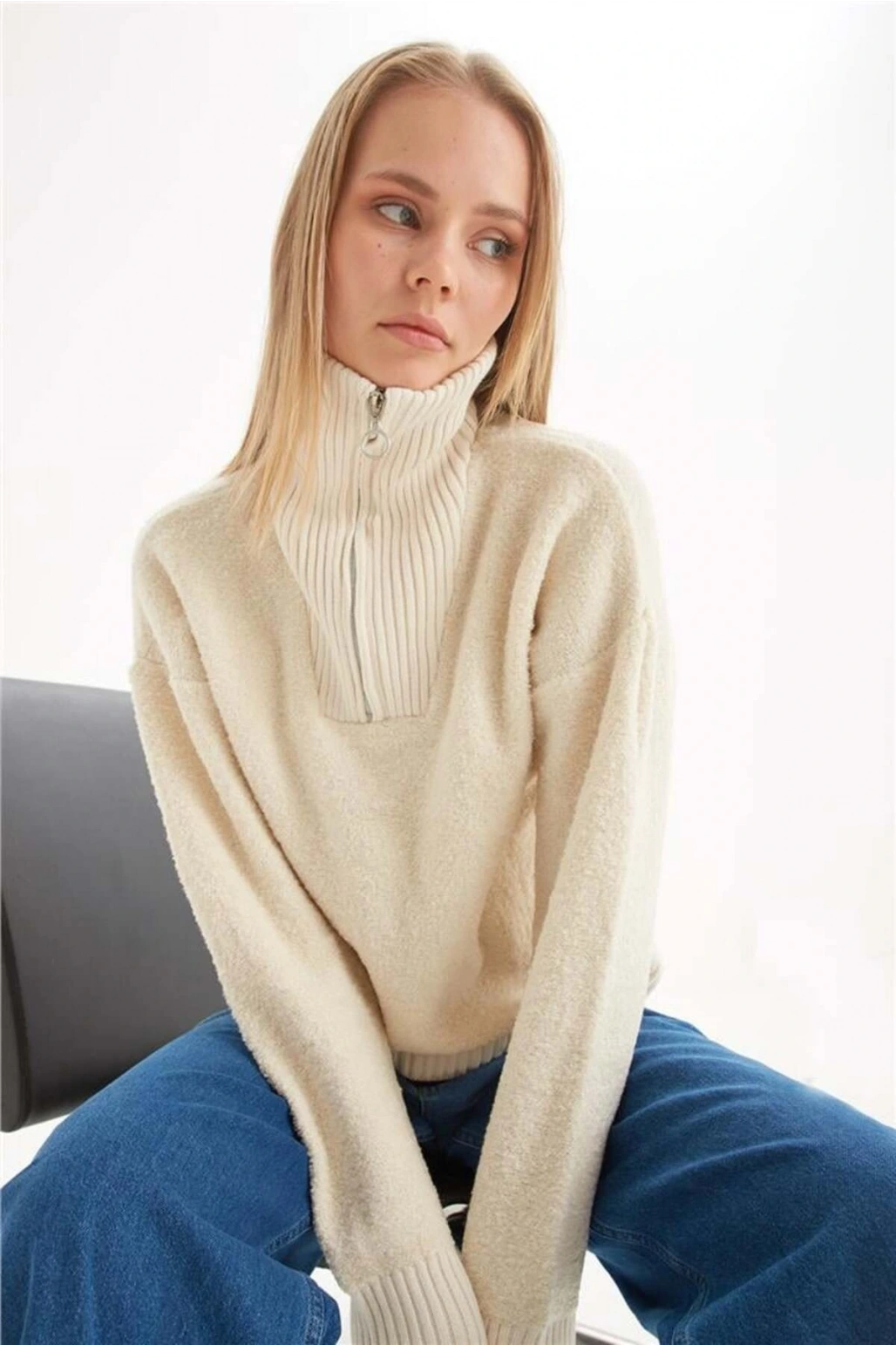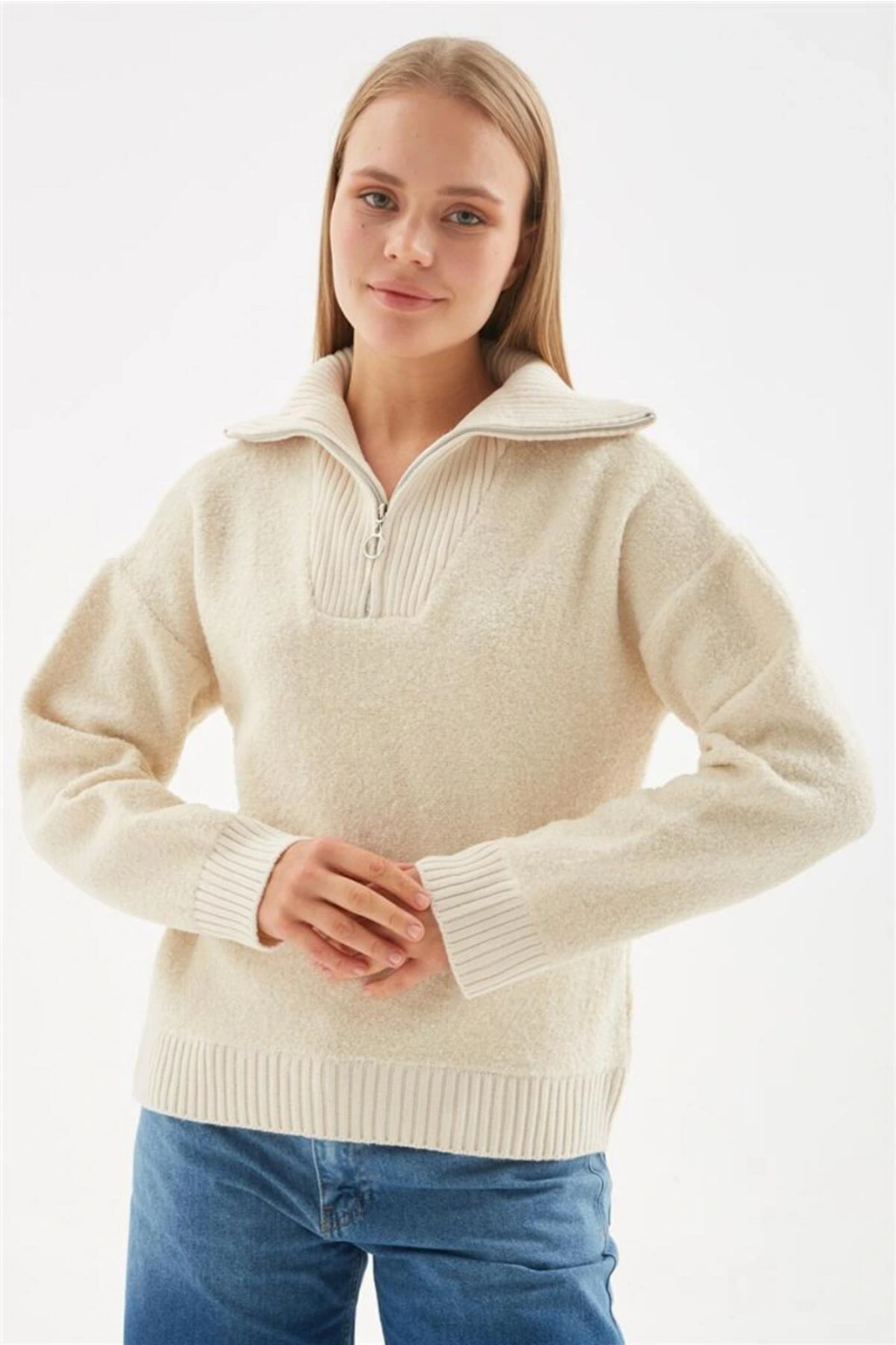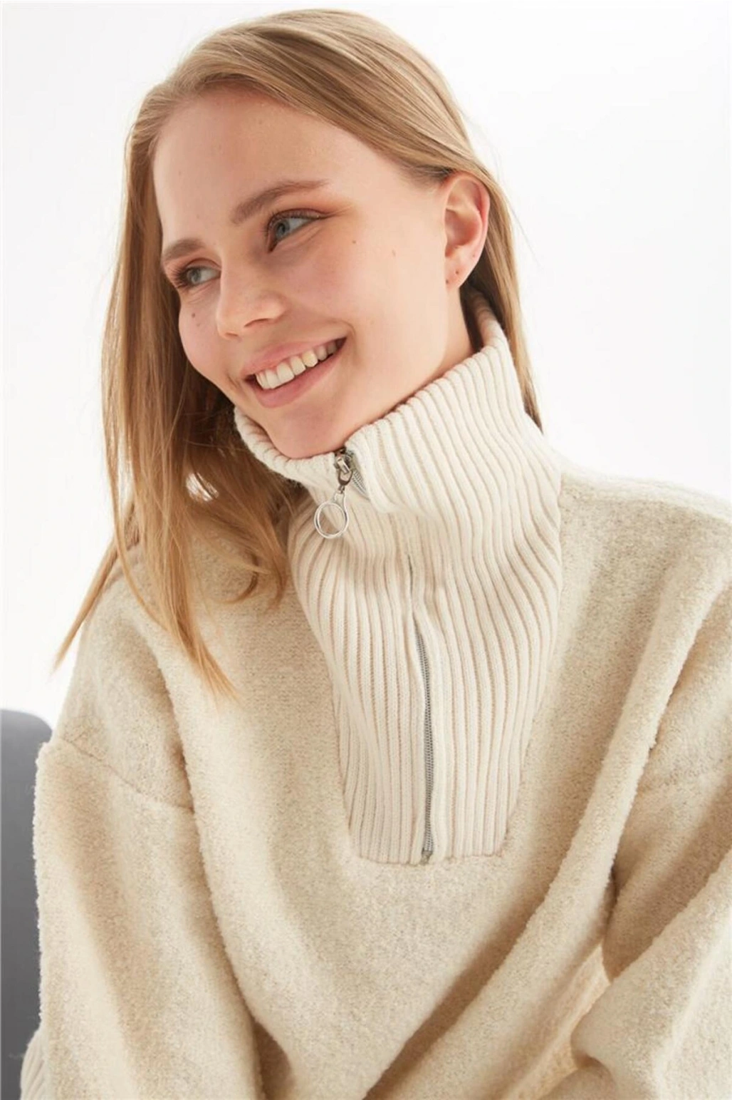 Yakası Fermuarlı Sweat Bej